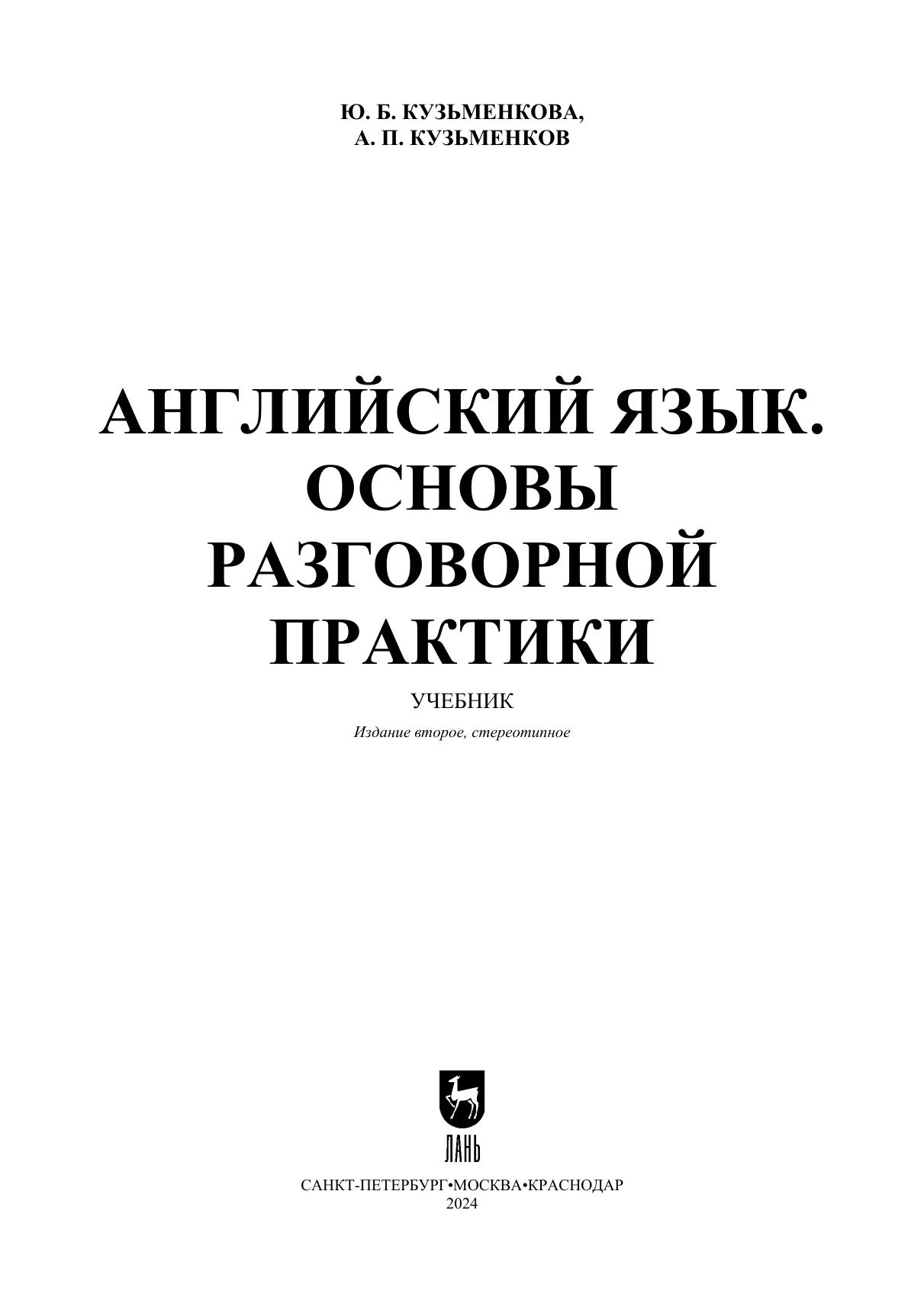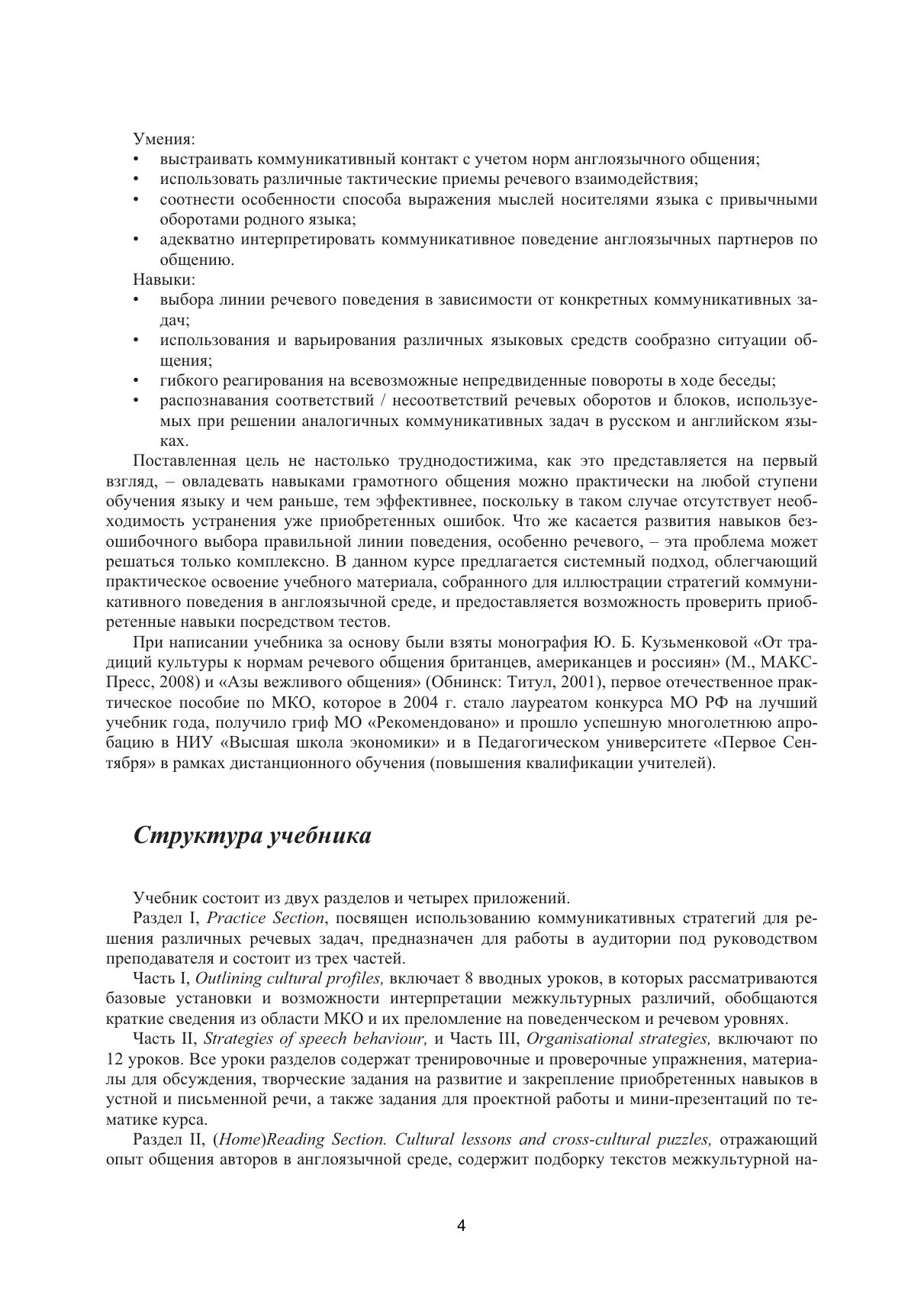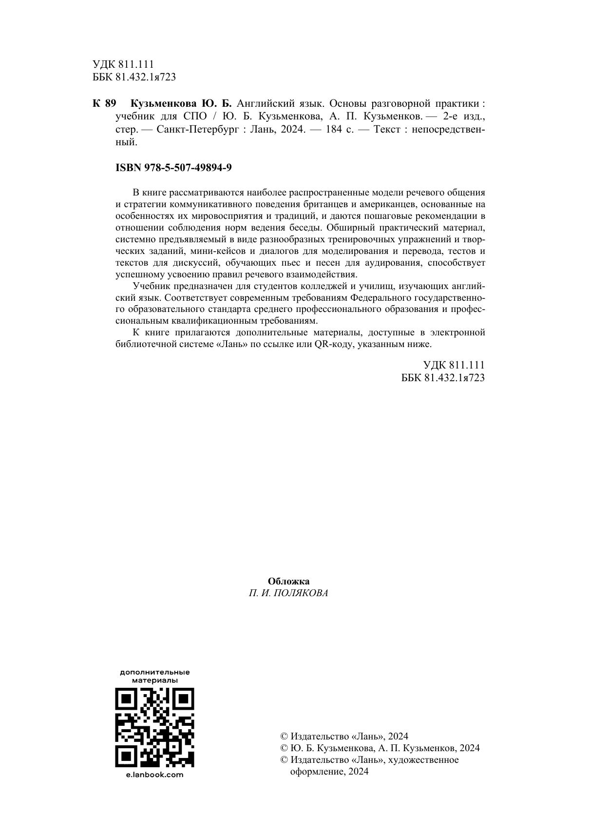 В книге рассматриваются наиболее распространенные модели речевого общения и стратегии коммуникативного поведения британцев и американцев, основанные на особенностях их мировосприятия и традиций, и даются пошаговые рекомендации в отношении соблюдения норм ведения беседы. Обширный практический материал, системно предъявляемый в виде разнообразных тренировочных упражнений и творческих заданий, мини-кейсов и диалогов для моделирования и перевода, тестов и текстов для дискуссий, обучающих пьес и песен для аудирования, способствует успешному усвоению правил речевого взаимодействия. Соответствует современным требованиям Федерального государственного образовательного стандарта среднего профессионального образования и профессиональным квалификационным требованиям. Учебник предназначен для студентов колледжей и училищ, изучающих английский язык. К книге прилагаются дополнительные материалы, доступные в электронной библиотечной системе «Лань» по ссылке или QR-коду, указанным ниже.