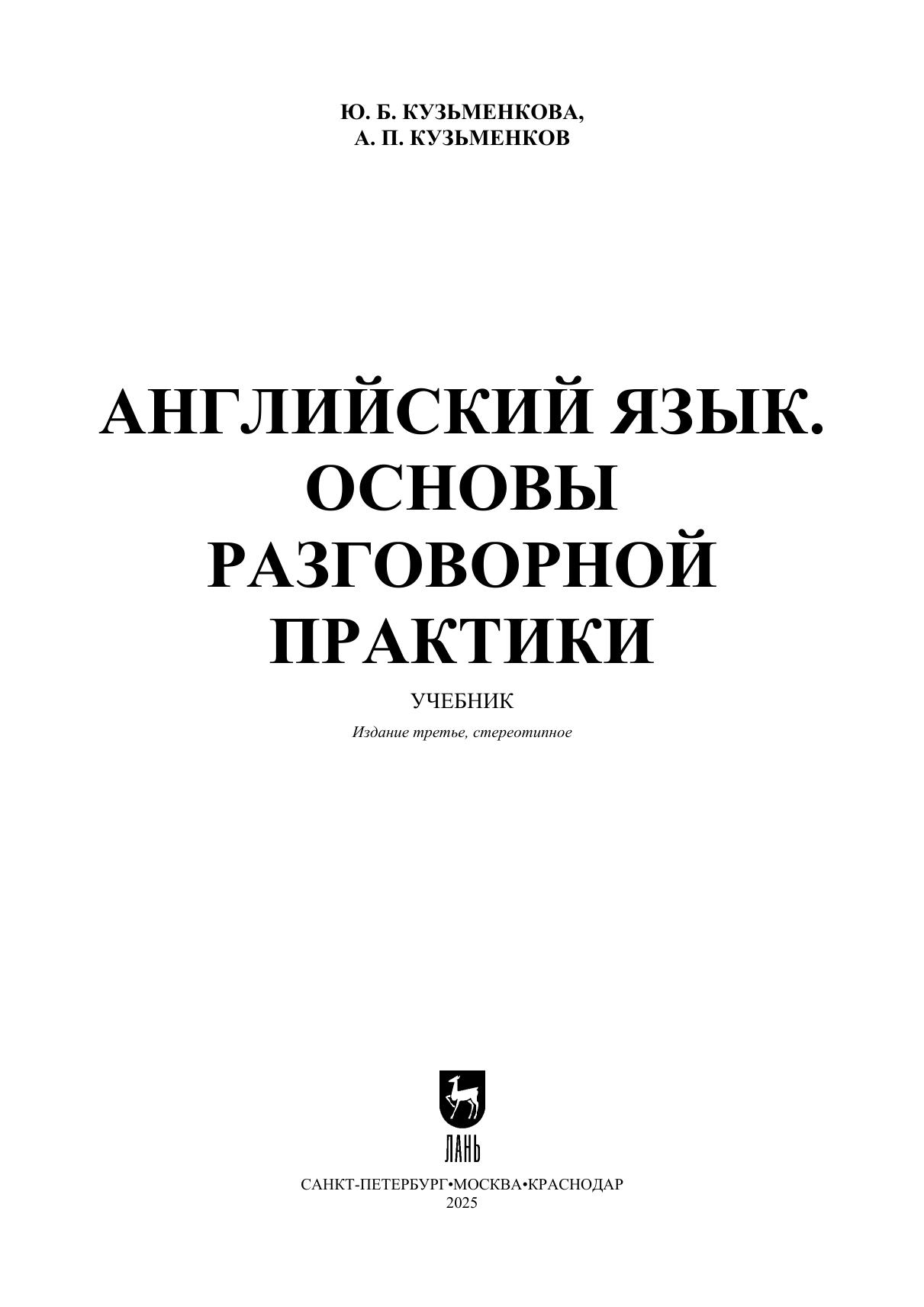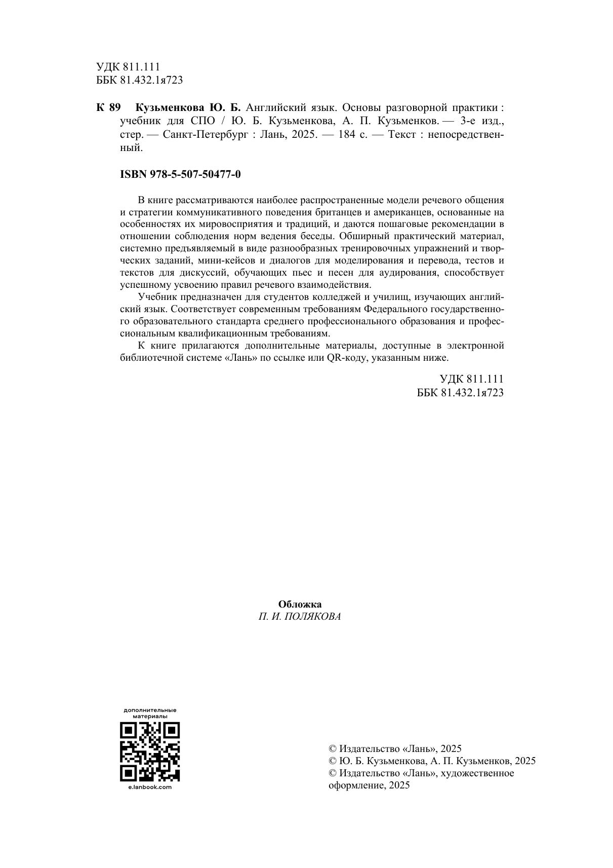 В книге рассматриваются наиболее распространенные модели речевого общения и стратегии коммуникативного поведения британцев и американцев, основанные на особенностях их мировосприятия и традиций, и даются пошаговые рекомендации в отношении соблюдения норм ведения беседы. Обширный практический материал, системно предъявляемый в виде разнообразных тренировочных упражнений и творческих заданий, мини-кейсов и диалогов для моделирования и перевода, тестов и текстов для дискуссий, обучающих пьес и песен для аудирования, способствует успешному усвоению правил речевого взаимодействия. Соответствует современным требованиям Федерального государственного образовательного стандарта среднего профессионального образования и профессиональным квалификационным требованиям. Учебник предназначен для студентов колледжей и училищ, изучающих английский язык. К книге прилагаются дополнительные материалы, доступные в электронной библиотечной системе «Лань» по ссылке или QR-коду, указанным ниже.