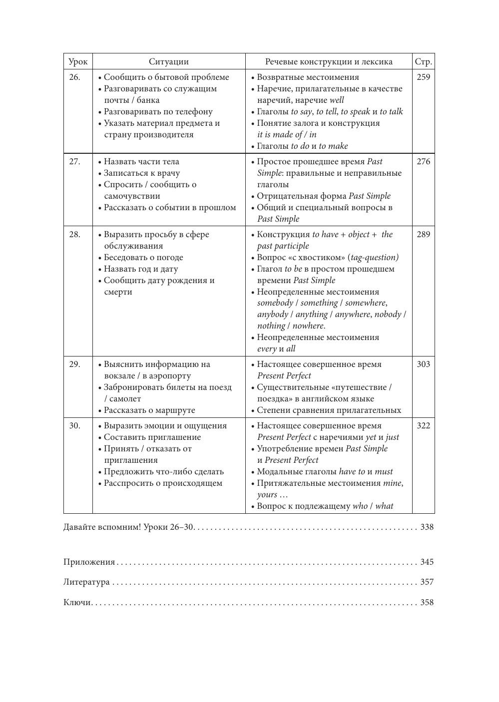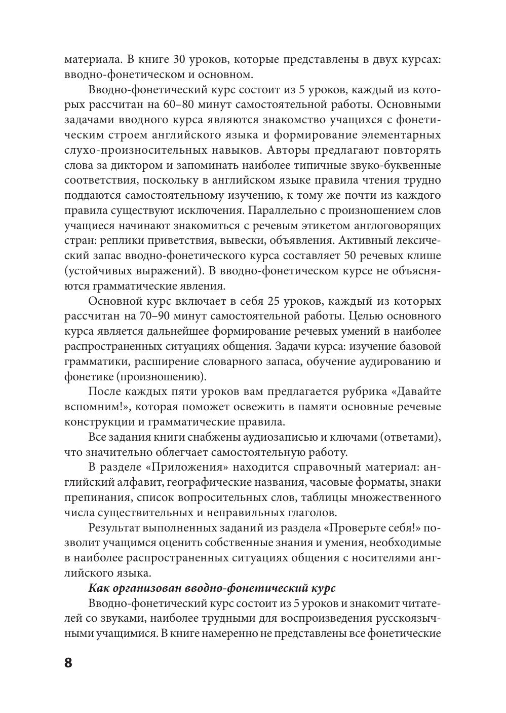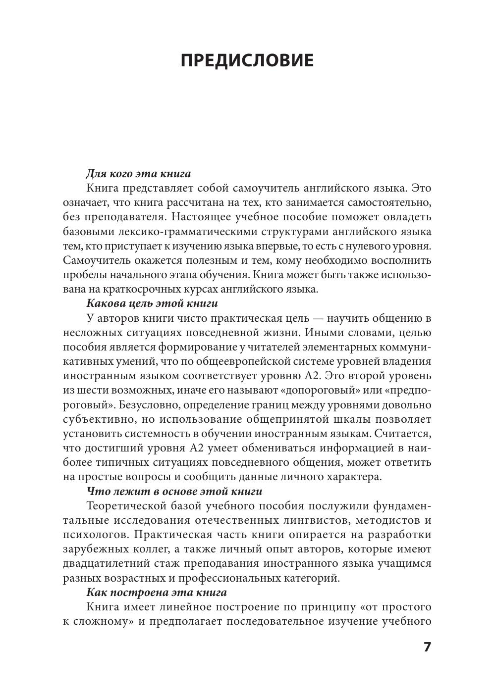 Пособие предназначено для самостоятельного изучения английского языка с нулевого уровня. При помощи материалов книги учащиеся смогут овладеть разговорной речью в объеме, необходимом для общения в наиболее распространенных повседневных ситуациях. В пособии приводятся многочисленные культурологические комментарии, касающиеся Англии и США, что может оказаться полезным не только начинающим, но и тем, кто уже немного знаком с английским языком. Все упражнения книги снабжены аудиозаписями, выполненными носителем языка. Цель пособия — сформировать у обучающихся элементарные коммуникативные умения, соответствующие уровню А2 по общеевропейской шкале языковых уровней.
