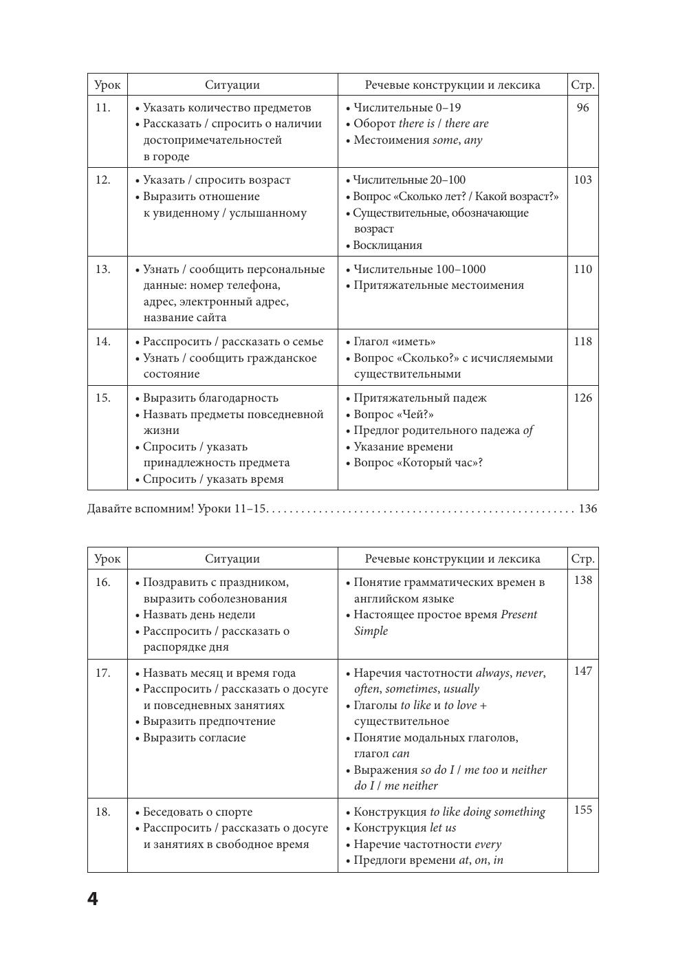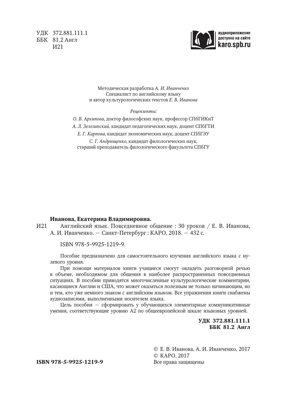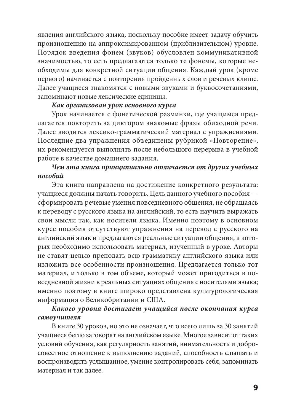 Пособие предназначено для самостоятельного изучения английского языка с нулевого уровня. При помощи материалов книги учащиеся смогут овладеть разговорной речью в объеме, необходимом для общения в наиболее распространенных повседневных ситуациях. В пособии приводятся многочисленные культурологические комментарии, касающиеся Англии и США, что может оказаться полезным не только начинающим, но и тем, кто уже немного знаком с английским языком. Все упражнения книги снабжены аудиозаписями, выполненными носителем языка. Цель пособия — сформировать у обучающихся элементарные коммуникативные умения, соответствующие уровню А2 по общеевропейской шкале языковых уровней.