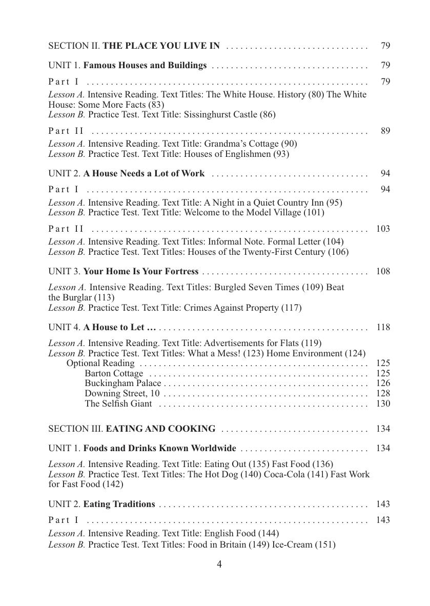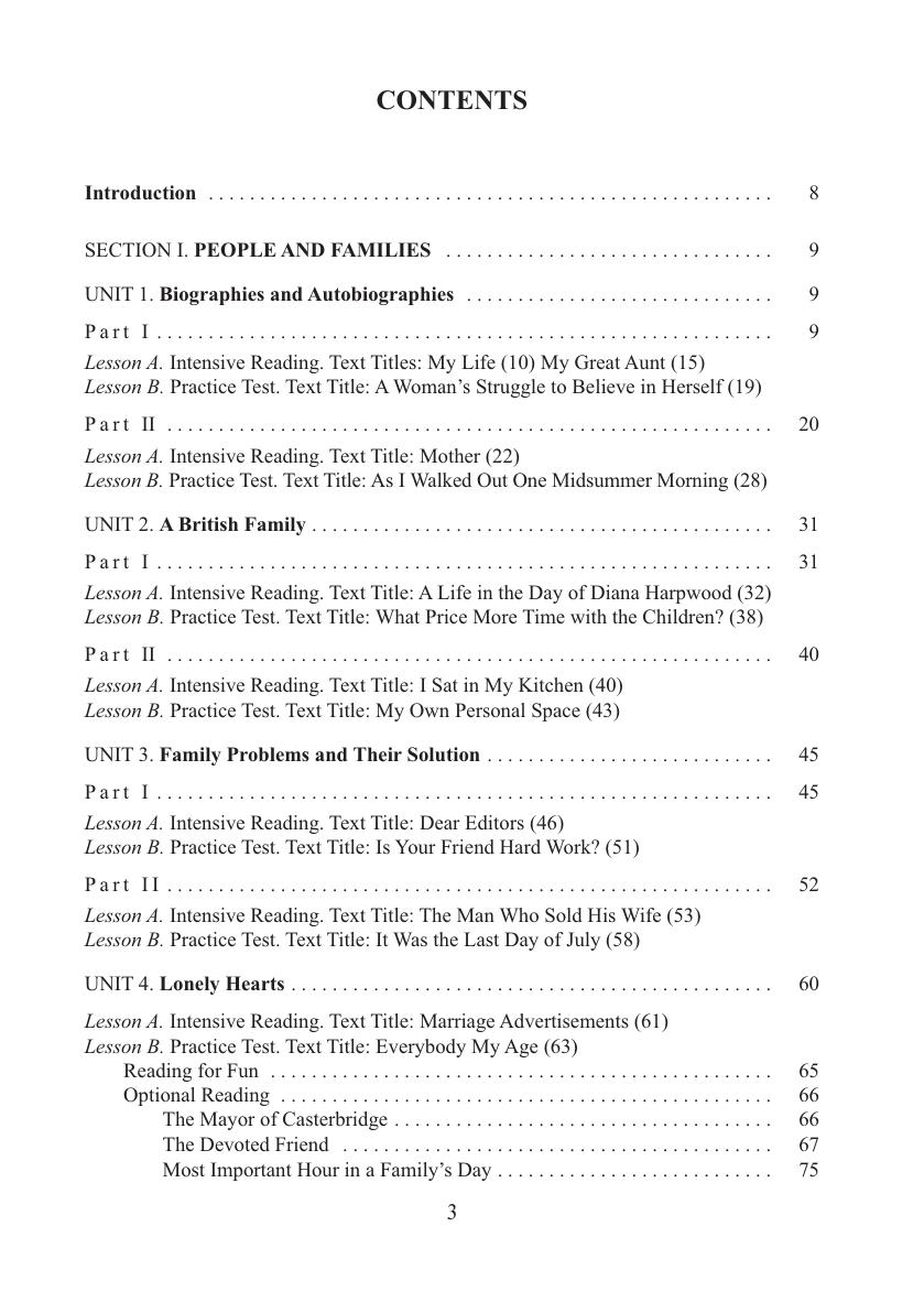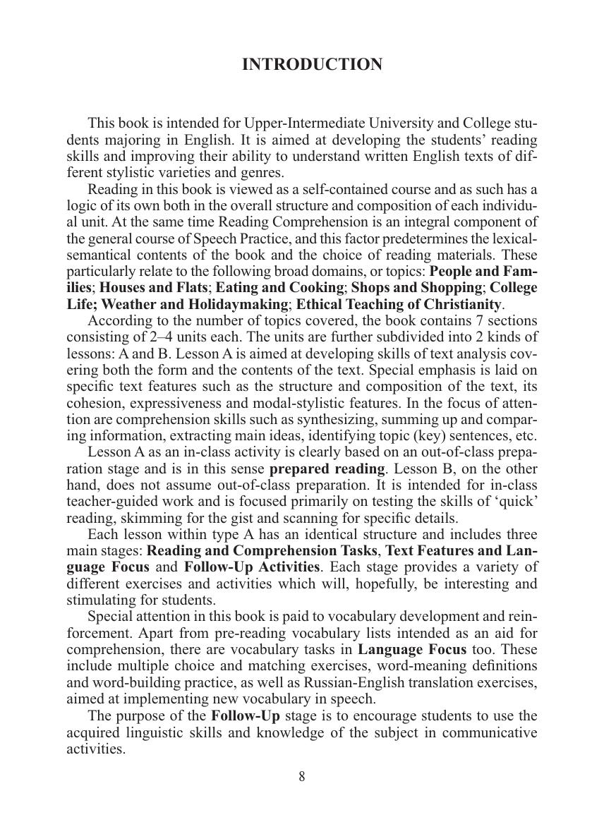 Является первой частью учебного пособия, предназначенного для развития навыков чтения и смыслового восприятия письменного текста различных стилистических и жанровых видов. Охватывает темы "Человек и семья", "Место, где ты живешь", "Питание и приготовление пищи", "Магазины и покупки", "Ты - студент", "Погода и отдых", "Этическое обучение христианству". Каждая тема содержит 2-3 раздела, которые состоят из урока для аудиторных занятий под руководством преподавателя и урока на основе внеаудиторной деятельности. Урок включает задания по чтению и восприятию, материал для анализа текста, послетекстовые упражнения. Дл я студентов вузов, а также учащихся колледжей, гимназий, лицеев.