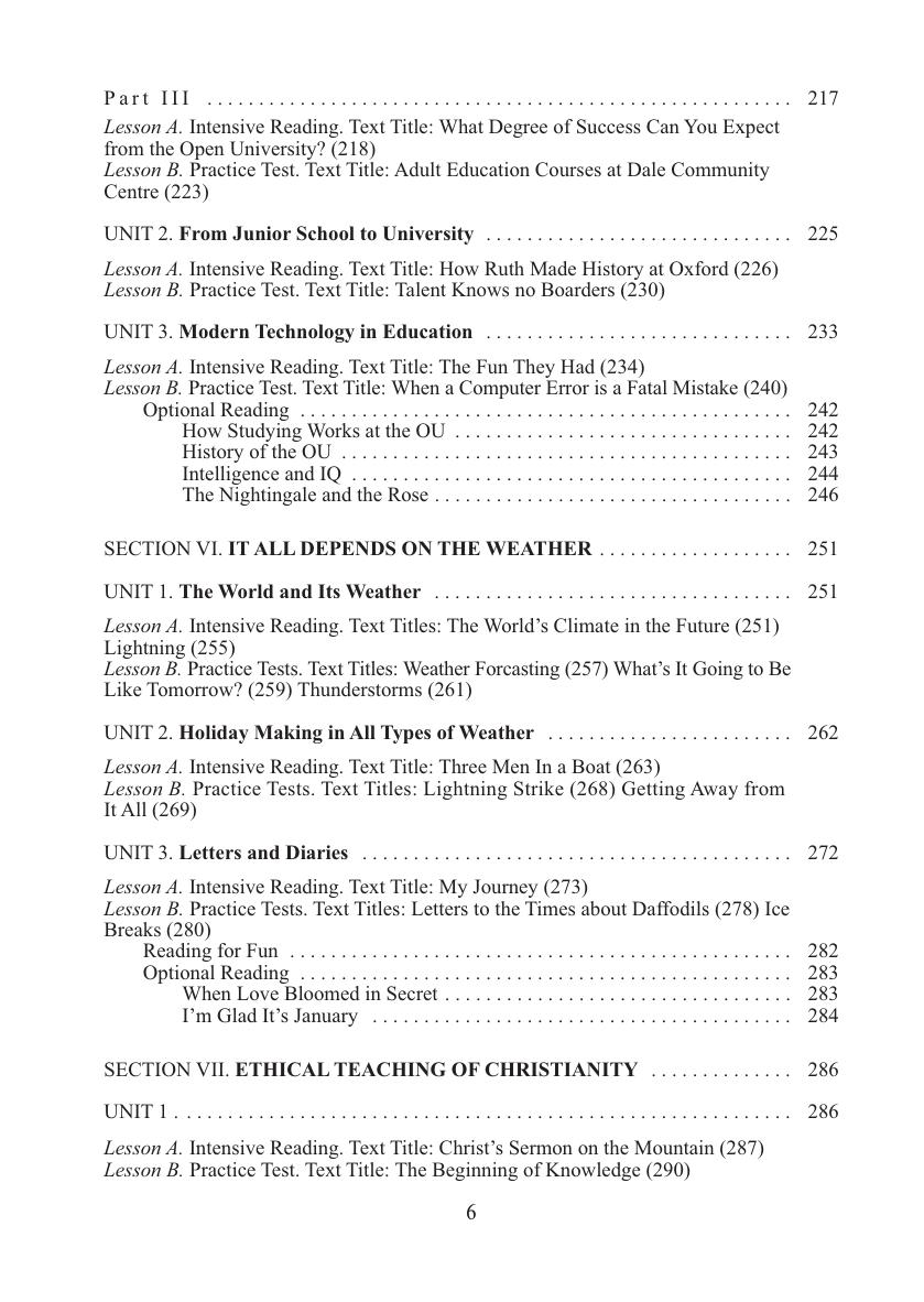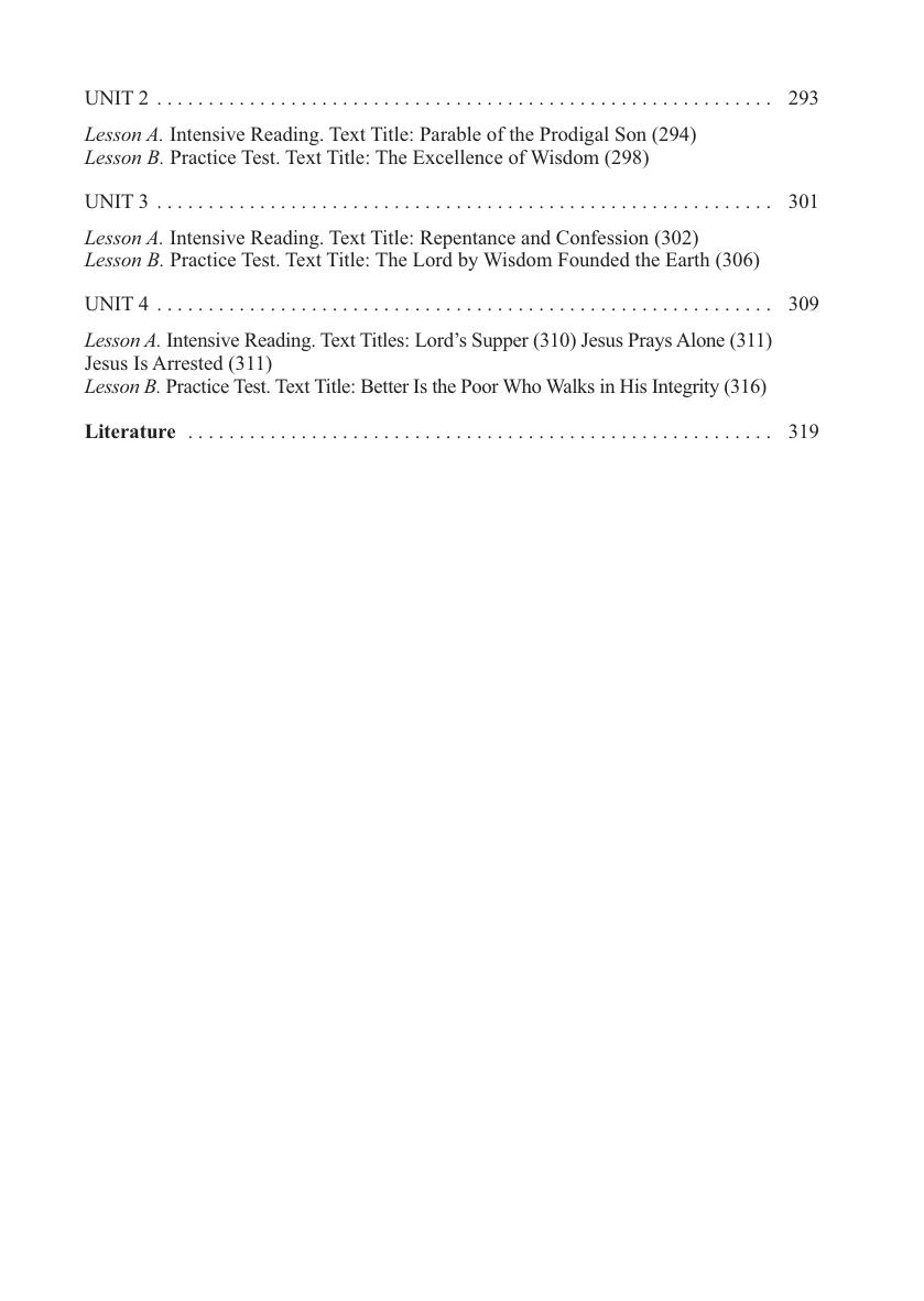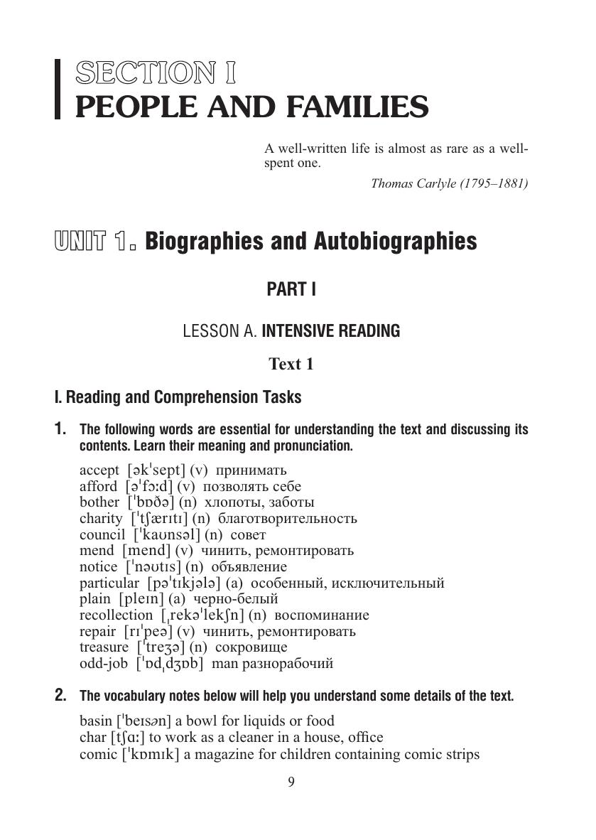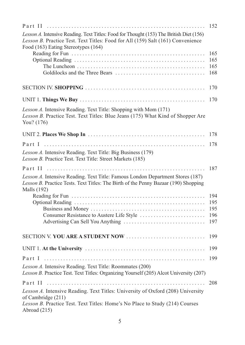 Является первой частью учебного пособия, предназначенного для развития навыков чтения и смыслового восприятия письменного текста различных стилистических и жанровых видов. Охватывает темы "Человек и семья", "Место, где ты живешь", "Питание и приготовление пищи", "Магазины и покупки", "Ты - студент", "Погода и отдых", "Этическое обучение христианству". Каждая тема содержит 2-3 раздела, которые состоят из урока для аудиторных занятий под руководством преподавателя и урока на основе внеаудиторной деятельности. Урок включает задания по чтению и восприятию, материал для анализа текста, послетекстовые упражнения. Дл я студентов вузов, а также учащихся колледжей, гимназий, лицеев.