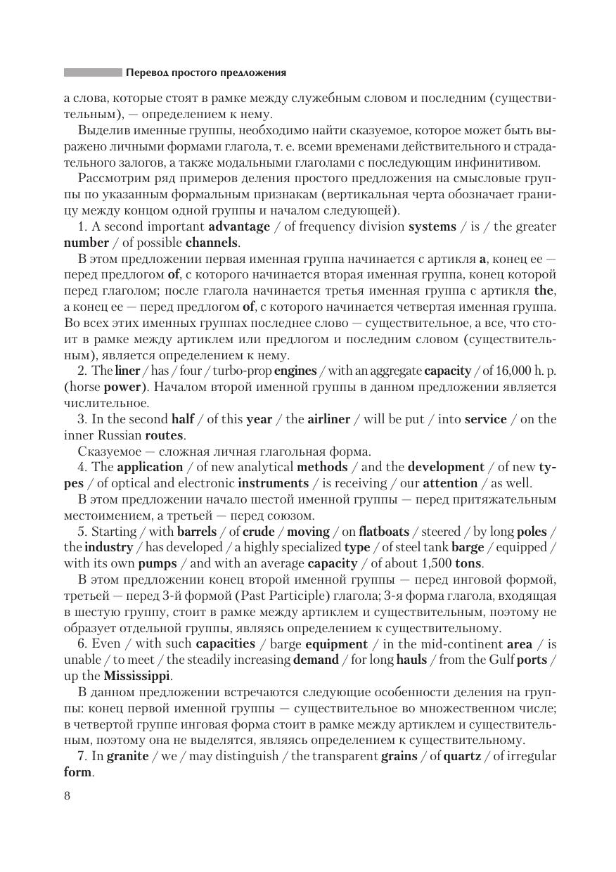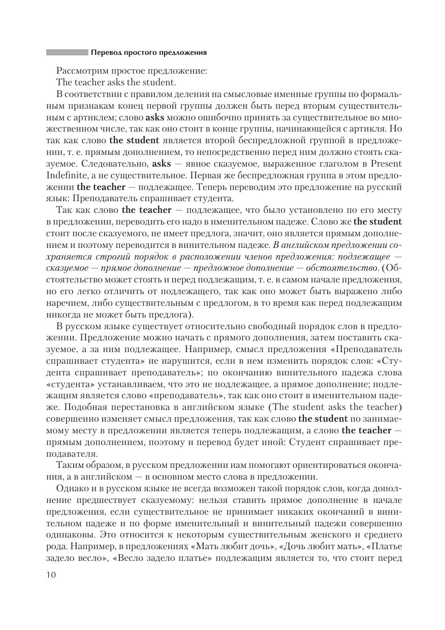 Для правильного и быстрого перевода английского предложения на русский язык недостаточно располагать элементарными знаниями грамматики и определенным запасом слов. Перевод предложения по принципу нанизывания найденных в словаре значений слов в порядке их расположения в английском предложении не дает хороших результатов. Цель пособия – помочь приступающему к переводу английского текста понять взаимосвязь неизвестных слов в предложении и дать несколько приемов, облегчающих перевод оригинального текста. Пособие содержит множество примеров, а также упражнения для закрепления материала.