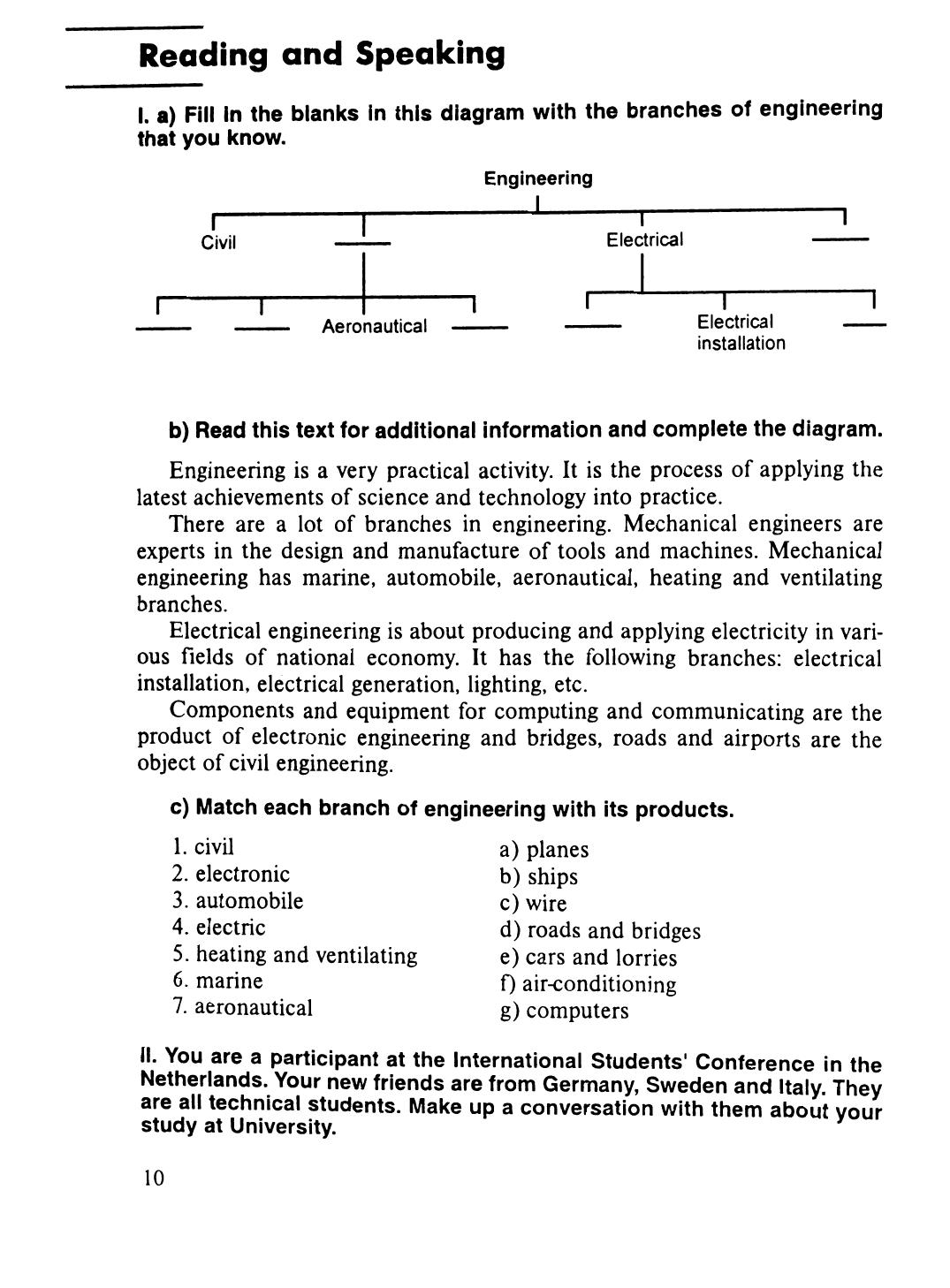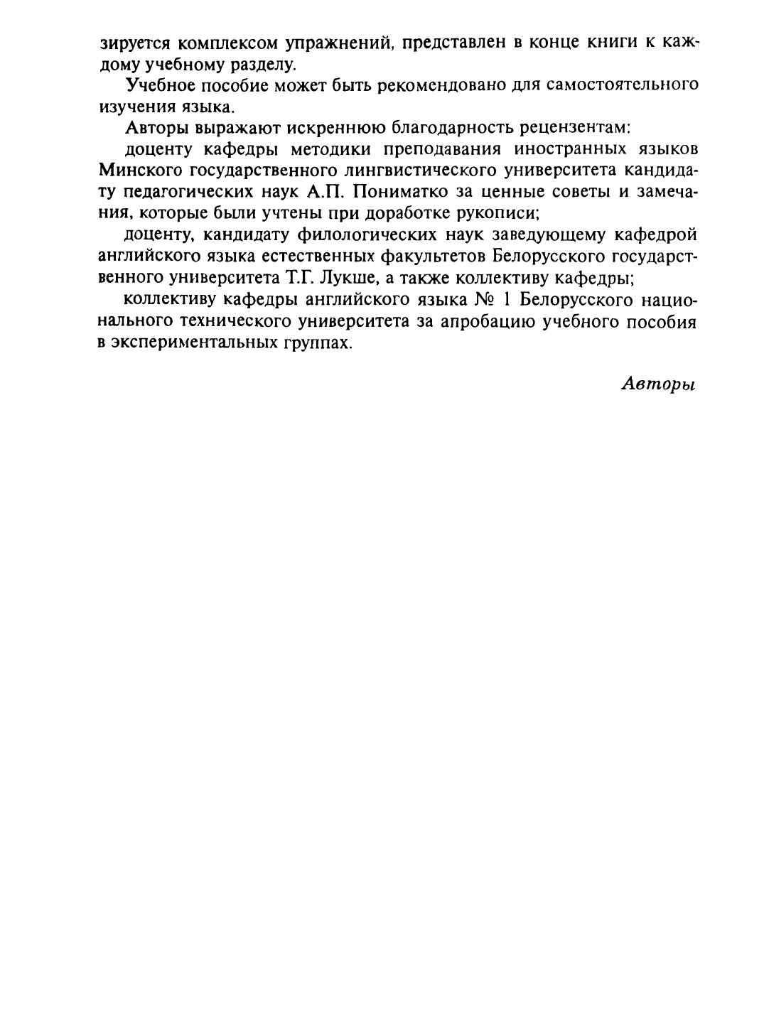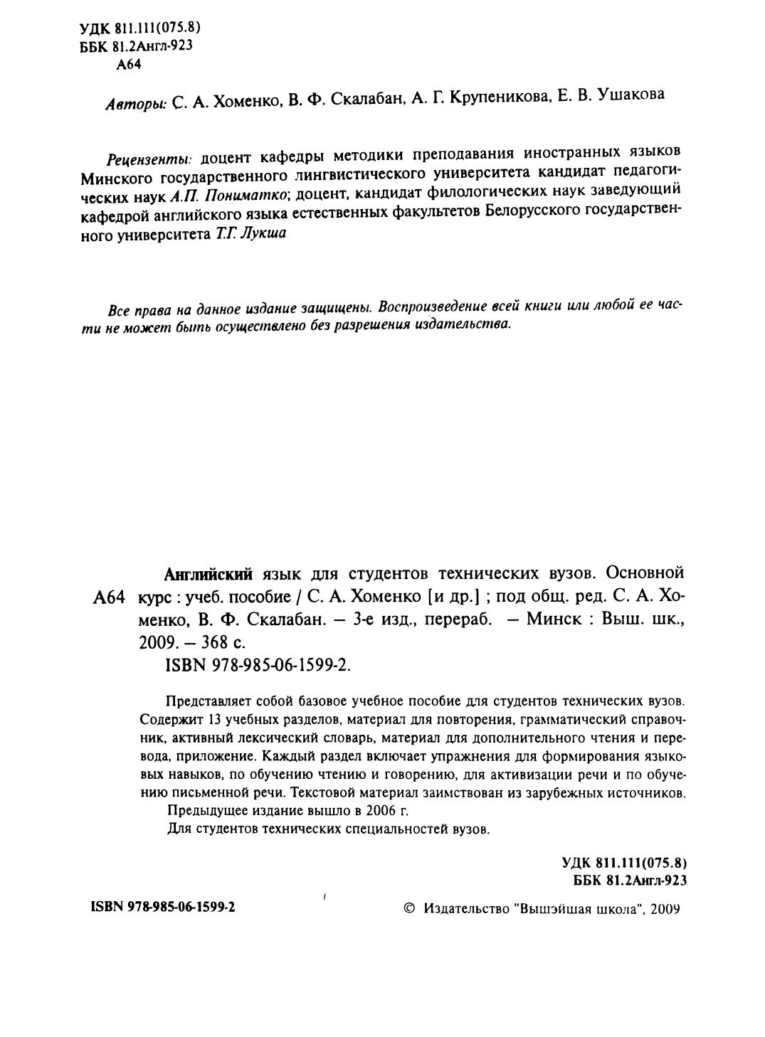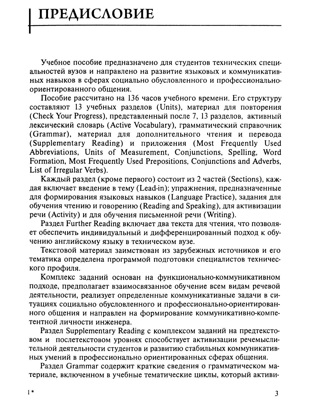Содержит 13 учебных разделов, материал для повторения, грамматический справочник, активный лексический словарь, материал для дополнительного чтения и перевода, приложение. Каждый раздел включает упражнения для формирования языковых навыков, по обучению чтению и говорению, для активизации речи и по обучению письменной речи. Текстовой материал заимствован из зарубежных источников. Для студентов технических специальностей вузов.