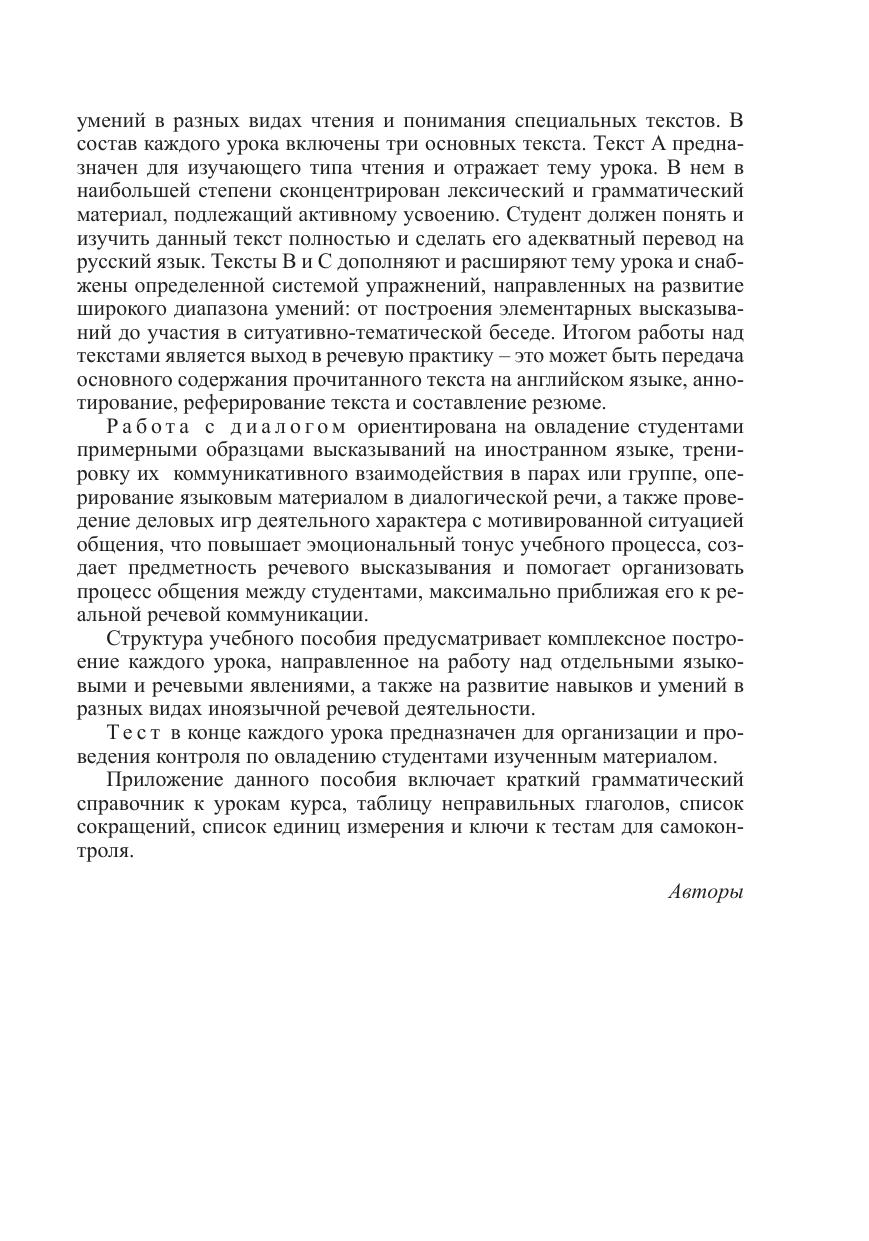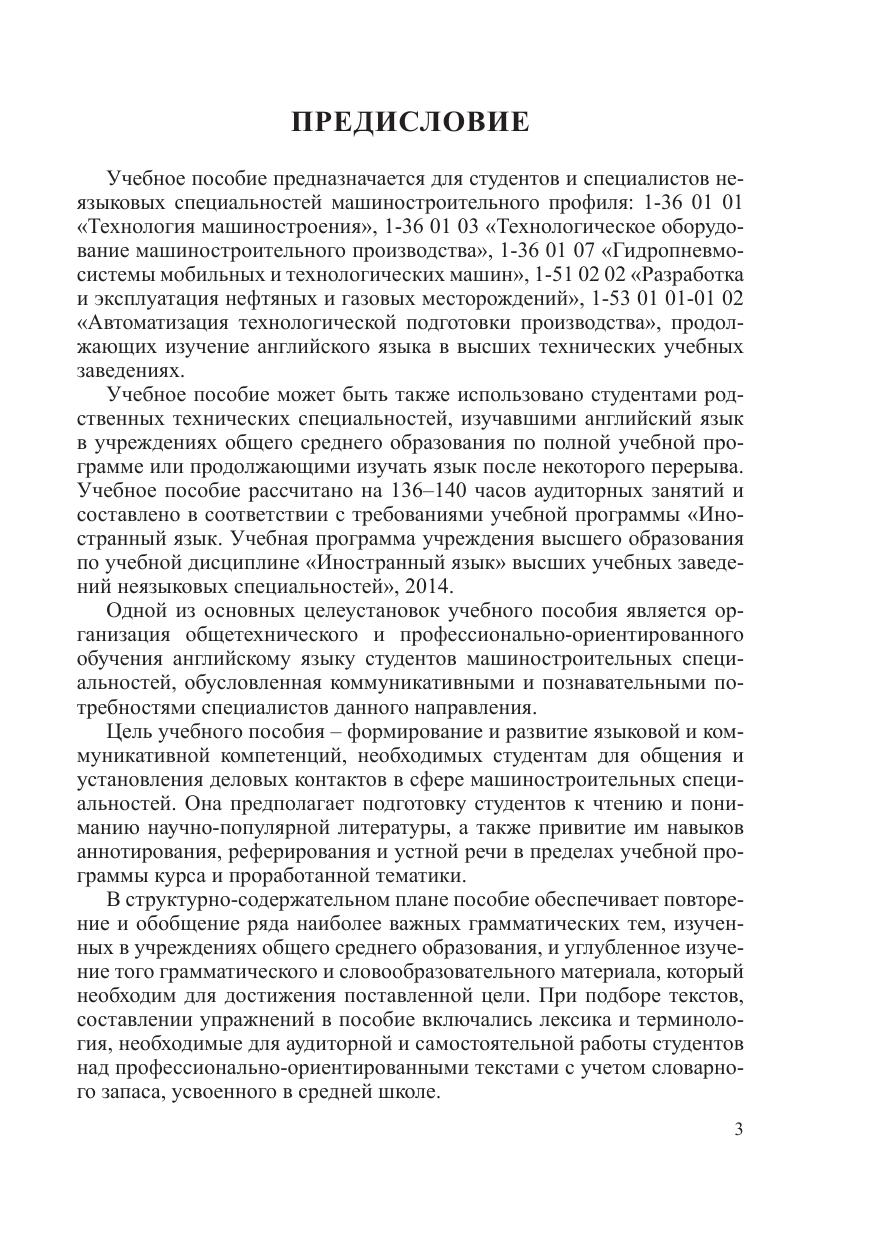 Учебное пособие может быть также использовано студентами родственных технических специальностей, изучавшими английский язык в учреждениях общего среднего образования по полной учебной программе или продолжающими изучать язык после некоторого перерыва. Учебное пособие рассчитано на 136–140 часов аудиторных занятий и составлено в соответствии с требованиями учебной программы «Ино- странный язык. Учебная программа учреждения высшего образования по учебной дисциплине «Иностранный язык» высших учебных заведений неязыковых специальностей», 2014.