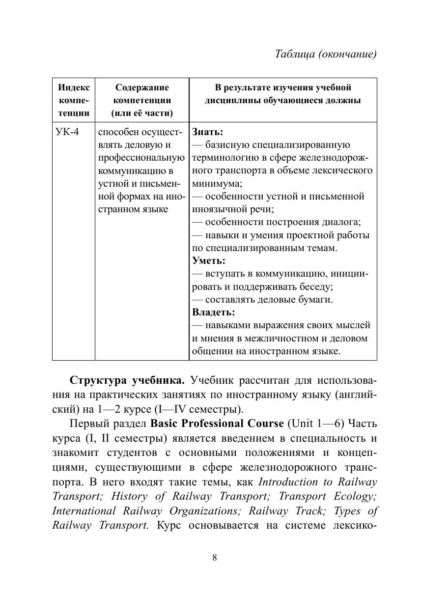 Данный учебник разработан в соответствии с требованиями ФГОС ВО. В учебнике определяются требования к формированию коммуникативных умений на иностранном языке в РУТ МИИТе в рамках уровня бакалавриата и специалитета с учетом требований, предъявляемых к формированию коммуникативной компетенции в странах Европы и мира; используются следующие образовательные технологии: ролевые игры, учебные дискуссии, работа в мини-группах, устные сообщения и презентации, проектные задания и языковой портфель.