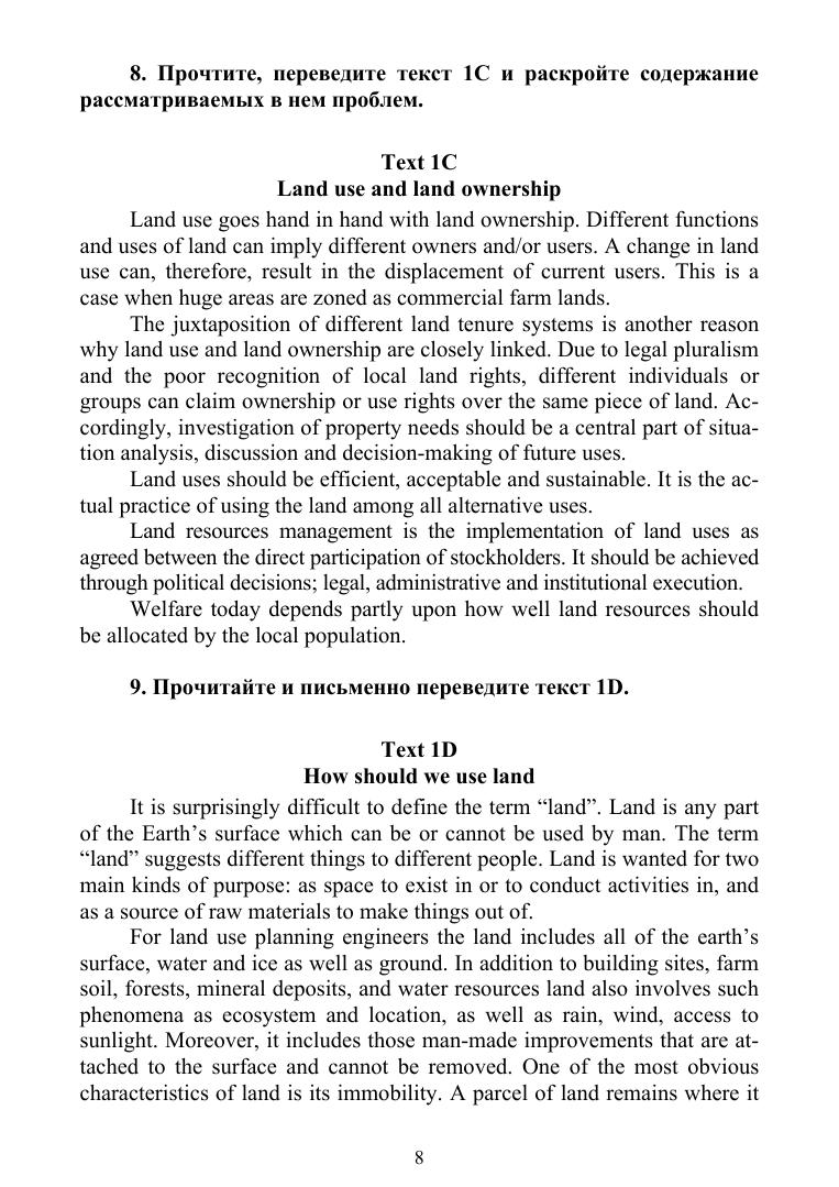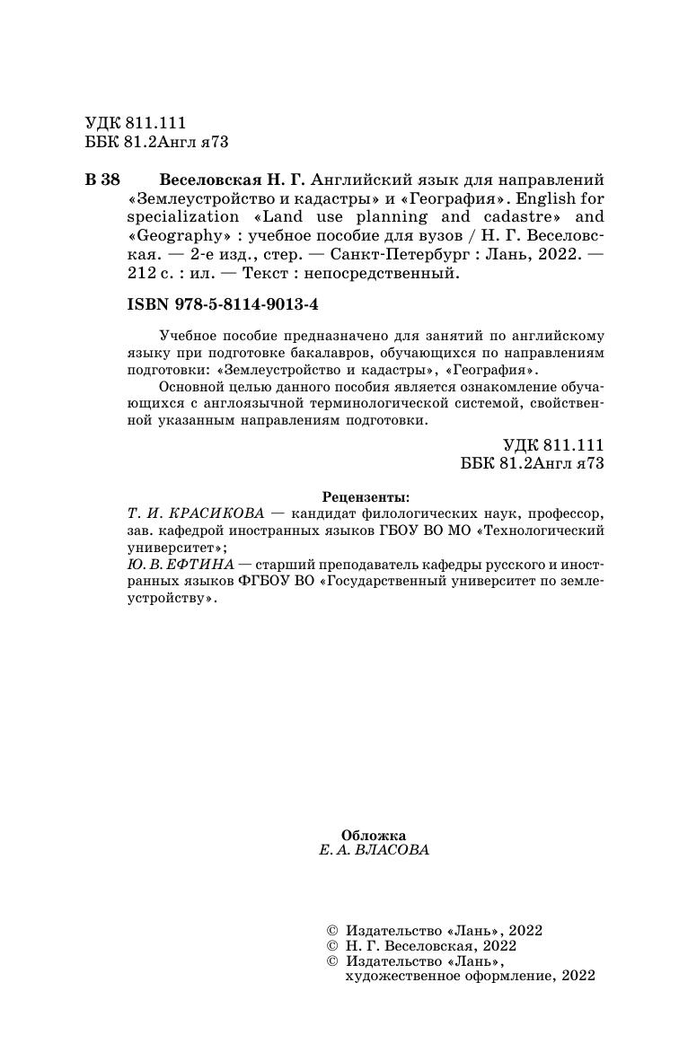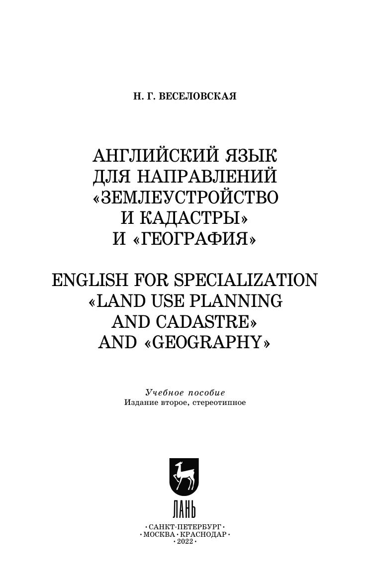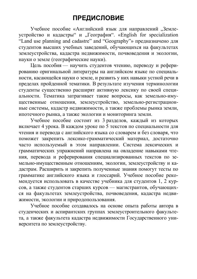 Учебное пособие предназначено для занятий по английскому языку при подготовке бакалавриатов, обучающихся по направлениям подготовки: «Землеустройство и кадастры», «География».