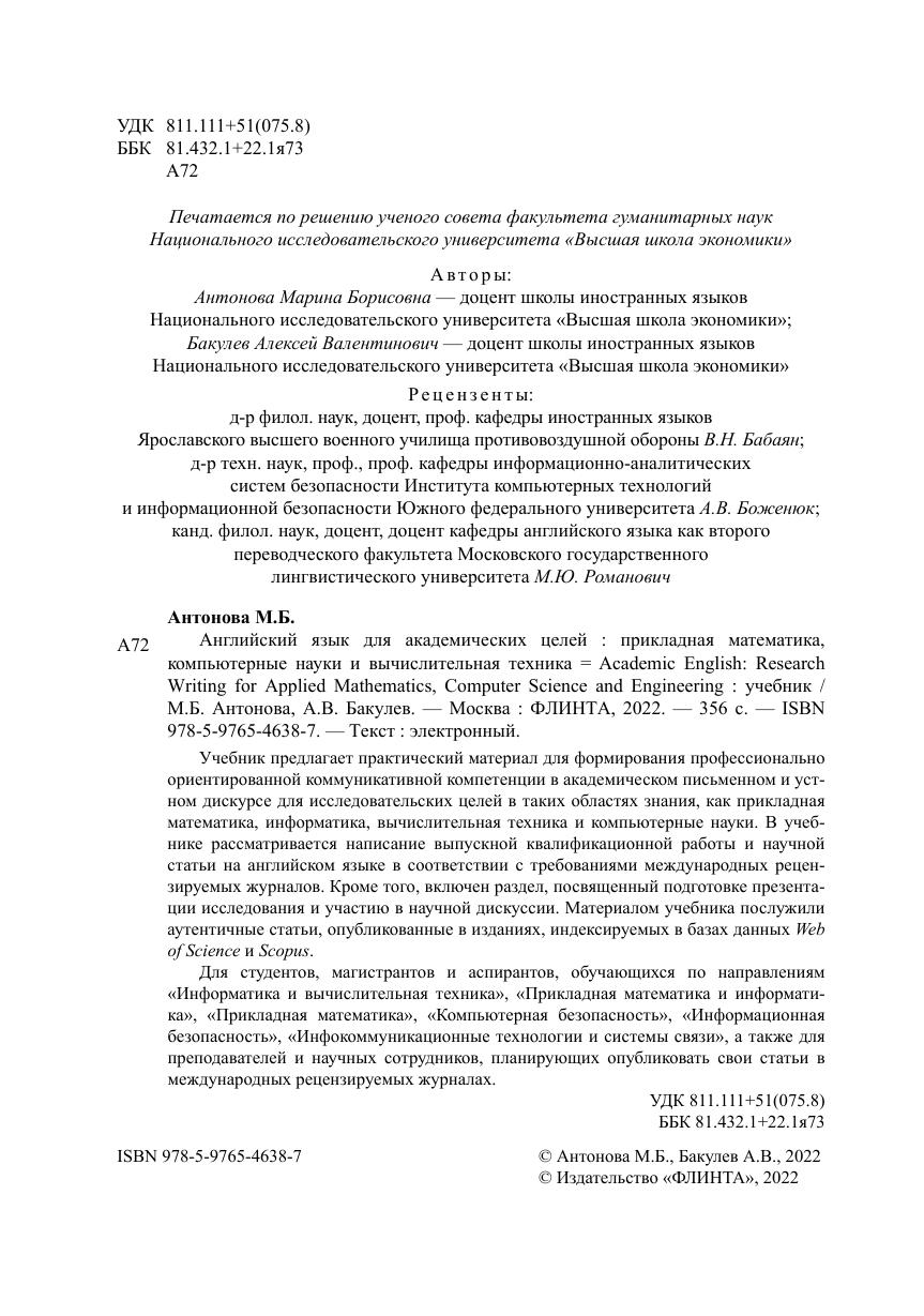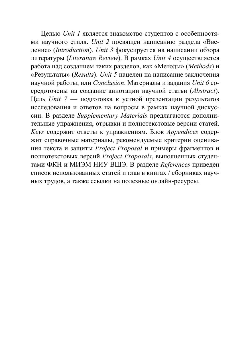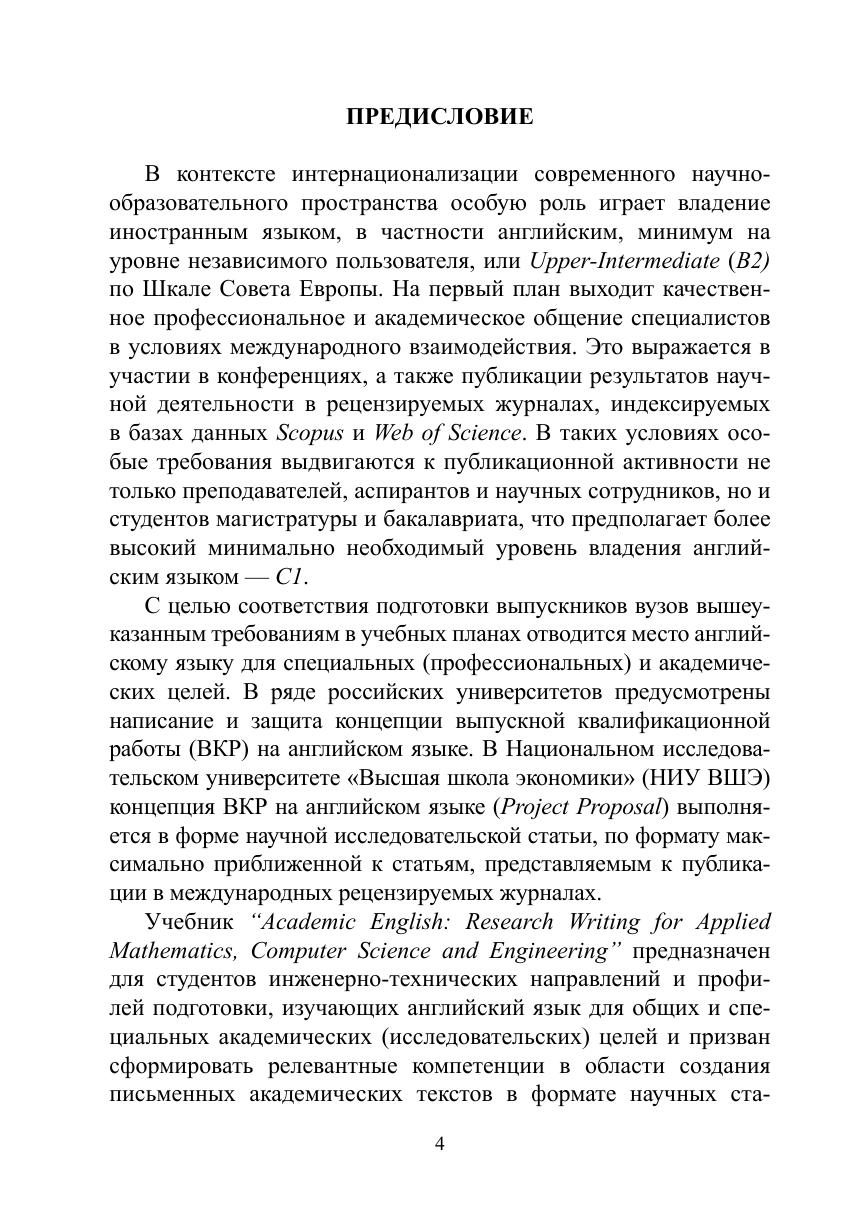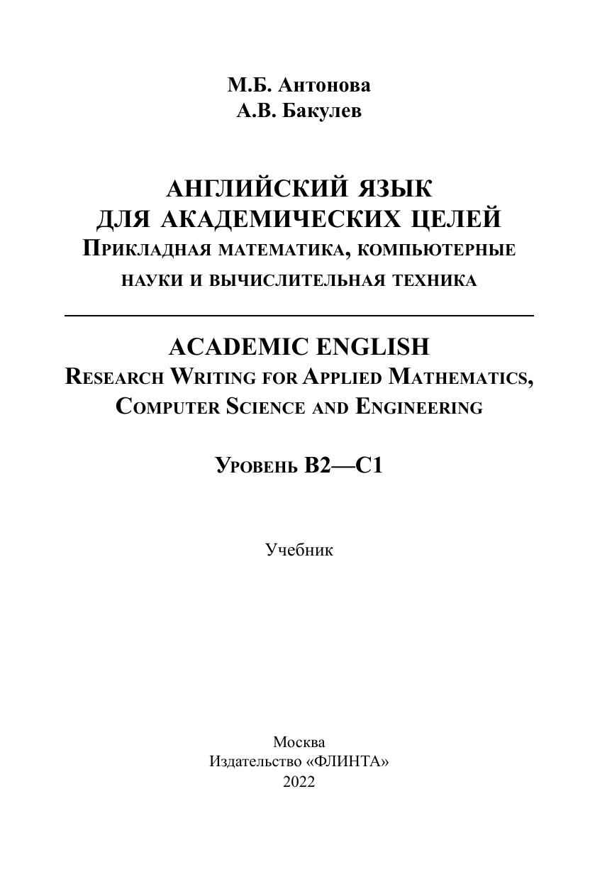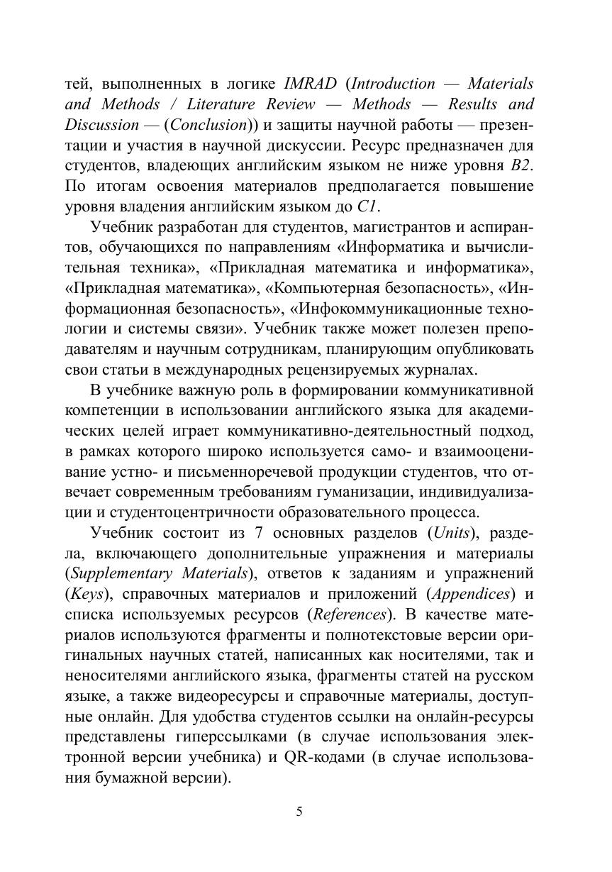 Учебник предлагает практический материал для формирования профессионально ориентированной коммуникативной компетенции в академическом письменном и устном дискурсе для исследовательских целей в таких областях знания, как прикладная математика, информатика, вычислительная техника и компьютерные науки. В учебнике рассматривается написание выпускной квалификационной работы и научной статьи на английском языке в соответствии с требованиями международных рецензируемых журналов. Кроме того, включен раздел, посвященный подготовке презентации исследования и участию в научной дискуссии. Материалом учебника послужили аутентичные статьи, опубликованные в изданиях, индексируемых в базах данных Web of Science и Scopus.