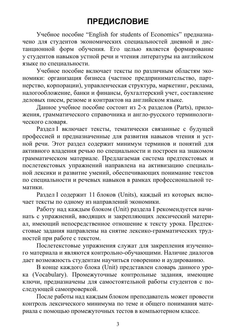 Данное учебное пособие предназначено для студентов экономических специальностей очной и дистанционной форм обучения. Цель учебного пособия – развитие навыков устной речи, чтения и понимания литературы экономического профиля на английском языке. В пособие включены тексты по различным направлениям экономики: типы бизнеса, менеджмент, маркетинг, банки и финансы, налогообложение и бухгалтерский учет. Учебное пособие состоит из двух разделов, приложения, грамматического справочника и англо-русского терминологического словаря.