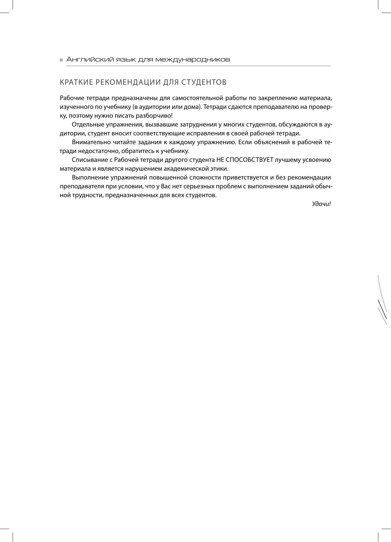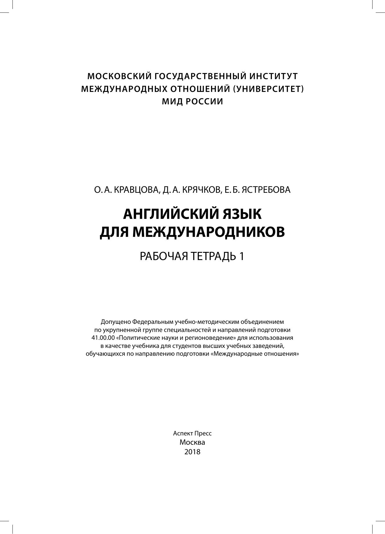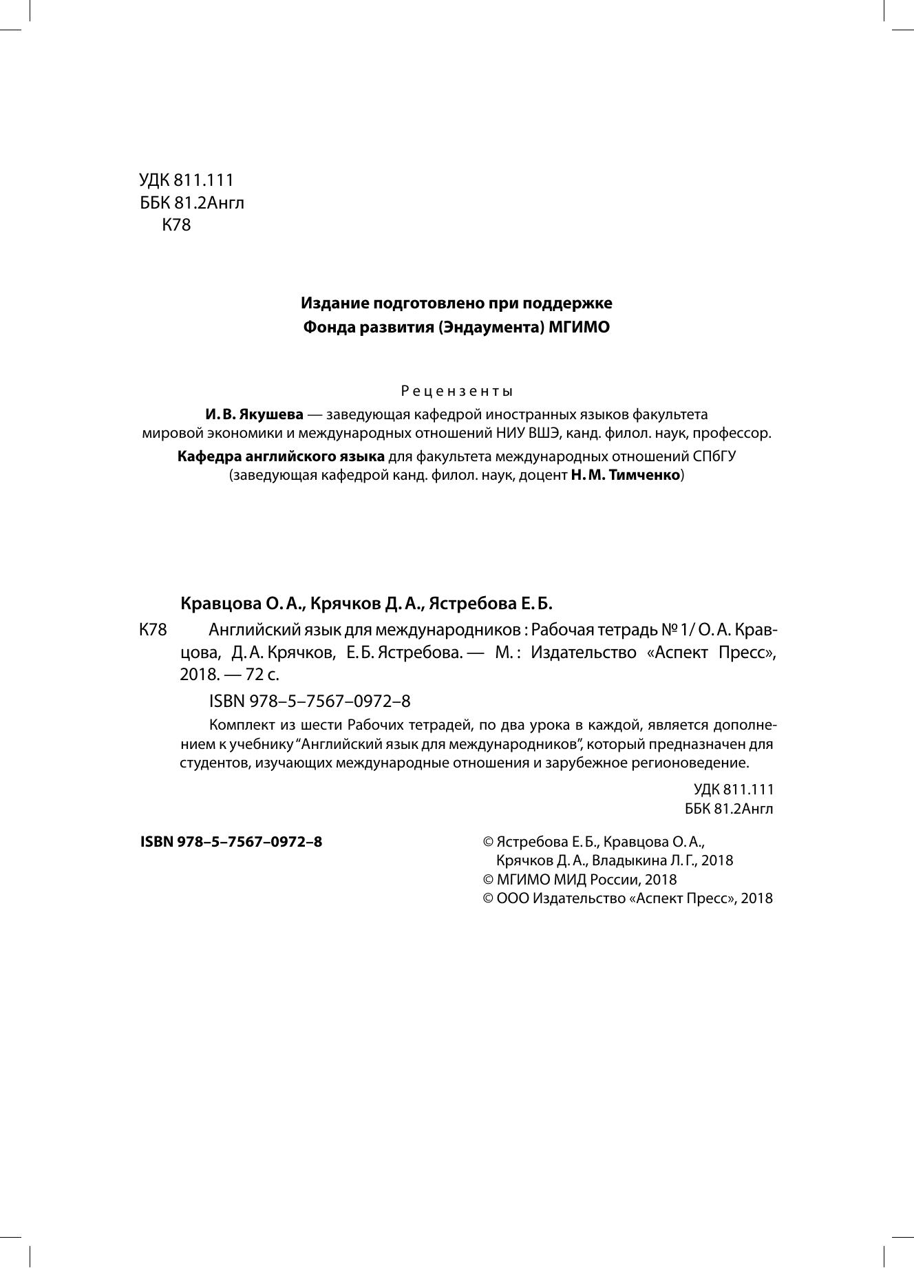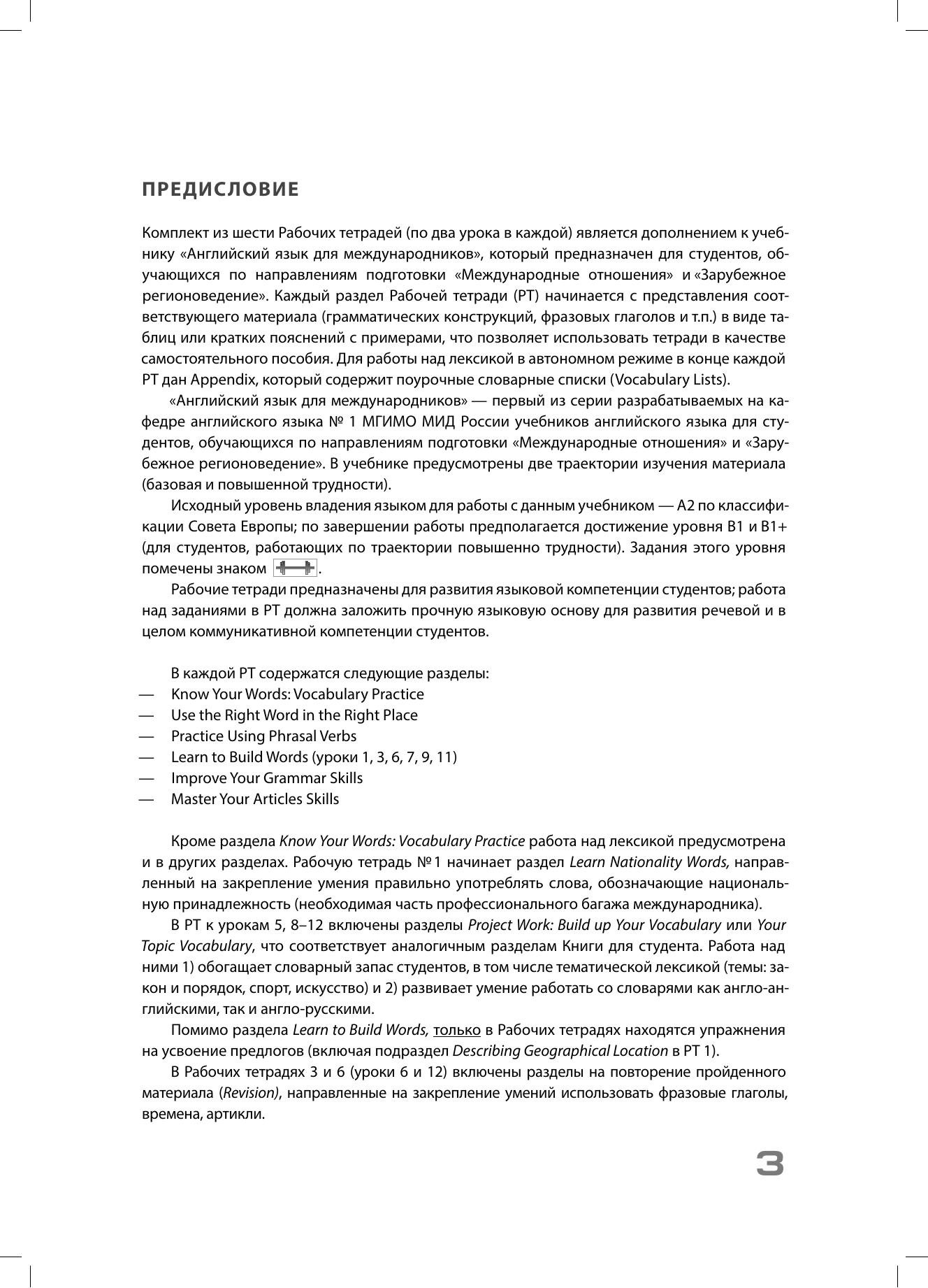 Комплект из шести Рабочих тетрадей, по два урока в каждой, является дополнением к учебнику “Английский язык для международников”, который предназначен для студентов, изучающих международные отношения и зарубежное регионоведение.
