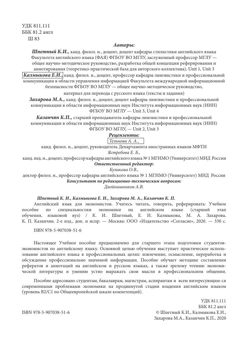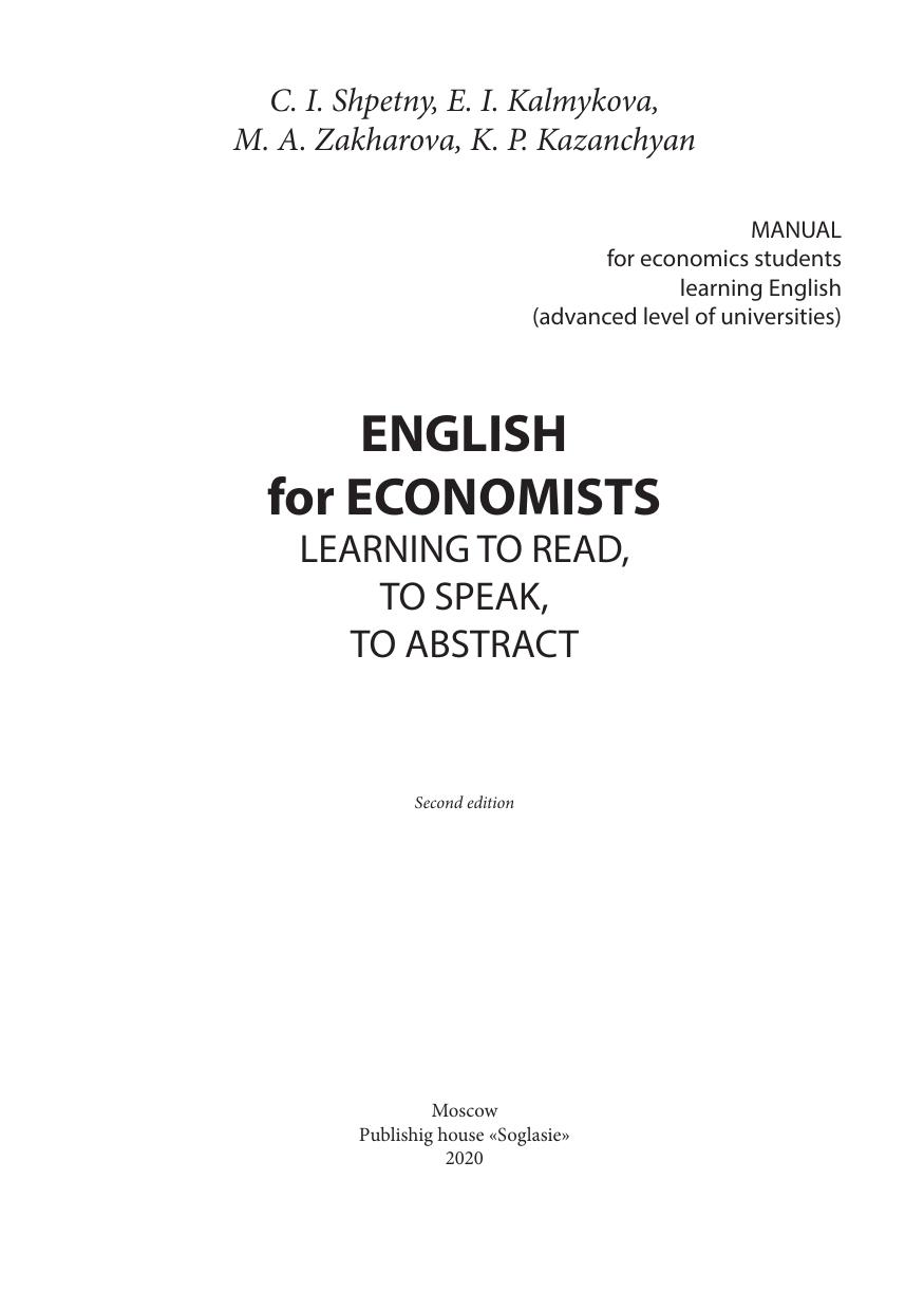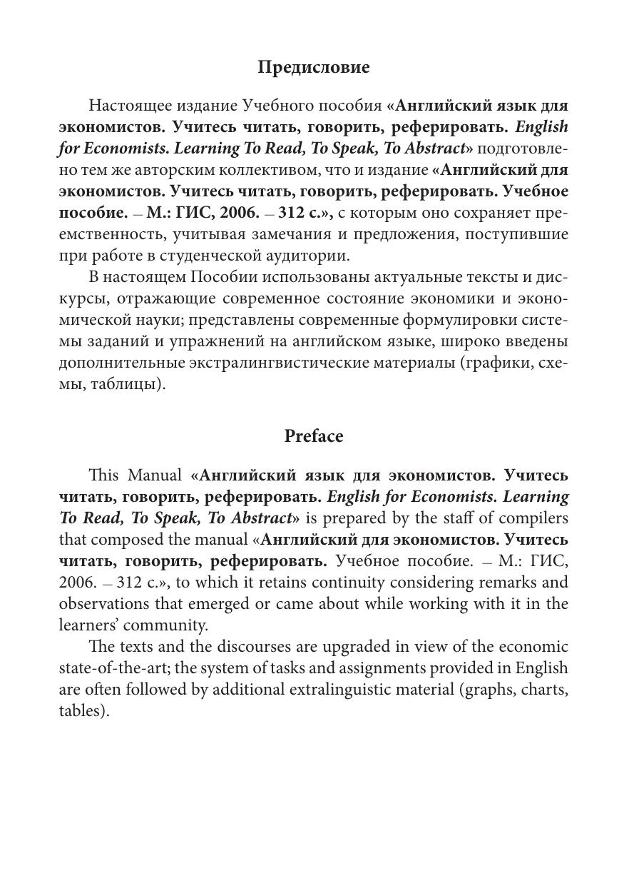 Настоящее Учебное пособие предназначено для старшего этапа подготовки студентов-экономистов по английскому языку. Основной целью обучения выступает практическое использование английского языка в профессиональных целях: извлечение, осмысление, переработка и обсуждение профессионально значимой информации. Пособие обучает методике составления рефератов и аннотаций на английском и русском языках, а также зрелому чтению экономической литературы и умению устно выражать свои мысли в профессиональном общении. Пособие адресовано студентам, бакалаврам, магистрам, аспирантам и всем интересующимся современными проблемами экономики на продвинутой стадии владения английским языком (уровень B2/C1 по Общеевропейской шкале компетенций).