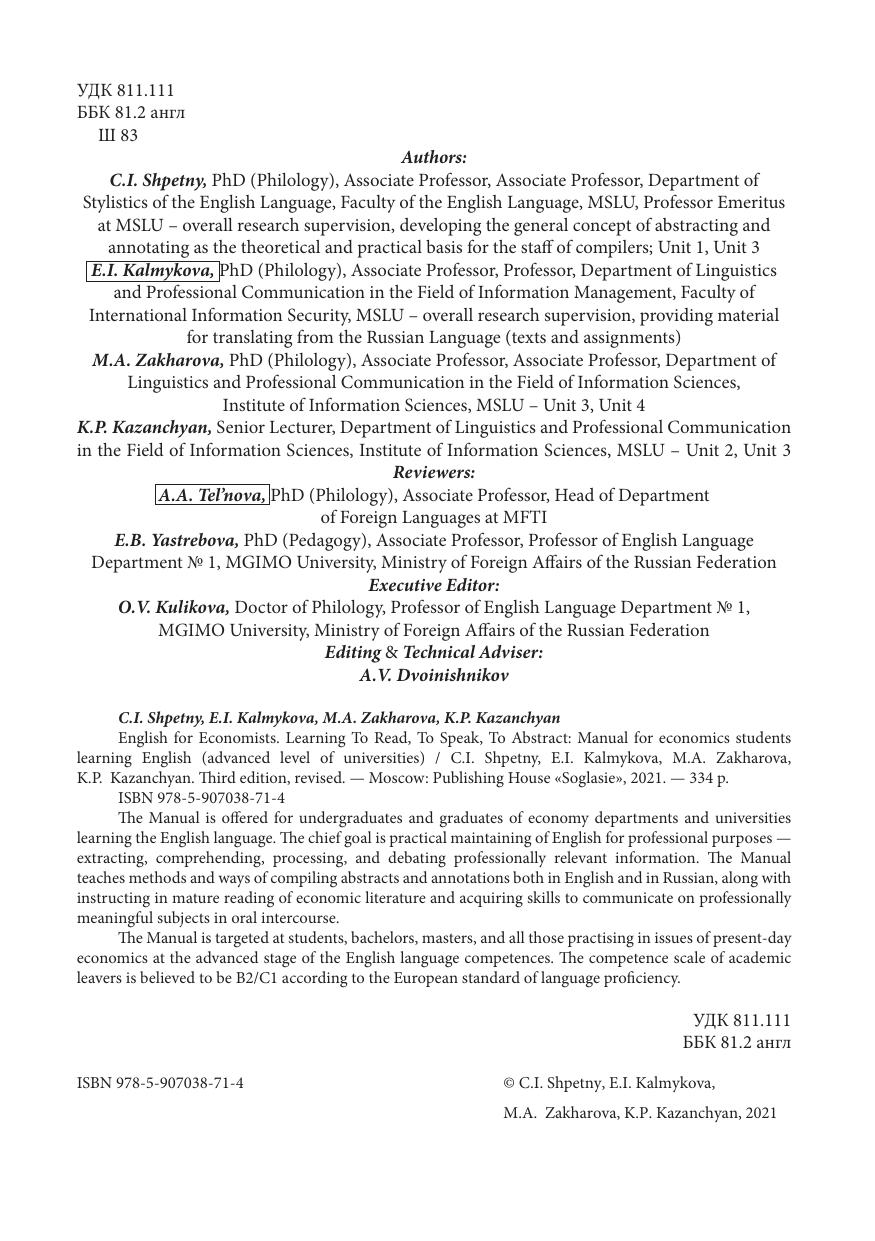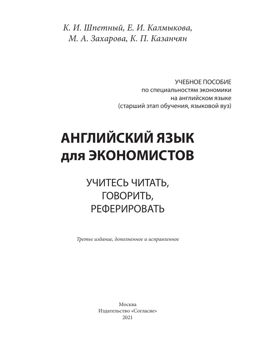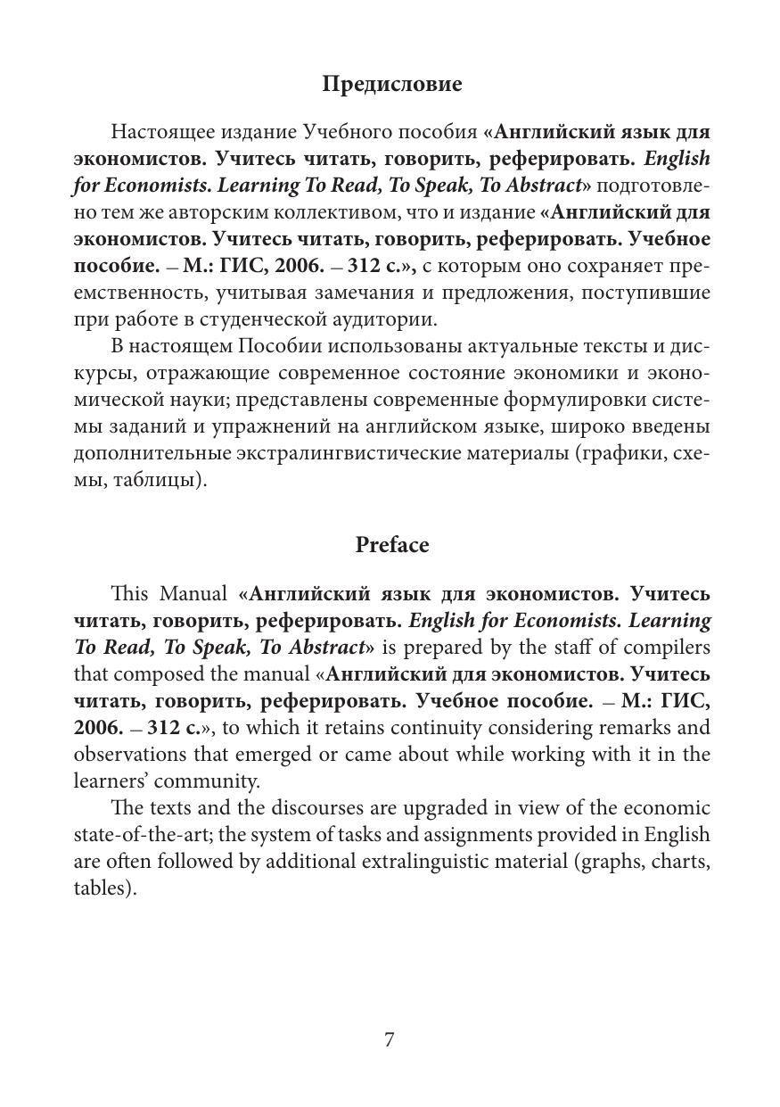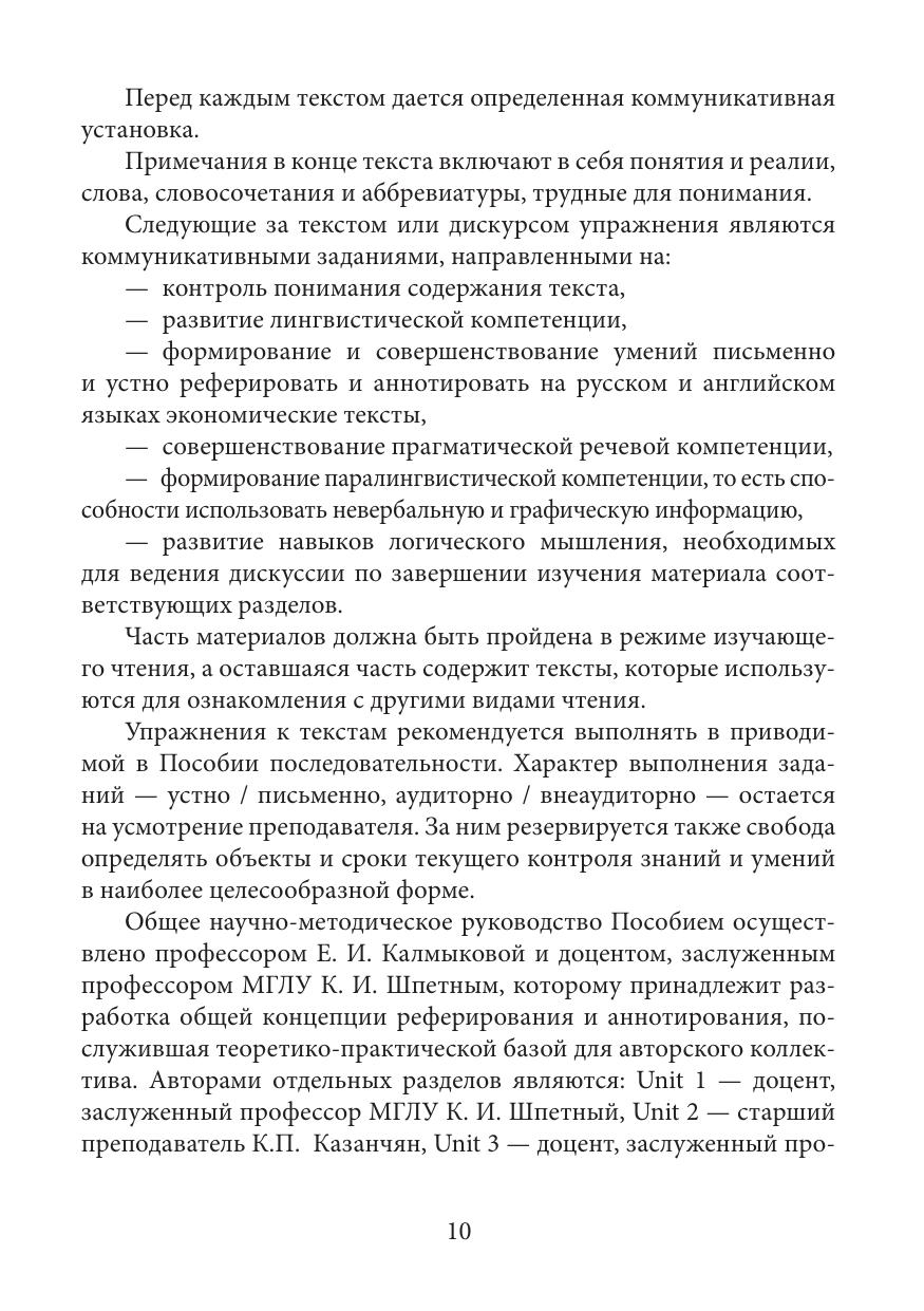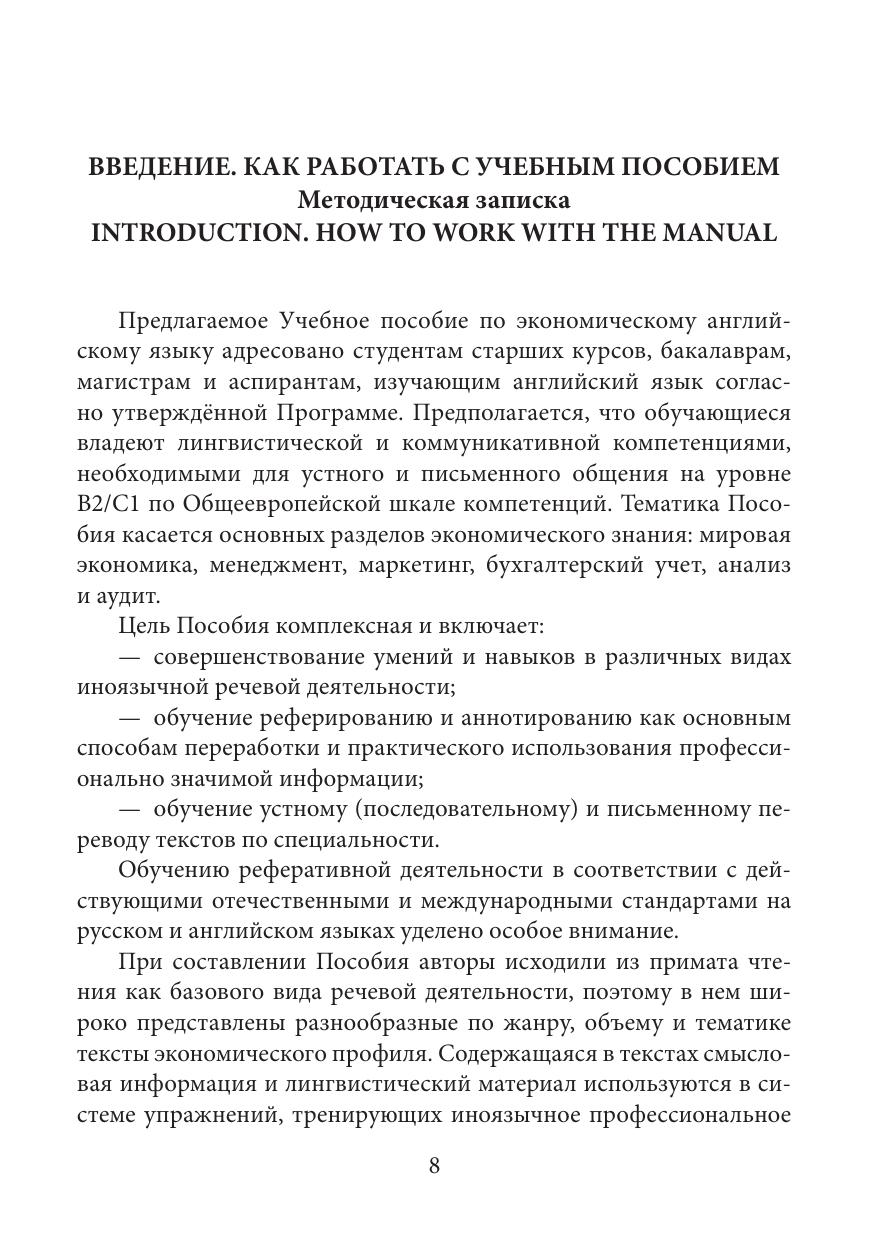 Настоящее Учебное пособие предназначено для старшего этапа подготовки студентов- экономистов по английскому языку. Основной целью обучения выступает практическое использование английского языка в профессиональных целях: извлечение, осмысление, переработка и обсуждение профессионально значимой информации. Пособие обучает методике составления рефератов и аннотаций на английском и русском языках, а также зрелому чтению экономической литературы и умению устно выражать свои мысли в профессиональном общении. Пособие адресовано студентам, бакалаврам, магистрам, аспирантам и всем интересующимся современными проблемами экономики на продвинутой стадии владения английским языком (уровень B2/C1 по Общеевропейской шкале компетенций).