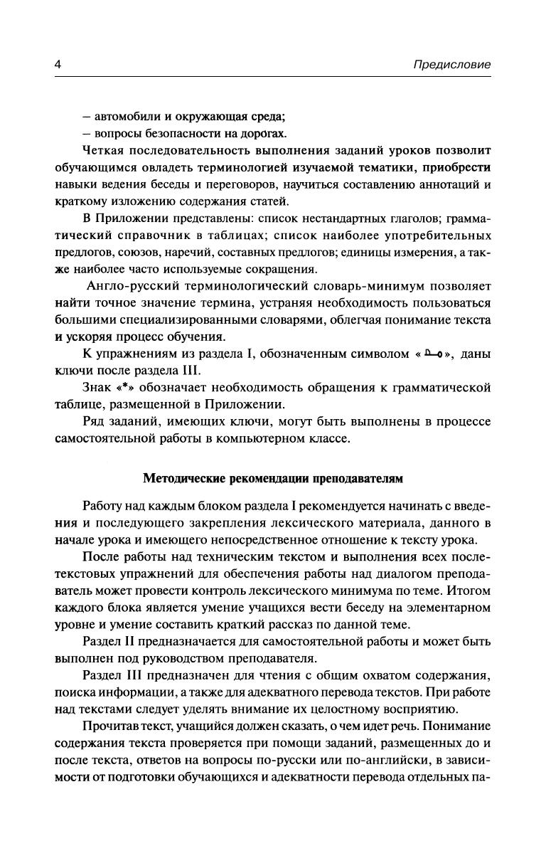 Целью данного учебного пособия является развитие навыков устной речи и чтения технической литературы автотранспортного профиля на английском языке. Тексты скомнанованы тематически и дают представление об устройстве автомобиля, его основных узлах и механизмах. В книгу включены грамматический справочник, список наиболее употребительных союзов, предлогов и наречий, список нестандартных глаголов и англо-русский терминологический словарь.