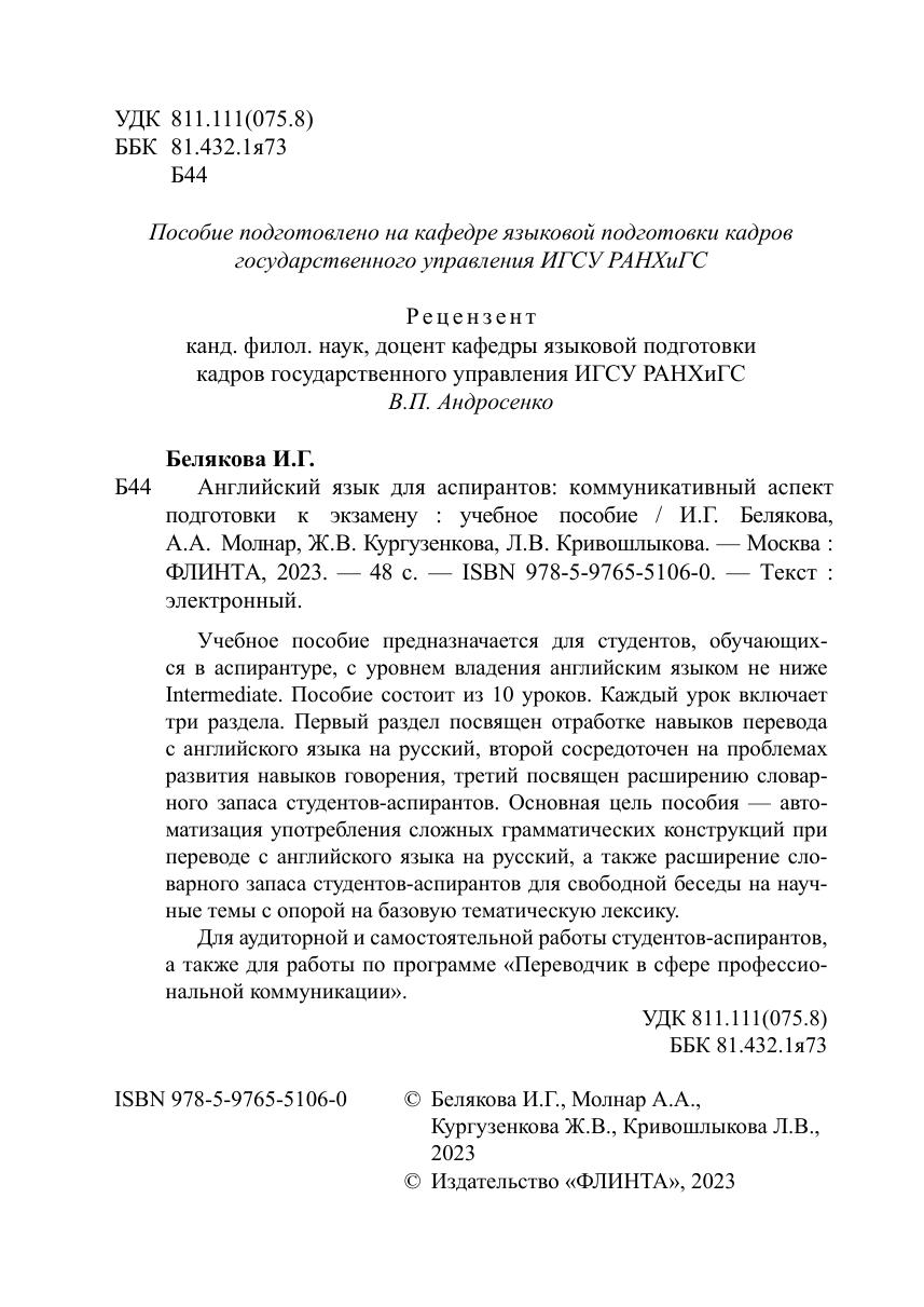 Учебное пособие предназначается для студентов, обучающихся в аспирантуре, с уровнем владения английским языком не ниже Intermediate. Пособие состоит из 10 уроков. Каждый урок включает три раздела. Первый раздел посвящен отработке навыков перевода с английского языка на русский, второй сосредоточен на проблемах развития навыков говорения, третий посвящен расширению словарного запаса студентов-аспирантов. Основная цель пособия — автоматизация употребления сложных грамматических конструкций при переводе с английского языка на русский, а также расширение словарного запаса студентов-аспирантов для свободной беседы на научные темы с опорой на базовую тематическую лексику.