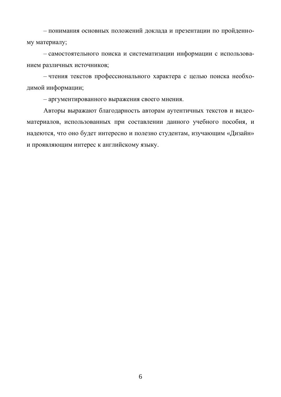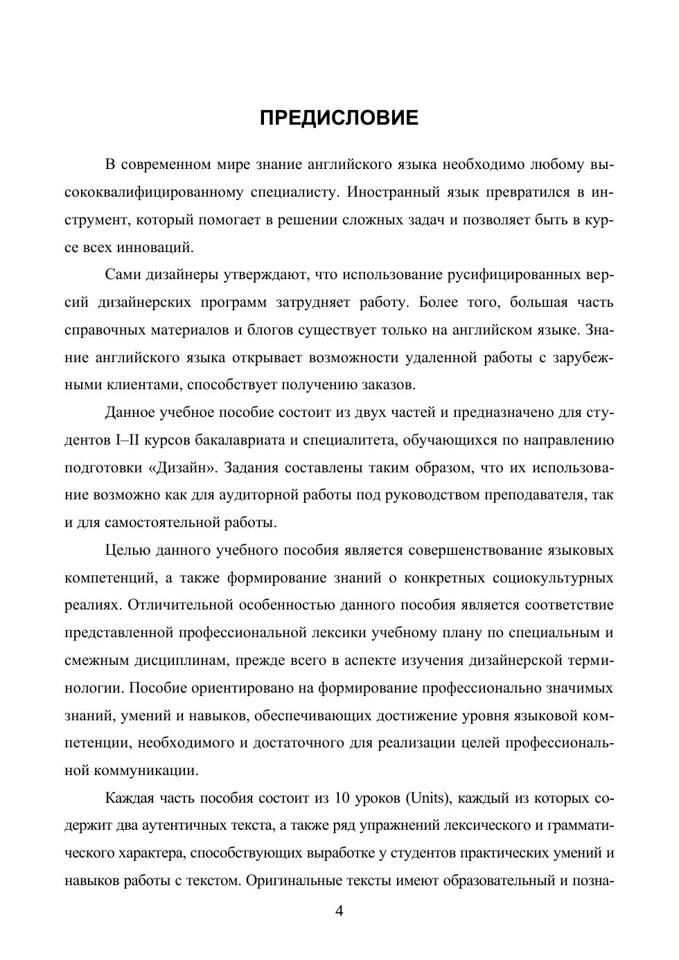 Данное учебное пособие состоит из двух частей, каждая из которых включает 10 уроков (Units), содержащих 2 аутентичных текста, дополняемых упражнениями лексического и грамматического характера. Предложенный принцип подачи материала способствует выработке у студентов практических навыков работы с текстом. Отличительной особенностью пособия является соответствие используемой в нем англоязычной лексики дизайнерской терминологии. Пособие ориентировано на формирование такого уровня знаний и умений, который обеспечивает достижение языковой компетенции, необходимой и достаточной для реализации профессиональной коммуникации. Пособие предназначено для студентов I–II курсов высших учебных заведений, обучающихся по направлению подготовки «Дизайн».