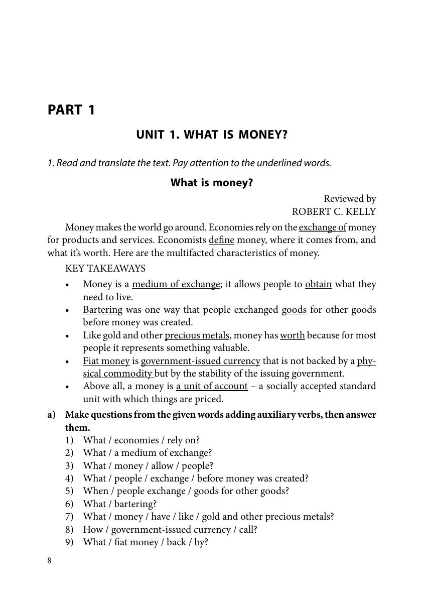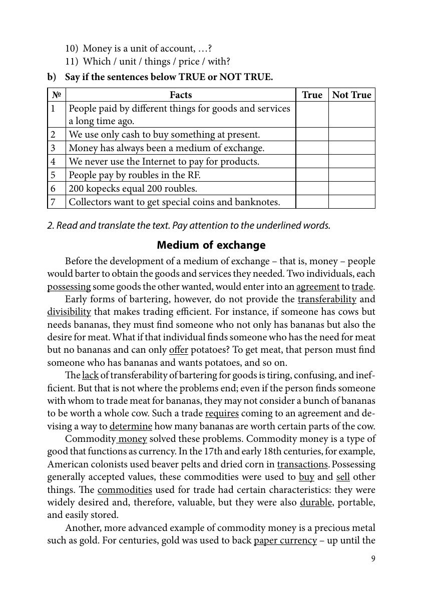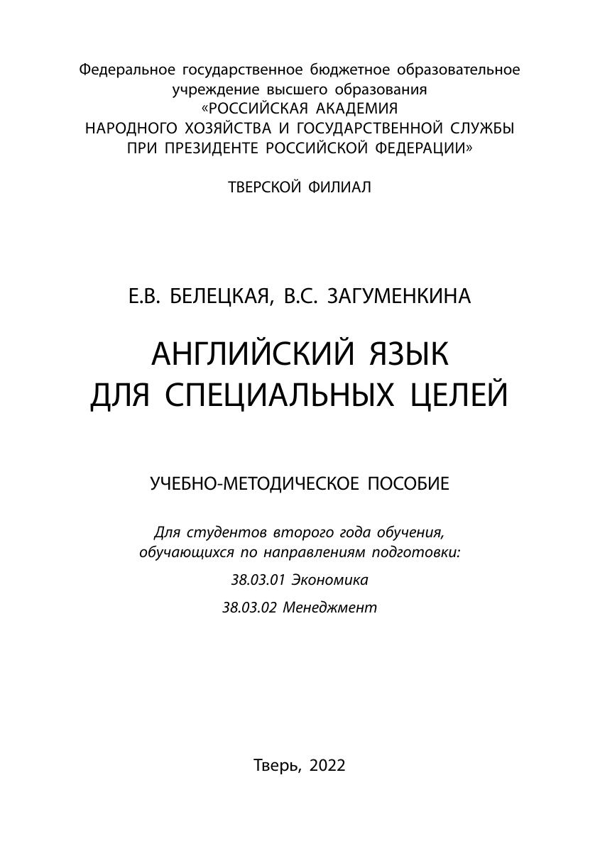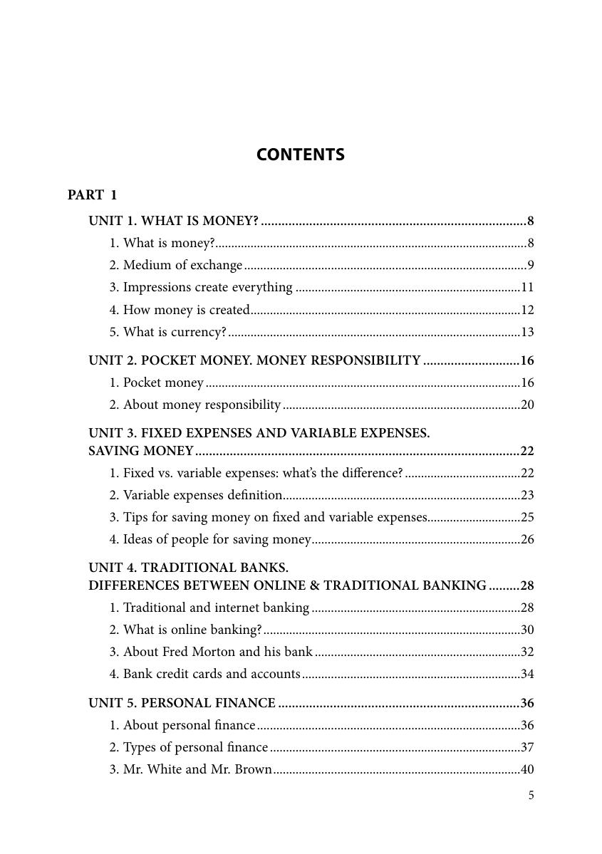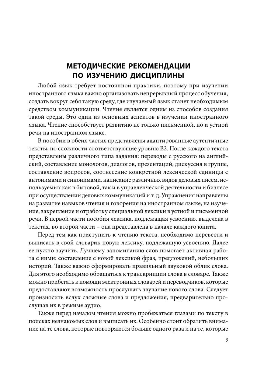 Учебно-методическое пособие предназначено для аудиторной и самостоятельной работы студентов второго курса очной, очно-заочной и заочной форм обучения по направлениям подготовки: 38.03.01 Экономика и 38.03.02 Менеджмент. Основная цель пособия – формирование иноязычной коммуникативной компетенции, необходимой для коммуникации в бытовой и профессиональной сферах деятельности. Пособие состоит из двух частей. Первая часть, состоящая из девяти юнитов, посвящена проработке околопрофессиональных теоретических тем («Деньги. Валюта», «Карманные деньги», «Расходы. Виды расходов», «Банки. Традиционные банки и онлайн-банкинг», «Личные финансы», «Введение в экономику» и др.), составляющих основу профессиональной деятельности специалистов в области управления и экономики. Для каждого юнита разработан соответствующий комплекс упражнений на основе адаптированных аутентичных текстов. Упражнения направлены на развитие навыков чтения и говорения на иностранном языке, на изучение, закрепление и отработку специальной лексики в устной и письменной речи. Целью второй части пособия является обучение основам делового общения в устных и письменных формах. Она содержит пять юнитов, в которых представлены материалы, относящиеся к бытовым и околопрофессиональным темам (рассматриваются структуры компаний, должностные обязанности служащих, формы предпринимательства, проблемы, связанные с приемом на работу и открытием собственного бизнеса). В начале каждого юнита представлена лексика, подлежащая усвоению и активному использованию в устной и письменной речи на основе практических упражнений. Также во второй части предлагаются адаптированные аутентичные тексты, сопровождающиеся упражнениями и коммуникативными заданиями; различные виды деловых писем, используемых как в бытовой, так и в управленческой деятельности и бизнесе при осуществлении деловых коммуникаций.