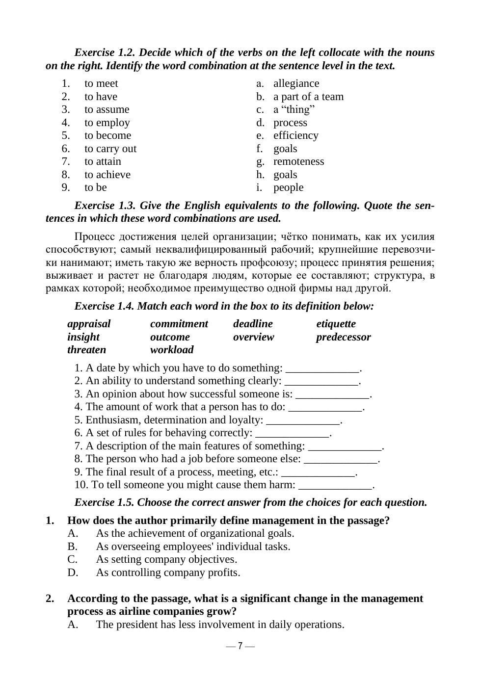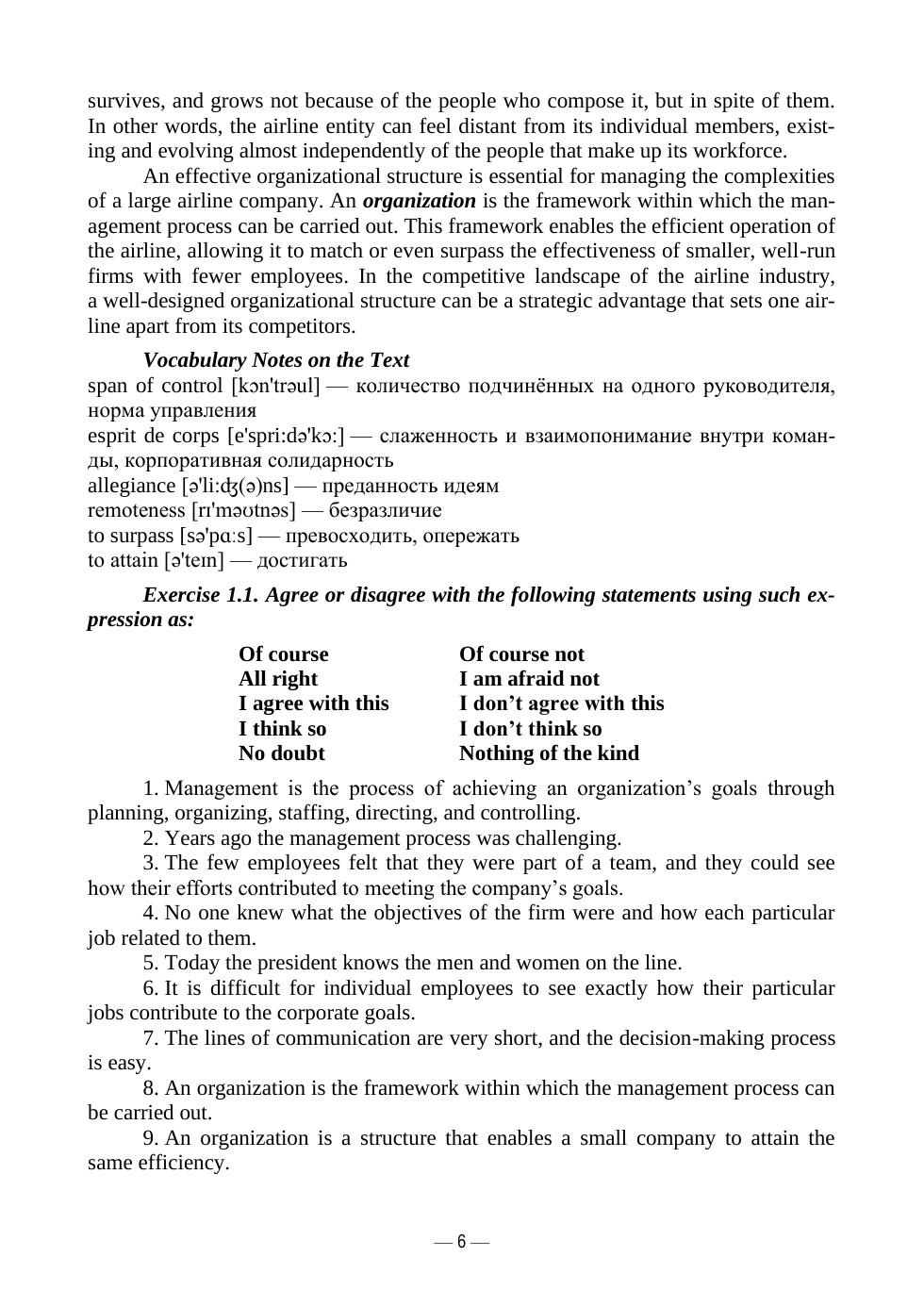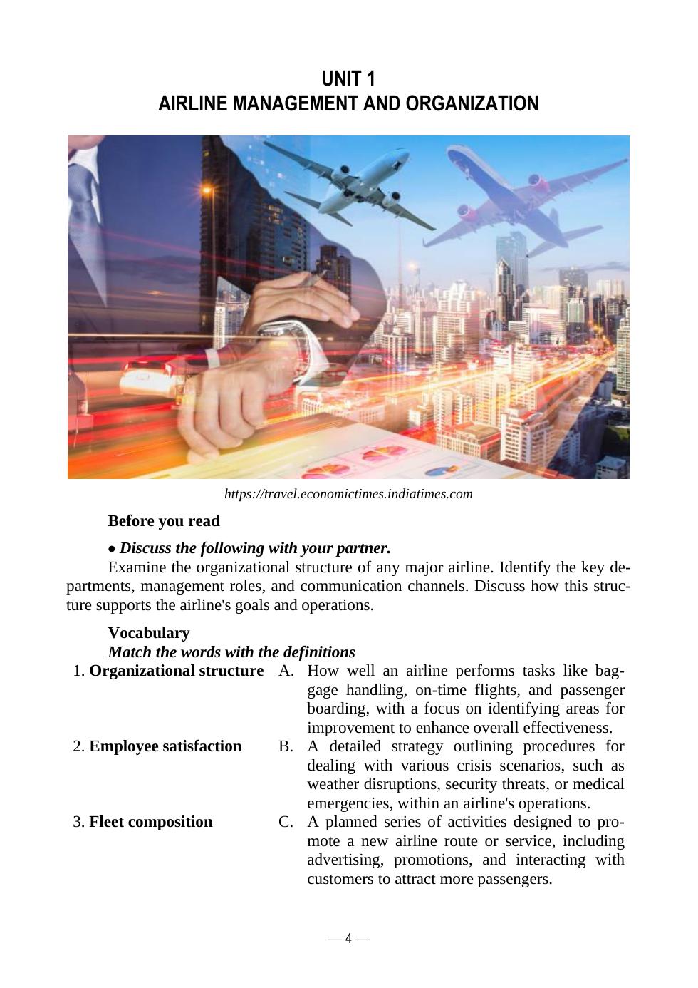 Учебное пособие направлено на развитие профессионально ориентированных навыков общения на английском языке. Оно включает теоретические и практические материалы, необходимые для проведения занятий по таким дисциплинам, как «Иностранный язык для профессионального общения», «Авиационный английский язык». Цель данного пособия — помочь овладеть английским языком в области организации бизнес-процессов в авиационной сфере. Содержание учебного пособия способствует освоению обучающимся профессионально ориентированной лексики и развитию умений адаптировать ее к реальным ситуациям делового общения, чтобы преуспеть в будущей карьере в авиационной сфере. Учебное пособие предназначено для студентов высших учебных заведений I–III курсов по направлению подготовки «Менеджмент» (профиль «Менеджмент на воздушном транспорте») и направлению подготовки «Аэронавигация» (профиль «Организация бизнес-процессов на воздушном транспорте»), а также для самостоятельной работы обучающихся на курсах повышения квалификации.
