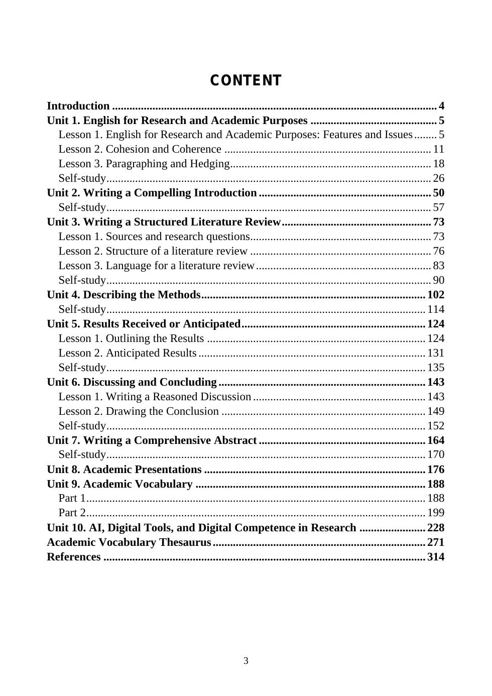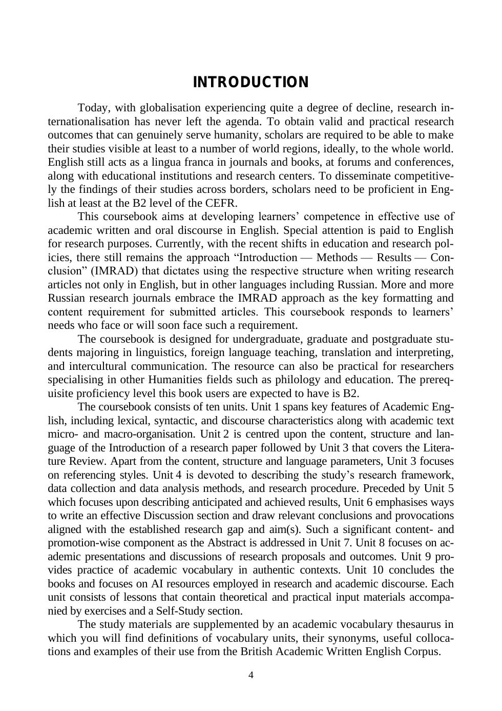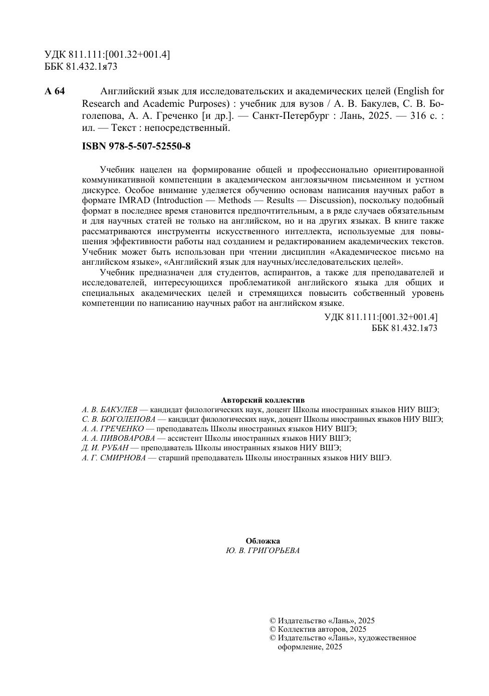 Учебник нацелен на формирование общей и профессионально ориентированной коммуникативной компетенции в академическом англоязычном письменном и устном дискурсе. Особое внимание уделяется обучению основам написания научных работ в формате IMRAD (Introduction — Methods — Results — Discussion), поскольку подобный формат в последнее время становится предпочтительным, а в ряде случаев обязательным и для научных статей не только на английском, но и на других языках. В книге также рассматриваются инструменты искусственного интеллекта, используемые для повышения эффективности работы над созданием и редактированием академических текстов. Учебник может быть использован при чтении дисциплин «Академическое письмо на английском языке», «Английский язык для научных/исследовательских целей». Учебник предназначен для студентов, аспирантов, а также для преподавателей и исследователей, интересующихся проблематикой английского языка для общих и специальных академических целей и стремящихся повысить собственный уровень компетенции по написанию научных работ на английском языке.