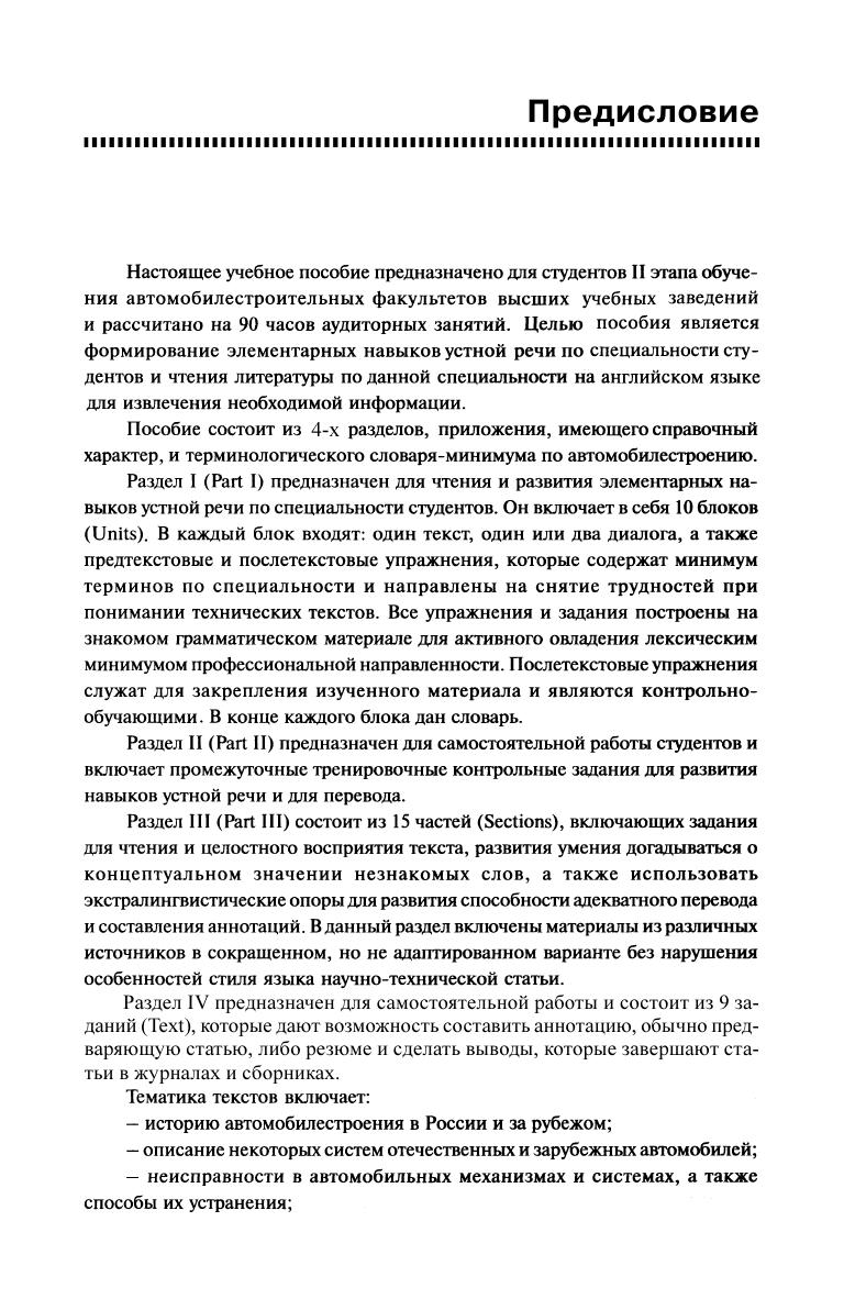 Целью данного учебного пособия является развитие навыков устной речи и чтения технической литературы автотранспортного профиля на английском языке. Тексты скомнанованы тематически и дают представление об устройстве автомобиля, его основных узлах и механизмах. В книгу включены грамматический справочник, список наиболее употребительных союзов, предлогов и наречий, список нестандартных глаголов и англо-русский терминологический словарь. Пособие предназначено для студентов автотранспортных специальностей высших учебных заведений, также может быть рекомендовано работникам автосервисов и инженерам.