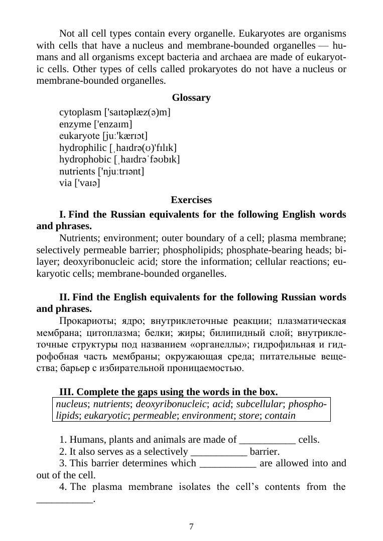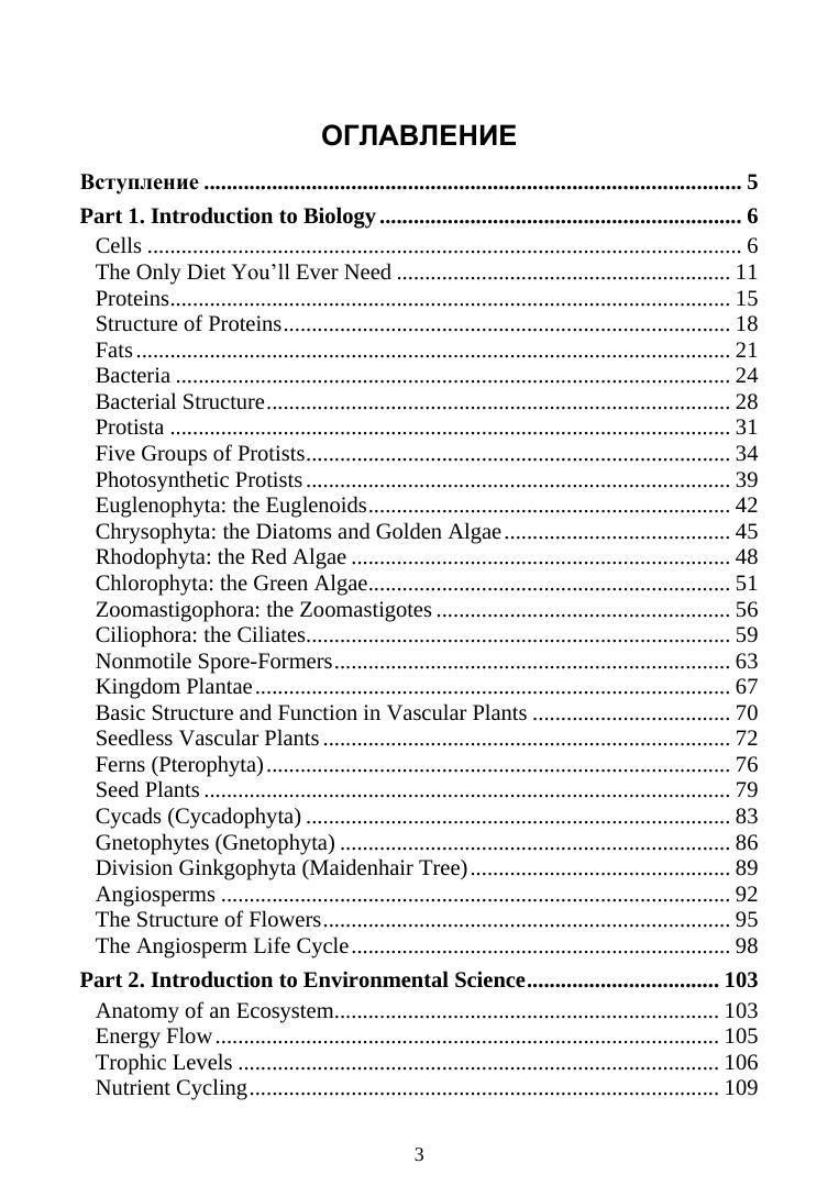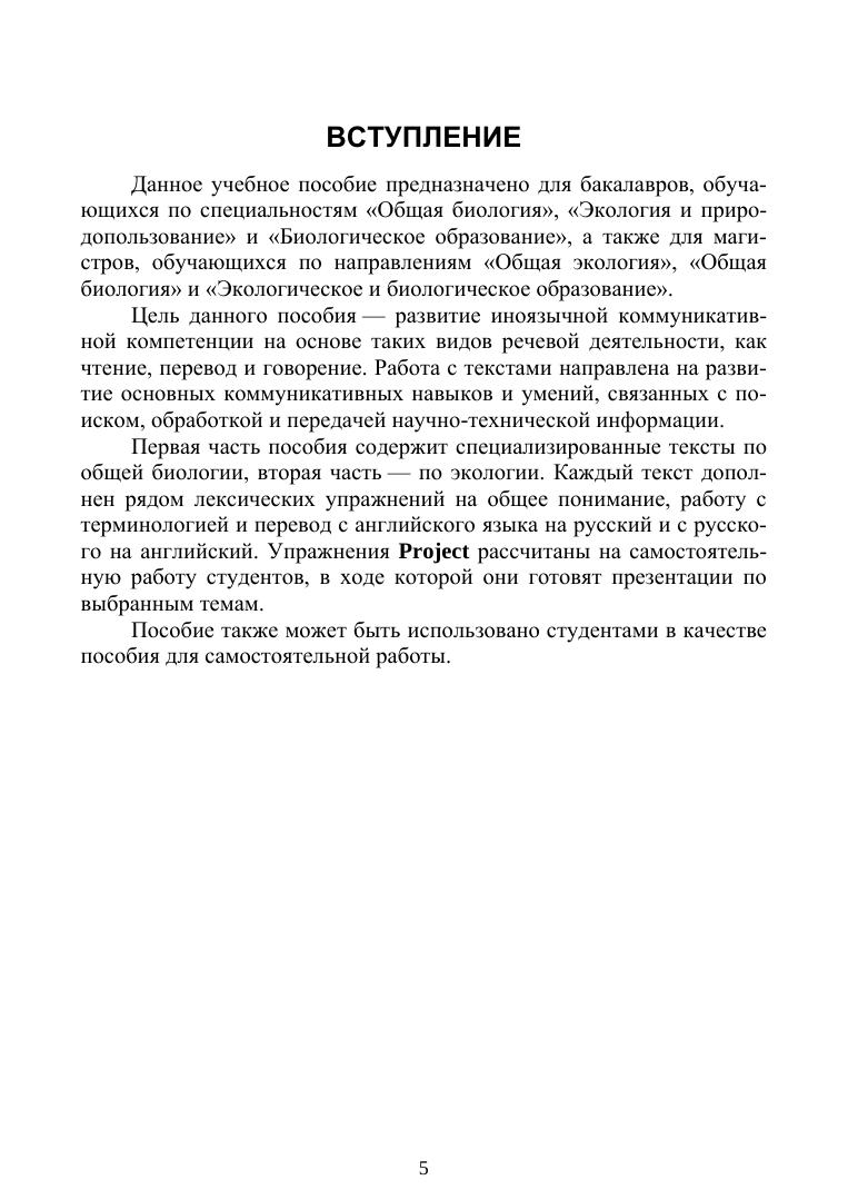 Цель данного пособия — развитие иноязычной коммуникативной компетенции на основе таких видов речевой деятельности, как чтение, перевод и говорение. Пособие содержит специализированные тексты по общей биологии, протистологии, ботанике, а также экологии и природопользованию. Каждый текст дополнен рядом лексических упражнений на общее понимание, работу с терминологией и перевод с английского на русский и с русского на английский. Упражнения в разделе “Project” рассчитаны на самостоятельную работу студентов, в ходе которой они готовят презентации по выбранным темам. Учебное пособие предназначено для студентов вузов, обучающихся по биологическим и экологическим направлениям подготовки, а также может быть использовано студентами, изучающими природопользование.