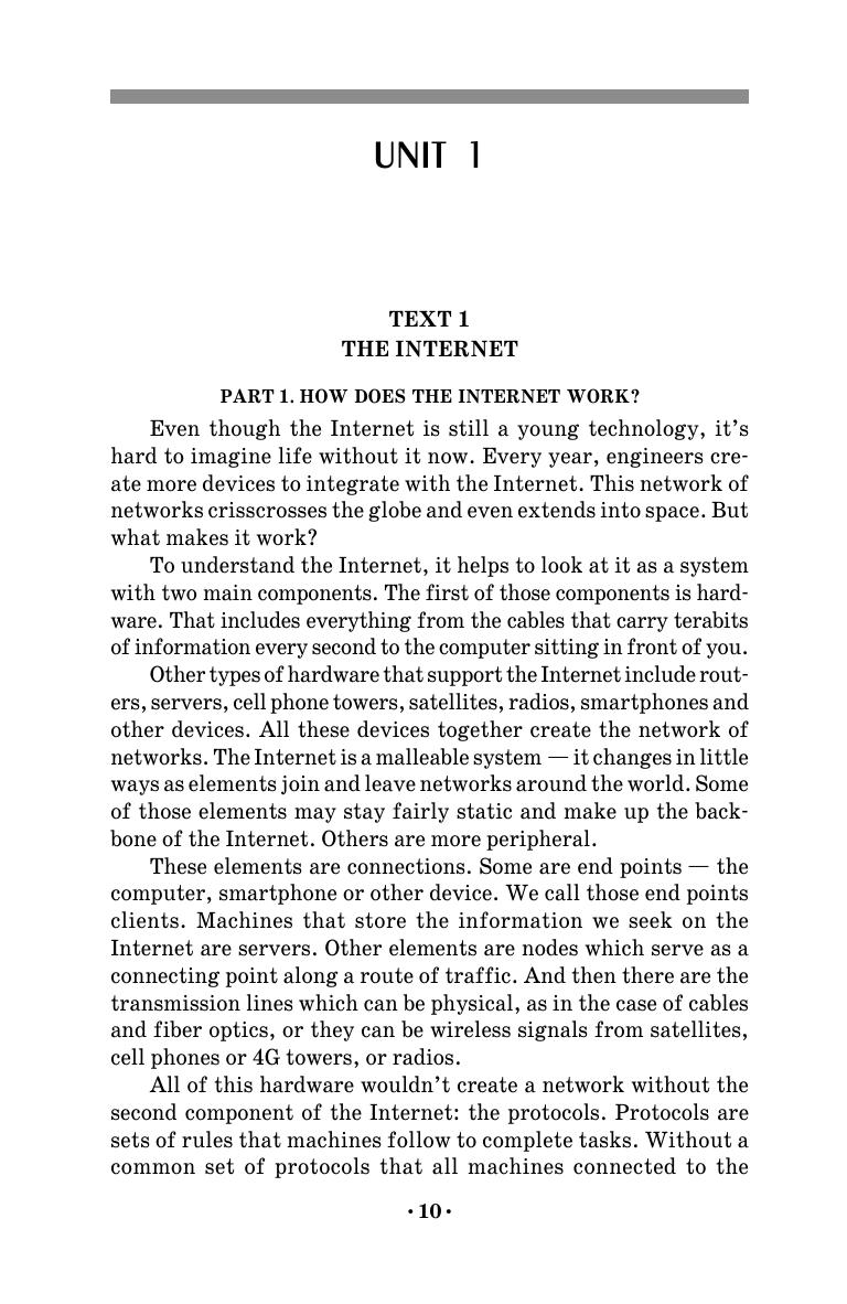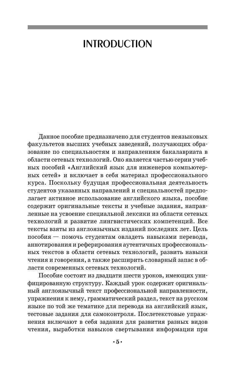 Данное учебное пособие предназначено для изучения английского языка в области сетевых технологий. Книга содержит оригинальные тексты профессиональной направленности и задания, способствующие усвоению и запоминанию специальной лексики из области сетевых технологий, задания для развития навыков чтения, свертывания информации при составлении рефератов на английском языке, а также формирования коммуникативных компетенций в условиях профессионального общения. Пособие рассчитано на студентов, обучающихся по специальности «Сети связи и системы коммутации» и направлению подготовки бакалавриата «Инфокоммуникационные технологии и системы связи», а также всех тех, кто изучает структуру и функционирование локальных вычислительных сетей и глобальной сети Интернет и заинтересован в совершенствовании английского языка в указанной области. Пособие может быть использовано для организации самостоятельной работы студентов.