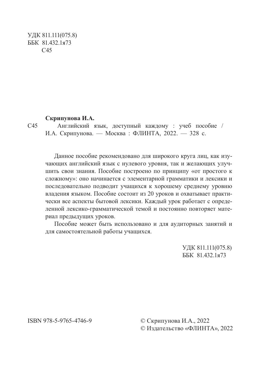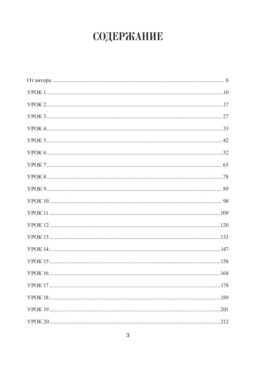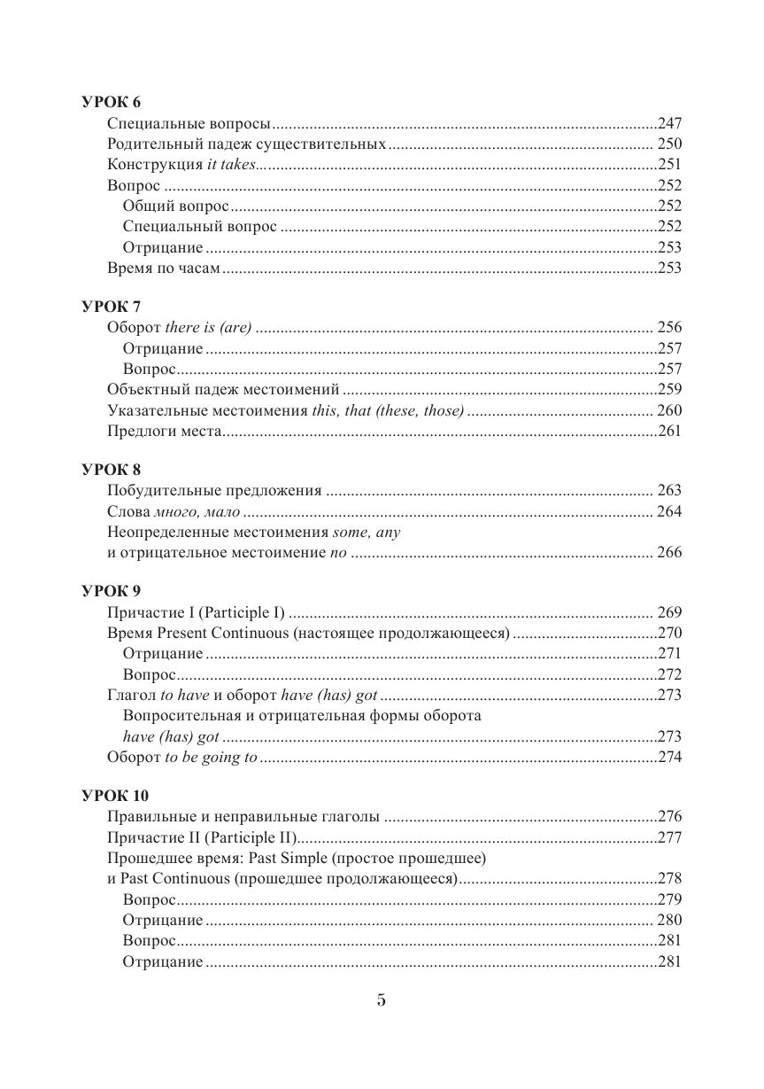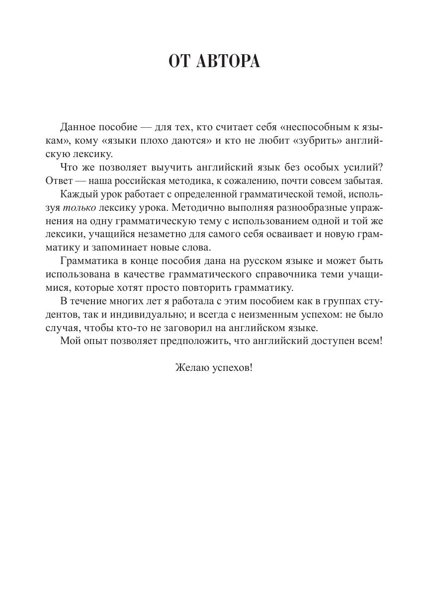 Данное пособие рекомендовано для широкого круга лиц, как изучающих английский язык с нулевого уровня, так и желающих улучшить свои знания. Пособие построено по принципу «от простого к сложному»: оно начинается с элементарной грамматики и лексики и последовательно подводит учащихся к хорошему среднему уровню владения языком. Пособие состоит из 20 уроков и охватывает практически все аспекты бытовой лексики. Каждый урок работает с определенной лексико-грамматической темой и постоянно повторяет материал предыдущих уроков.