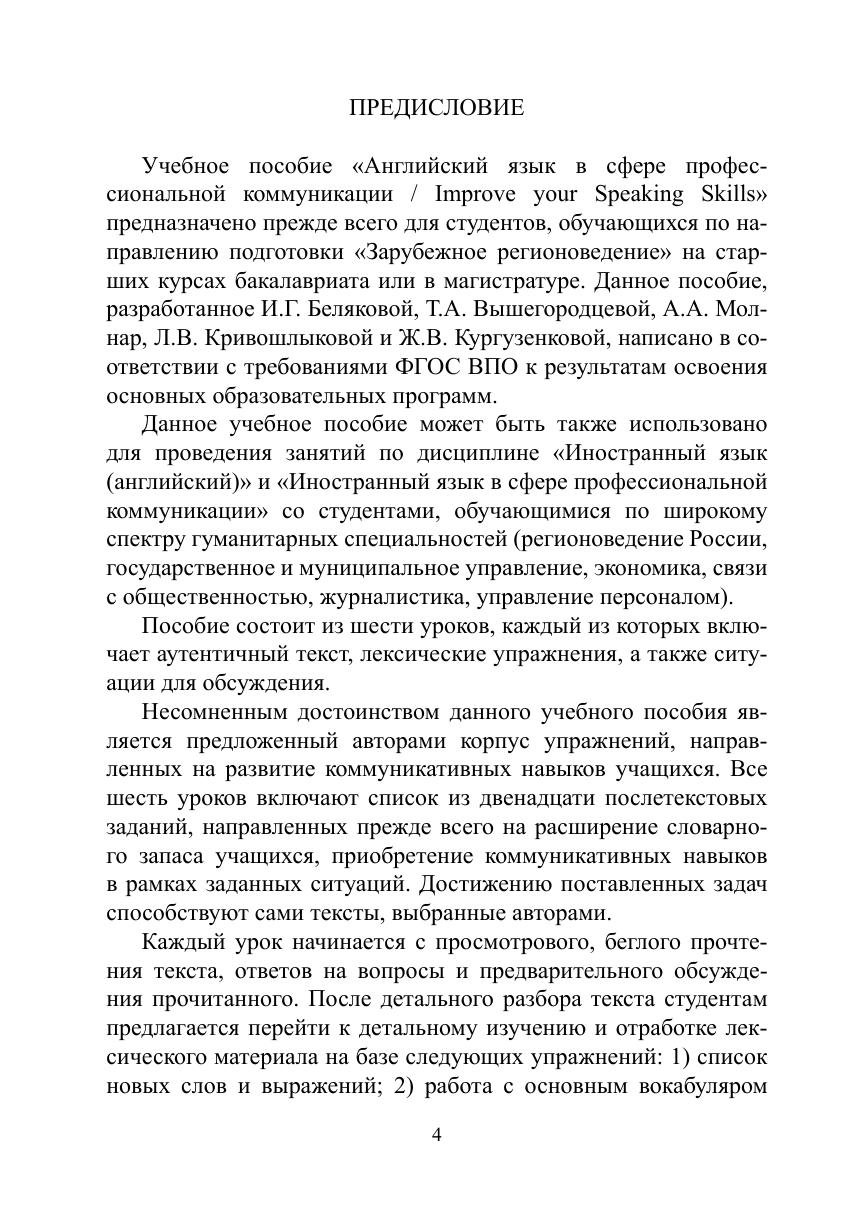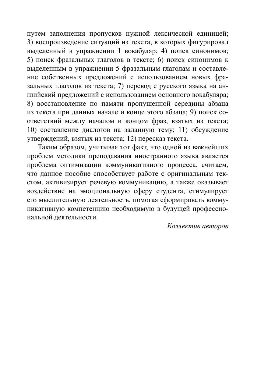 Основная цель пособия — автоматизация употребления новых лексических единиц, расширение словарного запаса студентов для свободной профессиональной коммуникации с опорой на базовую тематическую лексику. Пособие состоит из шести уроков. Каждый урок включает три раздела. Первый раздел — это вопросы для обсуждения после просмотрового, ознакомительного прочтения текста урока. Второй раздел посвящен отработке нового лексического материала, взятого из оригинальных текстов, на различных типах лексических упражнений. Третий раздел сосредоточен на развитии коммуникативной компетенции студентов. Для аудиторной и самостоятельной работы студентов-регионоведов, обучающихся на старших курсах бакалавриата или магистратуры, с уровнем владения английским языком не ниже Intermediate, а также для работы по программе «Переводчик в сфере профессиональной коммуникации».