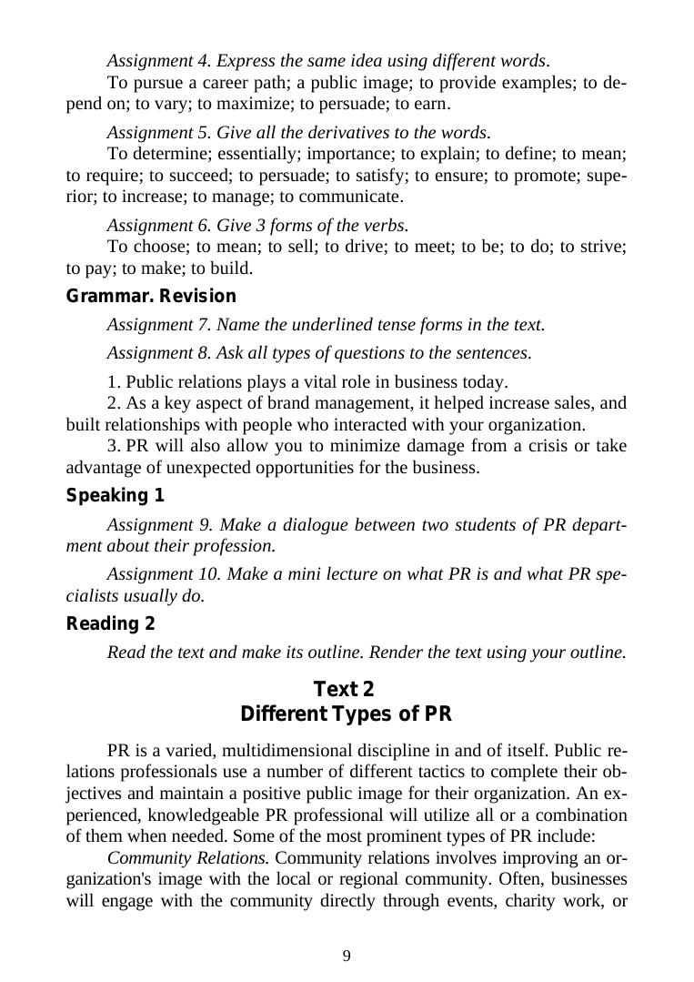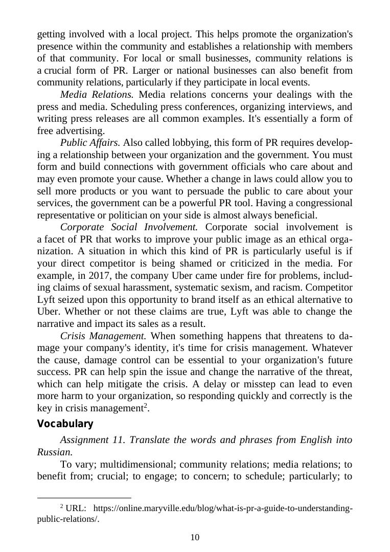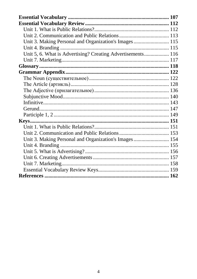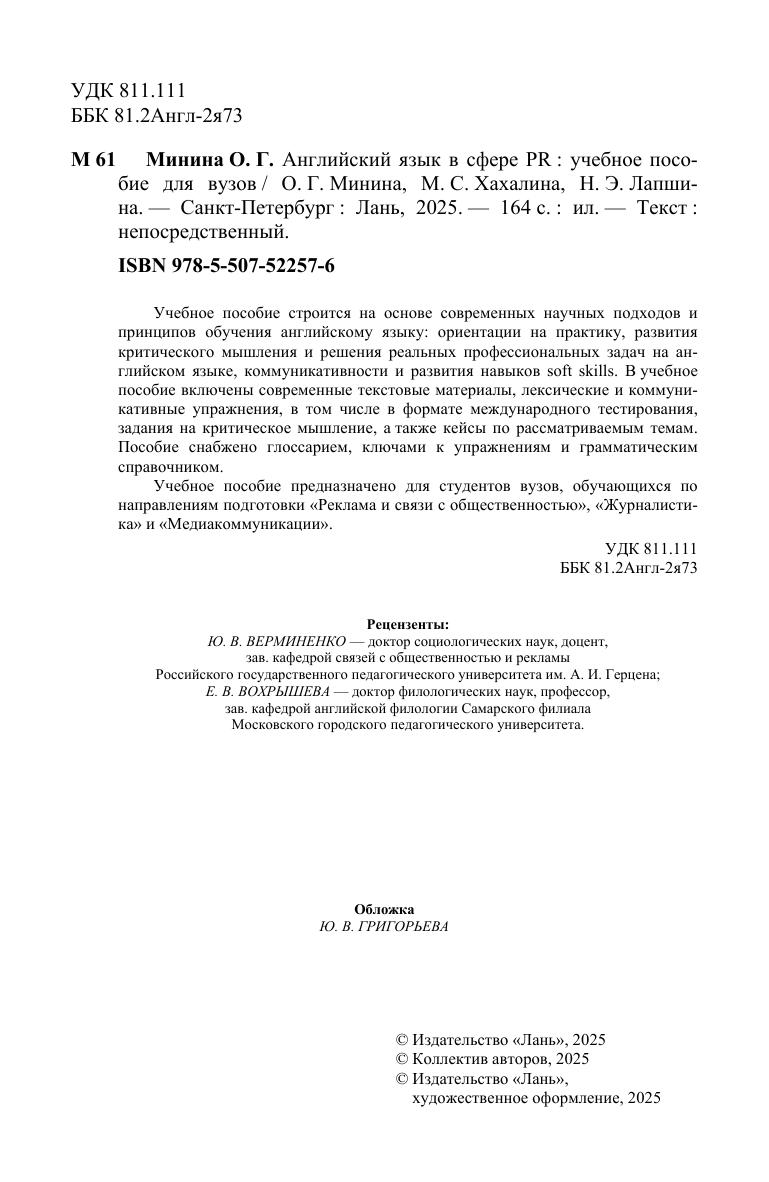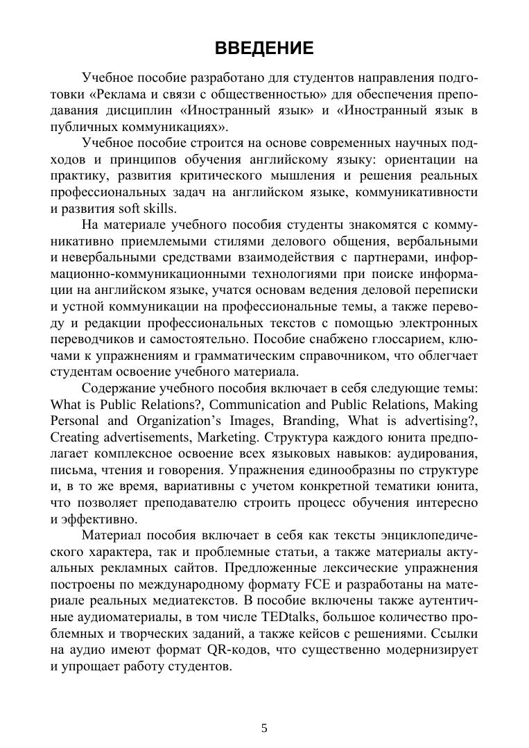 Учебное пособие строится на основе современных научных подходов и принципов обучения английскому языку: ориентации на практику, развития критического мышления и решения реальных профессиональных задач на английском языке, коммуникативности и развития навыков soft skills. В учебное пособие включены современные текстовые материалы, лексические и коммуникативные упражнения, в том числе в формате международного тестирования, задания на критическое мышление, а также кейсы по рассматриваемым темам. Пособие снабжено глоссарием, ключами к упражнениям и грамматическим справочником. Учебное пособие предназначено для студентов вузов, обучающихся по направлениям подготовки «Реклама и связи с общественностью», «Журналистика» и «Медиакоммуникации».