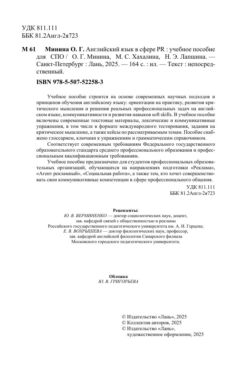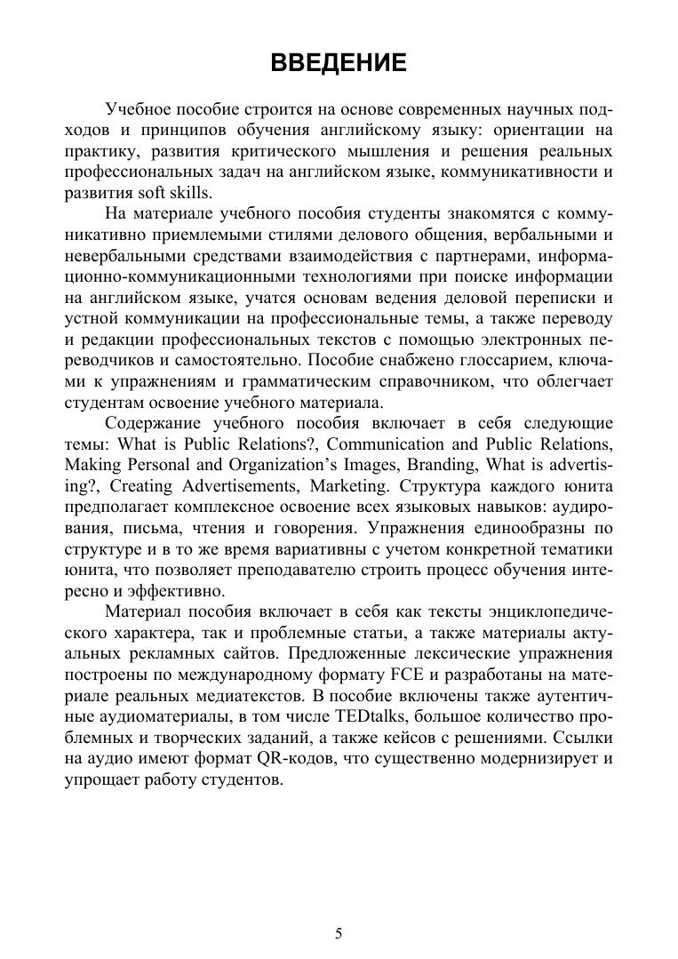Учебное пособие строится на основе современных научных подходов и принципов обучения английскому языку: ориентации на практику, разви-тия критического мышления и решения реальных профессиональных задач на английском языке, коммуникативности и развития навыков soft skills. В учебное пособие включены современные текстовые материалы, лексические и коммуникативные упражнения, в том числе в формате международного тестирования, задания на критическое мышление, а также кейсы по рассматриваемым темам. Пособие снабжено глоссарием, ключами к упражнениям и грамматическим справочником. Соответствует современным требованиям Федерального государственного образовательного стандарта среднего профессионального образования и профессиональным квалификационным требованиям. Учебное пособие предназначено для студентов профессиональных образовательных организаций, обучающихся на направлениях подготовки «Реклама», «Агент рекламный», «Социальная работа», а также тем, кто хочет совершенствовать свои коммуникативные компетенции в сфере профессионального общения.