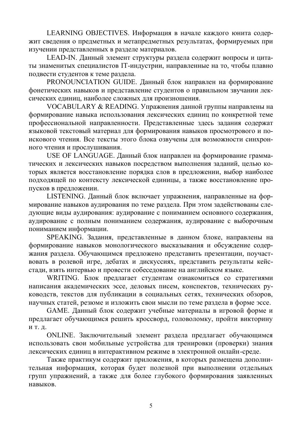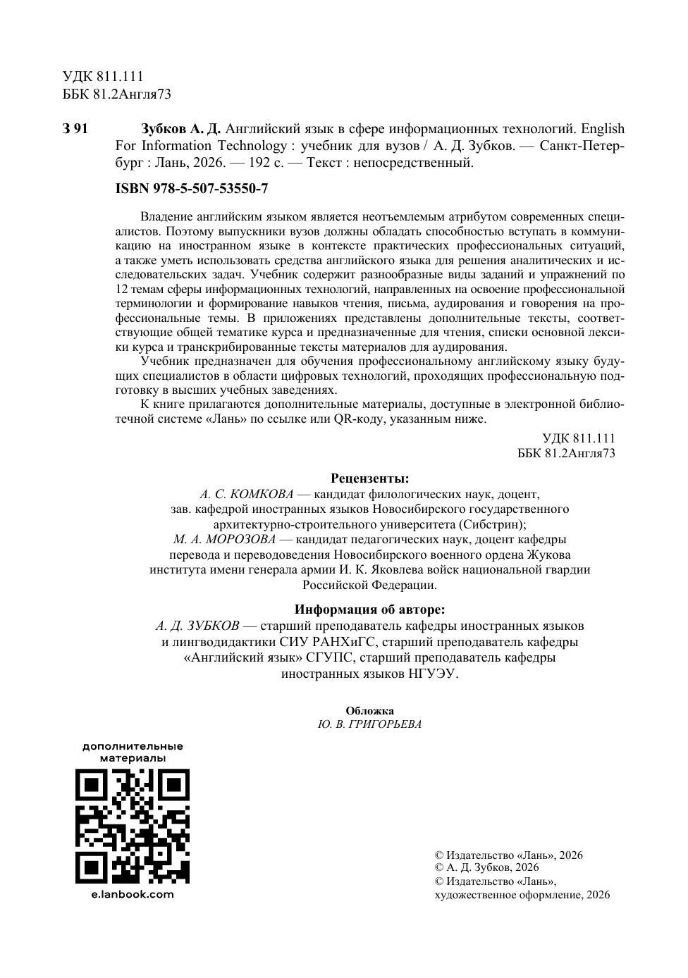 Владение английским языком является неотъемлемым атрибутом современных специалистов. Поэтому выпускники вузов должны обладать способностью вступать в коммуникацию на иностранном языке в контексте практических профессиональных ситуаций, а также уметь использовать средства английского языка для решения аналитических и исследовательских задач. Учебник содержит разнообразные виды заданий и упражнений по 12 темам сферы информационных технологий, направленных на освоение профессиональной терминологии и формирование навыков чтения, письма, аудирования и говорения на профессиональные темы. В приложениях представлены дополнительные тексты, соответствующие общей тематике курса и предназначенные для чтения, списки основной лексики курса и транскрибированные тексты материалов для аудирования. Учебник предназначен для обучения профессиональному английскому языку будущих специалистов в области цифровых технологий, проходящих профессиональную подготовку в высших учебных заведениях. К книге прилагаются дополнительные материалы, доступные в электронной библиотечной системе «Лань» по ссылке или QR-коду, указанным ниже.