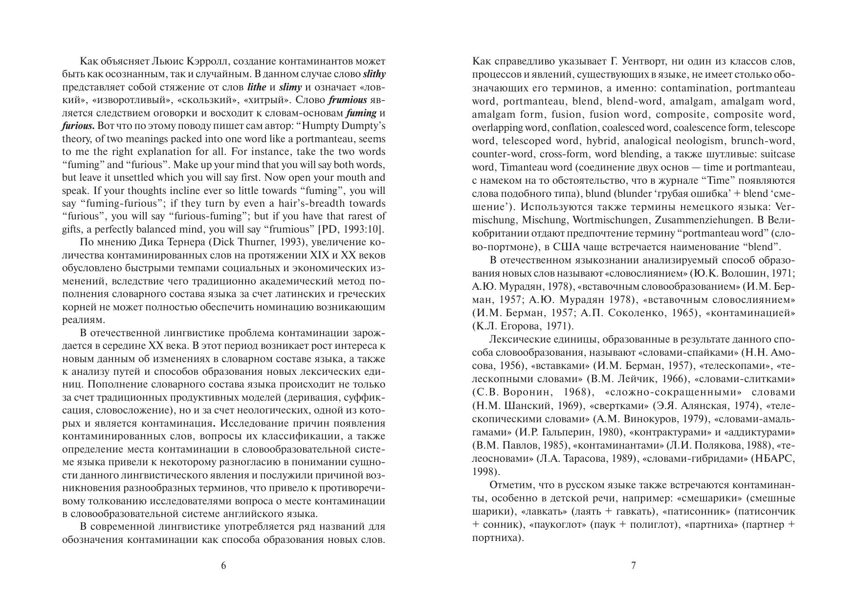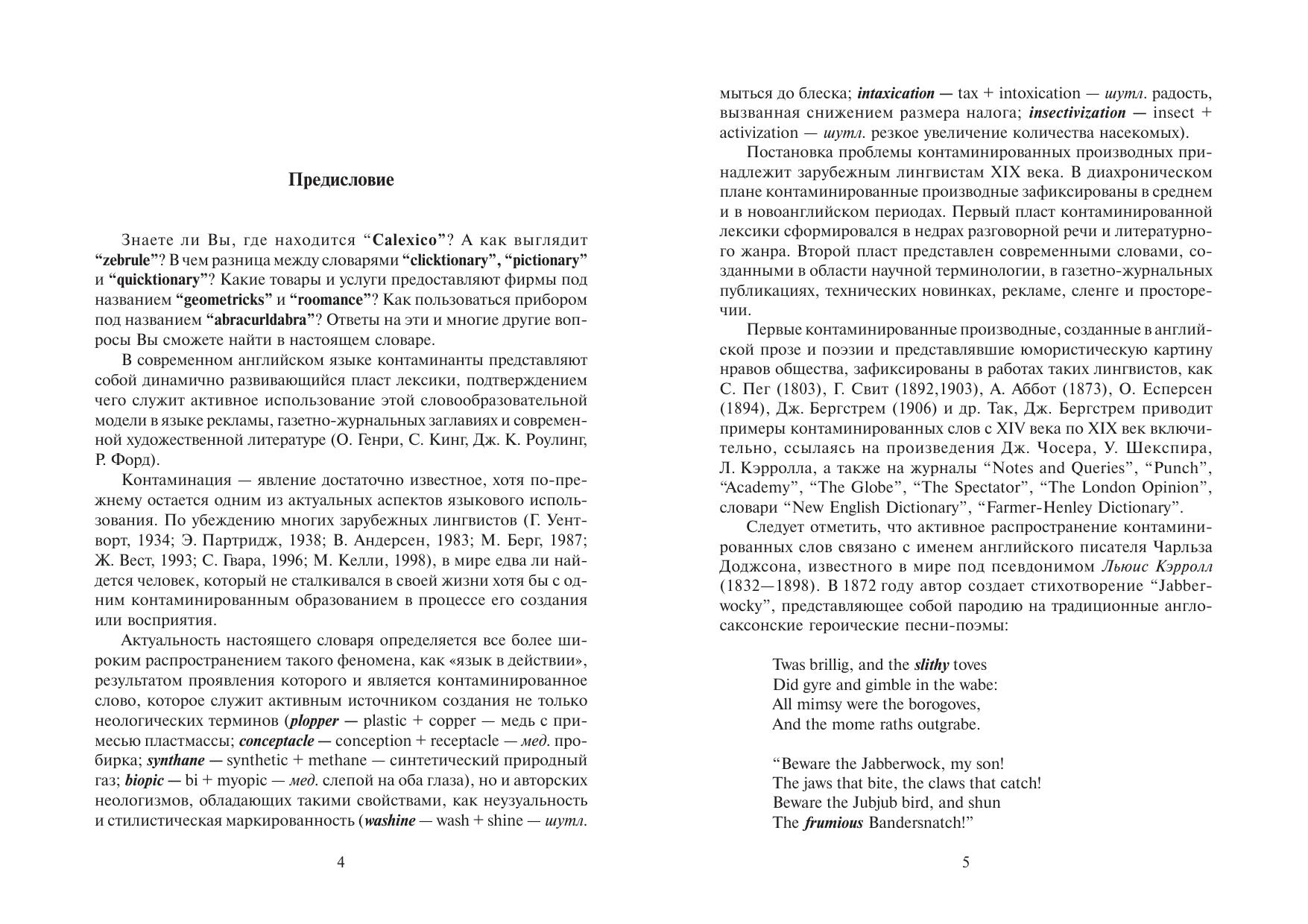 Одной из тенденций в современном английском языке является активное использование контаминации как продуктивной словообразовательной модели, в результате чего возникают контаминанты, также известные в лингвистике как словапортмоне, слова-телескопы, слова-гибриды, например Cinderelative (Cinderella + relative), netiquette (net + etiquette), rainbrella (rain + umbrella). Настоящий словарь содержит контаминанты с нейтральной стилистической окраской, контаминанты-термины, сленгизмы, жаргонизмы, разговорные слова; многочисленную группу составляют контаминанты, традиционно не фиксируемые словарными источниками и отобранные из англо-американских периодических изданий, художественной литературы и рекламы.