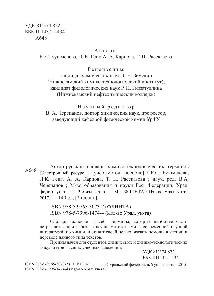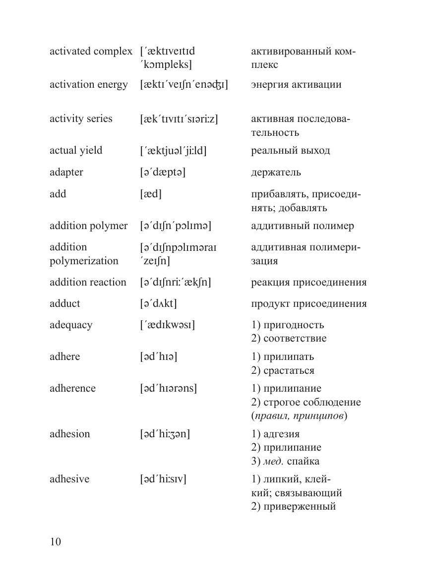 Словарь включает в себя термины, которые наиболее часто встречаются при работе с научными статьями и современной научной литературой по химии, и ставит своей целью оказать помощь в чтении и переводе данного типа текстов. Предназначен для студентов химических и химико-технологических факультетов высших учебных заведений.
