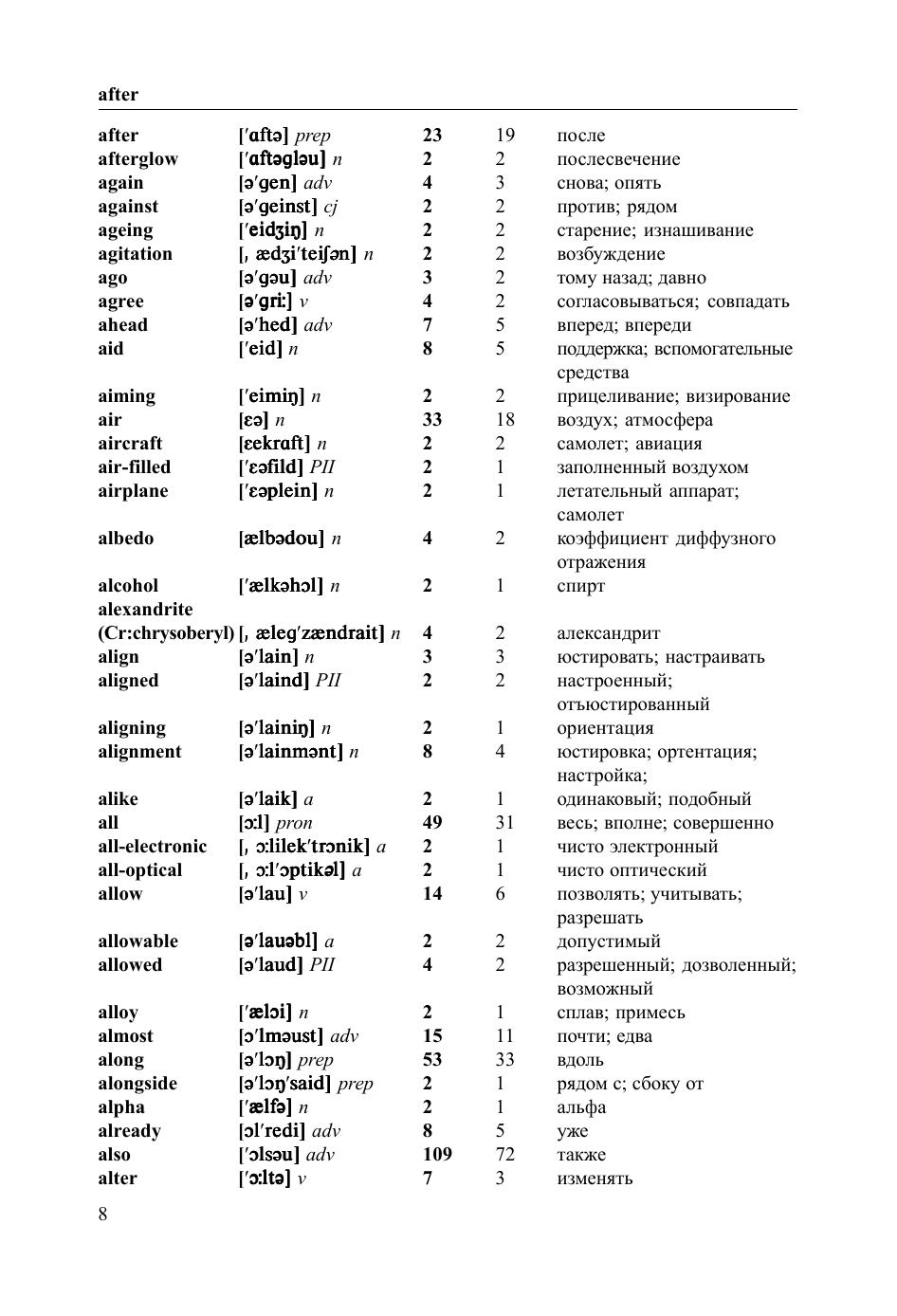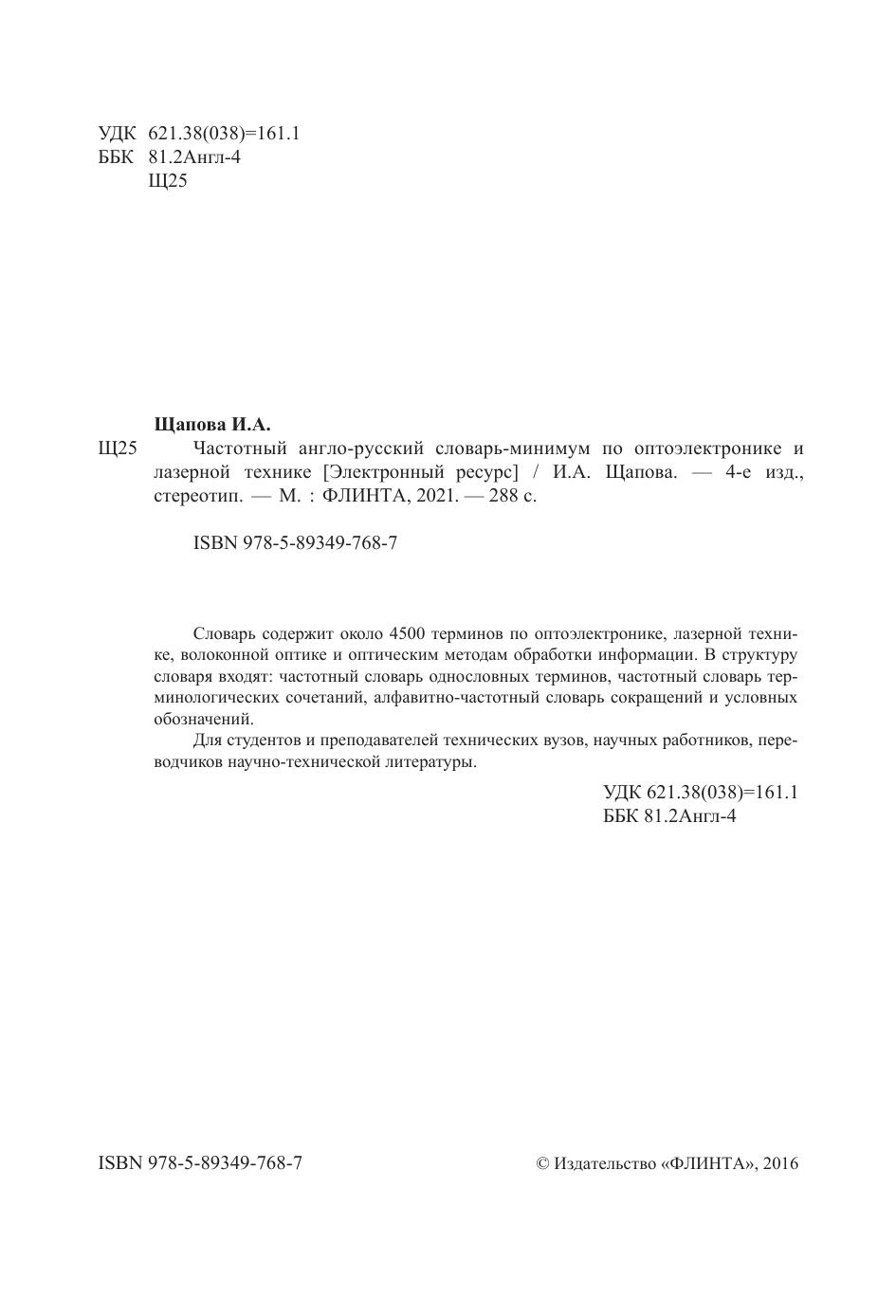 Словарь содержит около 4500 терминов по оптоэлектронике, лазерной технике, волоконной оптике и оптическим методам обработки информации. В структуру словаря входят: частотный словарь однословных терминов, частотный словарь терминологических сочетаний, алфавитно-частотный словарь сокращений и условных обозначений. Для студентов и преподавателей технических вузов, научных работников, переводчиков научно-технической литературы.