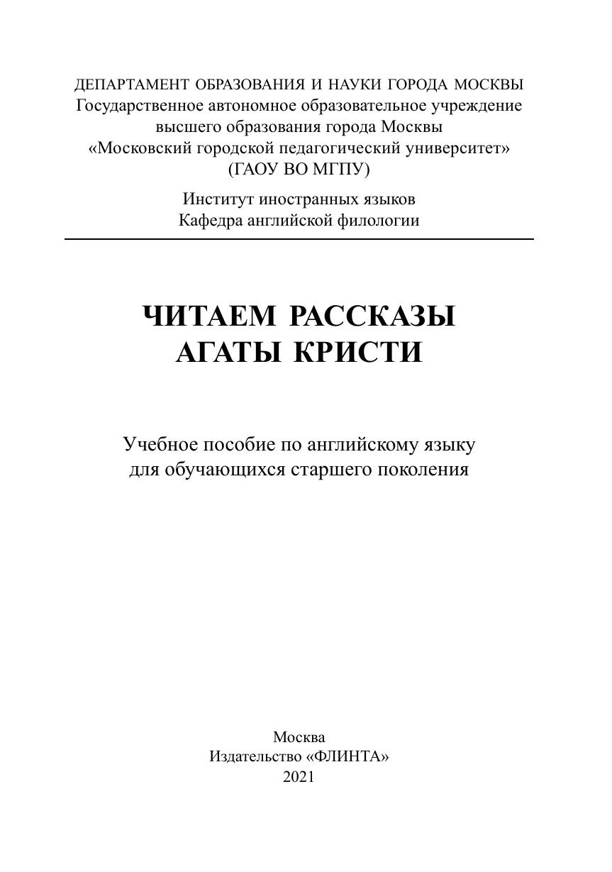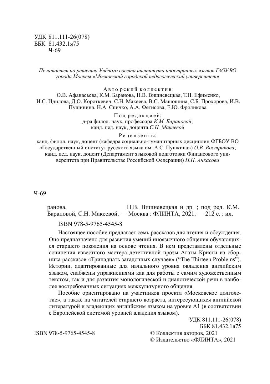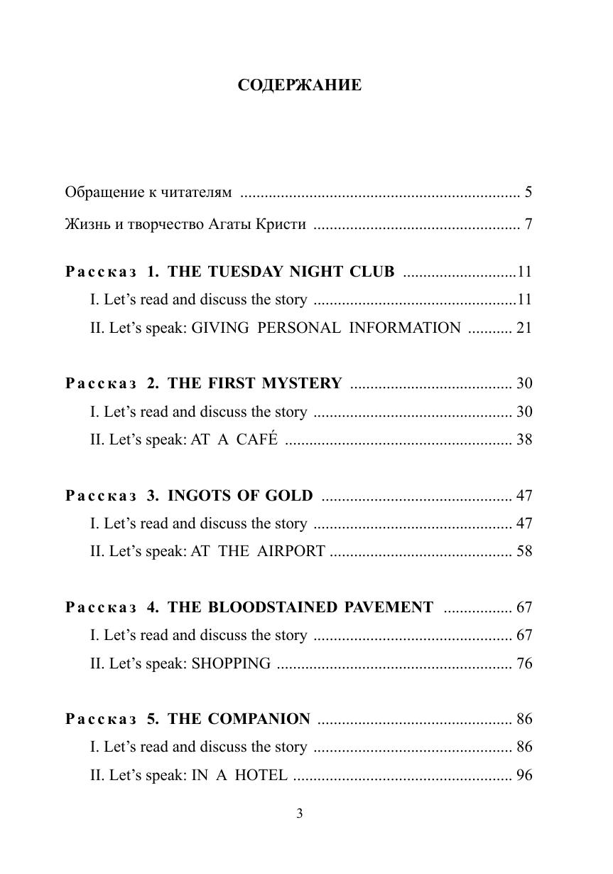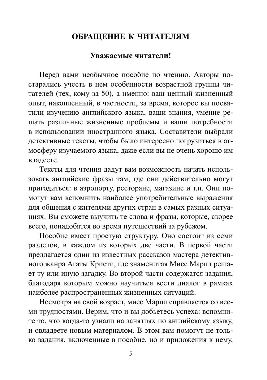 Настоящее пособие предлагает семь рассказов для чтения и обсуждения. Оно предназначено для развития умений иноязычного общения обучающихся старшего поколения на основе чтения. В нем представлены отдельные сочинения известного мастера детективной прозы Агаты Кристи из сборника рассказов «Тринадцать загадочных случаев» (“The Thirteen Problems”). Истории, адаптированные для начального уровня овладения английским языком, снабжены упражнениями как для работы с самим художественным текстом, так и для развития монологической и диалогической речи в наиболее востребованных ситуациях межкультурного общения.