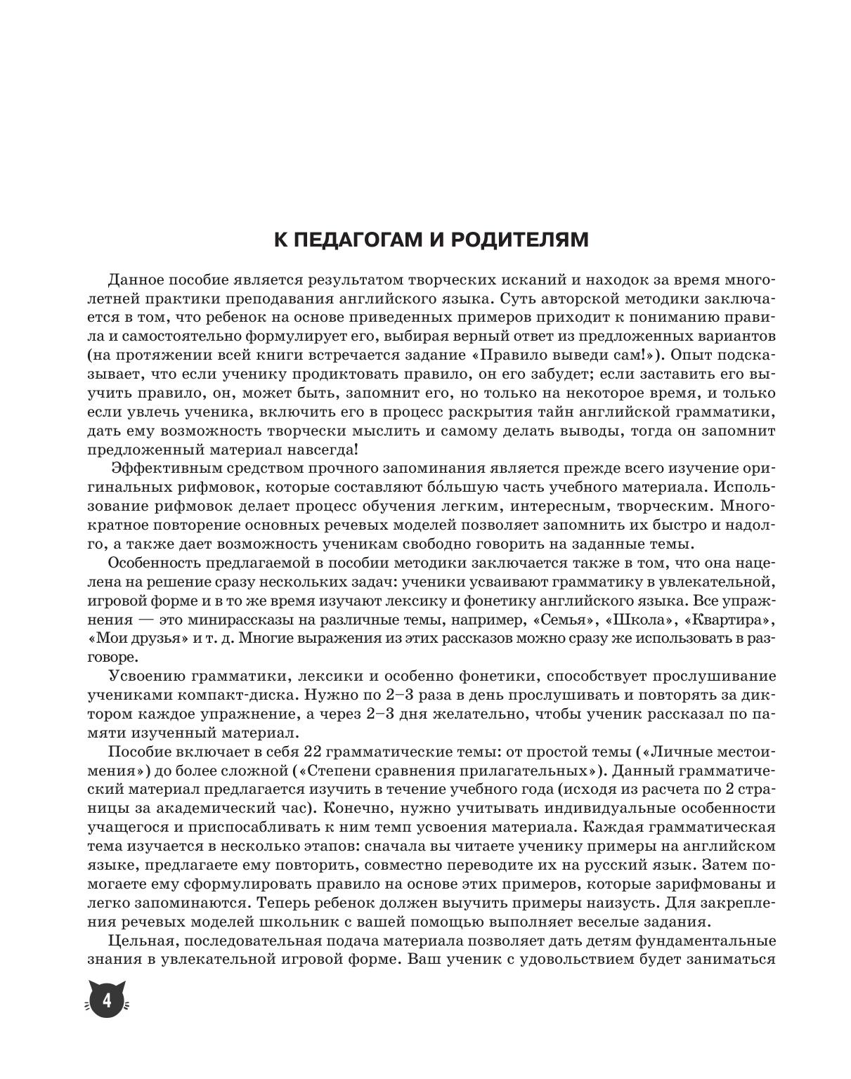 Светлана Васильевна Фурсенко предлагает младшим школьникам свой путь освоения английской грамматики. На этом пути верными союзниками учеников станут стихотворения, шутки, рифмовки и творческие задания. С их помощью ребята не только знакомятся с грамматическими конструкциями и примерами, но и на основе наблюдений формулируют правило, то есть самостоятельно осваивают и запоминают законы английского языка. Таким образом процесс обучения превращается в увлекательную игру, а новые знания ребята тут же используют на практике. Прослушивание компакт-диска с записью рифмовок и ключей к большинству упражнений поможет детям быстро освоить правила и научиться воспринимать английскую речь на слух.