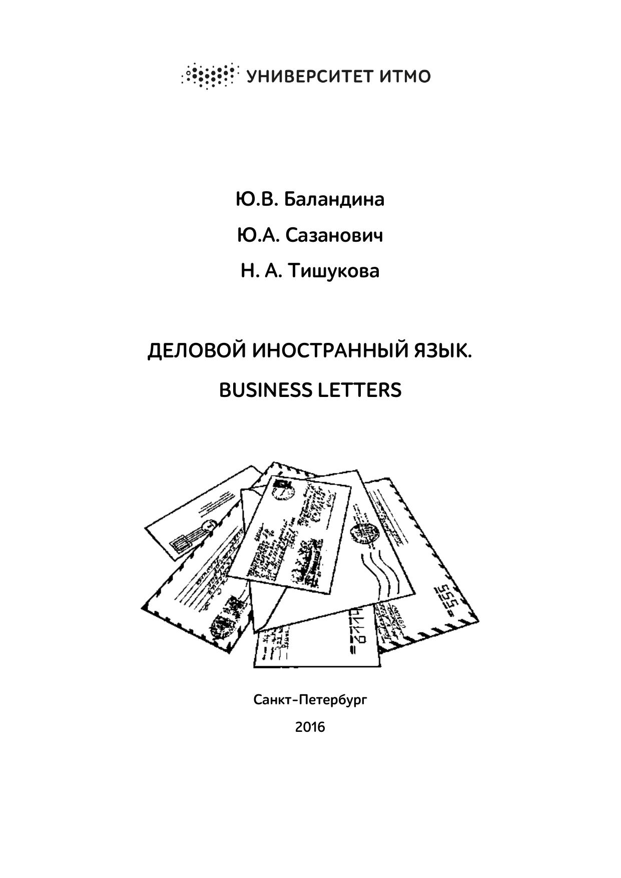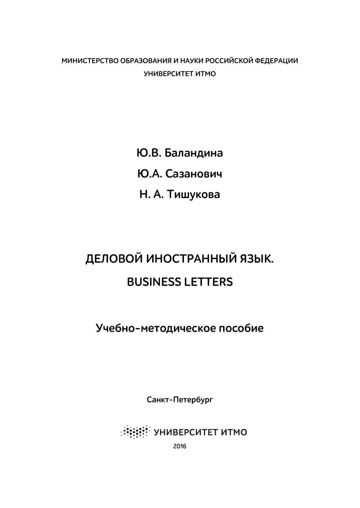 Учебно-методическое пособие «Деловой иностранный язык. Business Letters» предназначено для изучения делового английского языка студентами всех факультетов. Пособие может быть использовано как на аудиторных занятиях, так и для самостоятельной работы студентов.