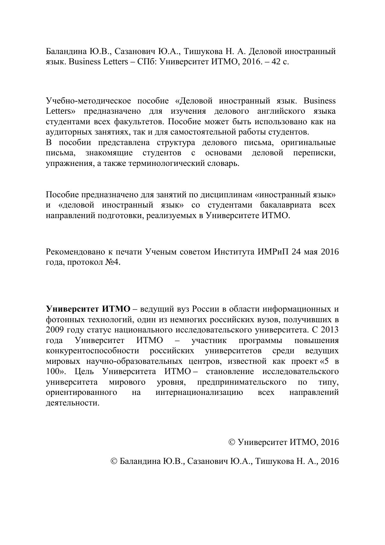 Пособие предназначено для занятий по дисциплинам «иностранный язык» и «деловой иностранный язык» со студентами бакалавриата всех направлений подготовки, реализуемых в Университете ИТМО.