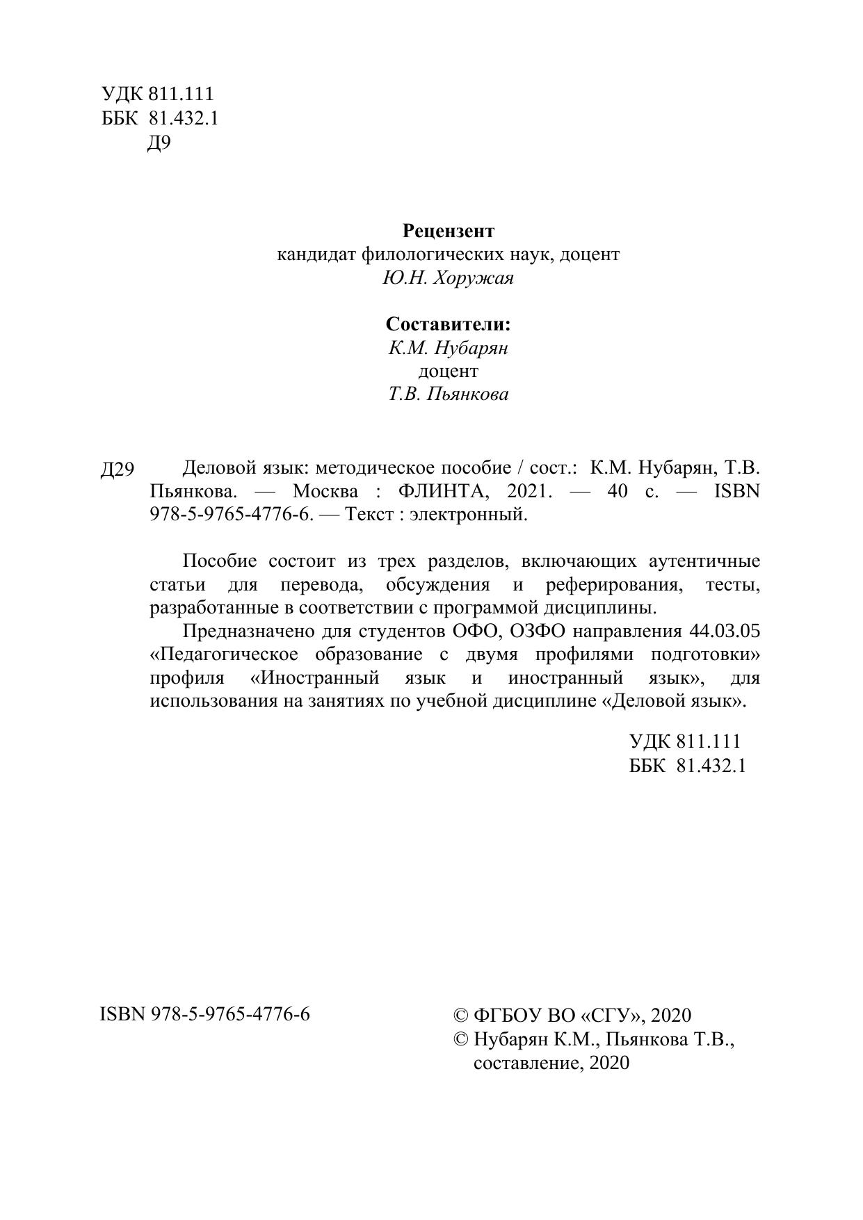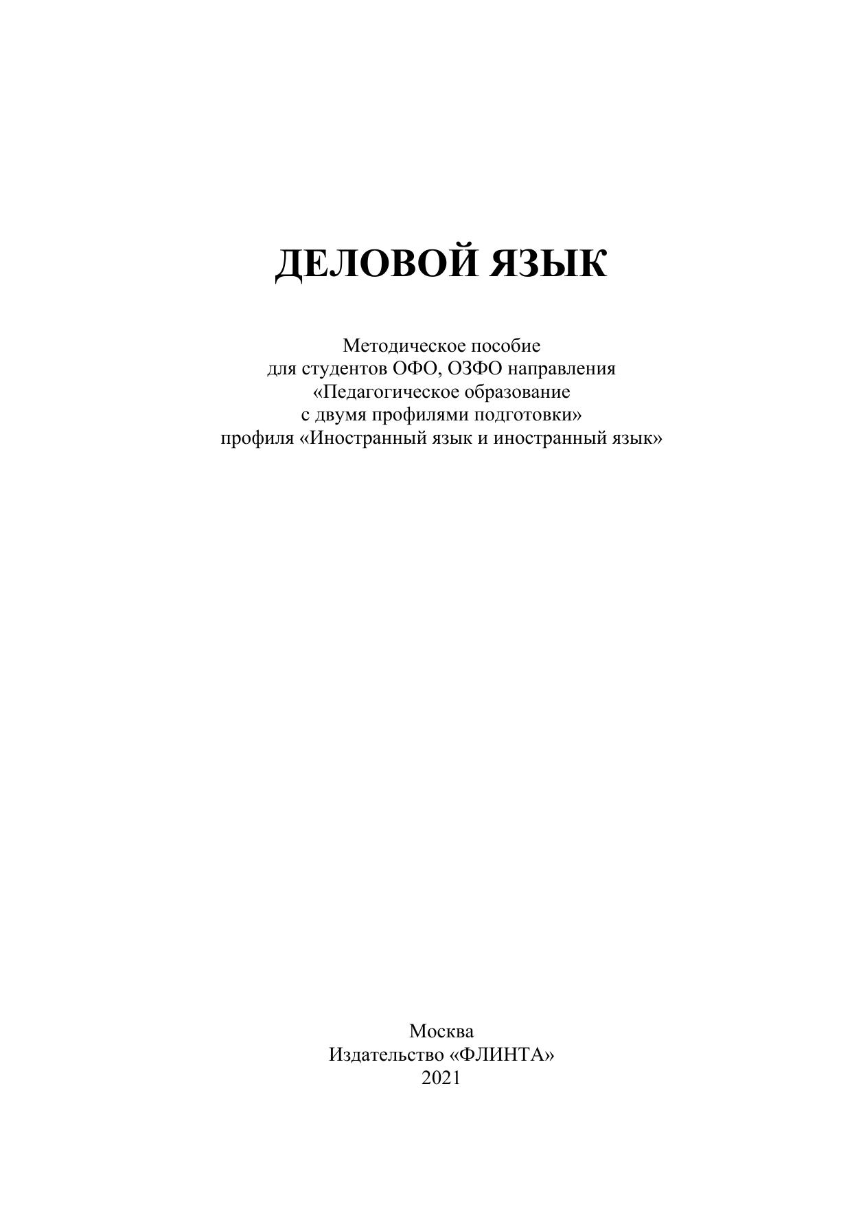 Предназначено для студентов ОФО, ОЗФО направления 44.03.05 «Педагогическое образование с двумя профилями подготовки» профиля «Иностранный язык и иностранный язык», для использования на занятиях по учебной дисциплине «Деловой язык».