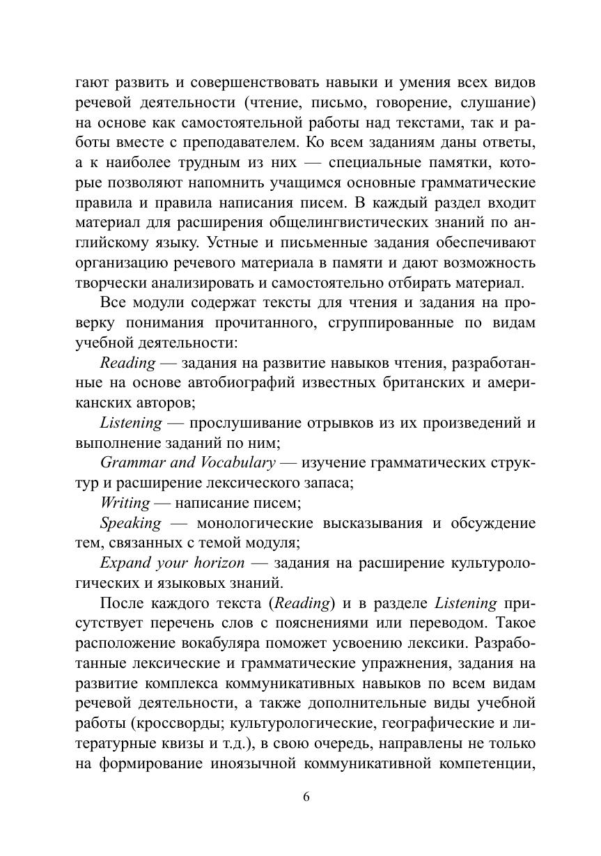 Цель пособия — развитие иноязычной коммуникативный компе-тенции, необходимой для международного взаимодействия и сотрудни-чества, освоение базовых принципов функционирования английского языка, ознакомление с новыми именами, обычаями, географическими реалиями, языковыми особенностями художественных произведений. В материал пособия входят сведения об английских и американских авторах, отрывки из произведений, а также правила организации пись-менного текста. Тексты, представленные в пособии, отражают основные принципы методической системы обучения иностранному языку — систему метода активации личности и коллектива.