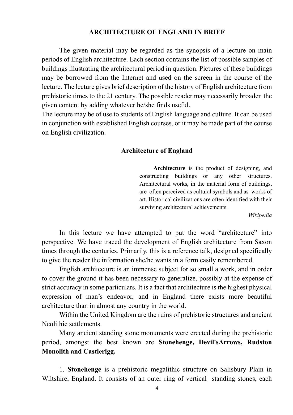 Данный материал можно рассматривать как развернутый конспект лекций по основным периодам английской архитектуры и краткой истории английской живописи и их известных представителей. Каждый раздел содержит список примеров построек, иллюстрирующих данный архитектурный период, и картин представленных художников, которые взяты из Интернета. Первая лекция содержит краткое описание истории архитектуры Англии от древнейших времен до XXI века. Вторая лекция