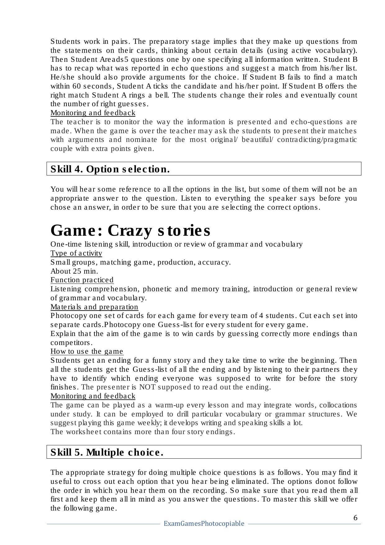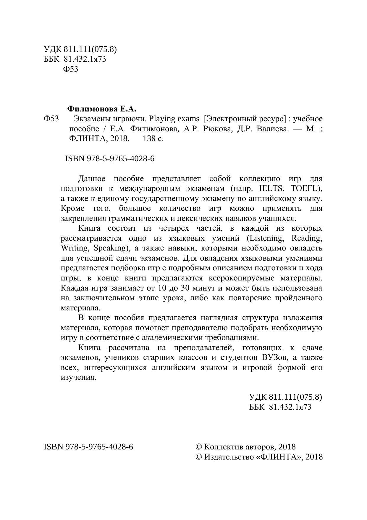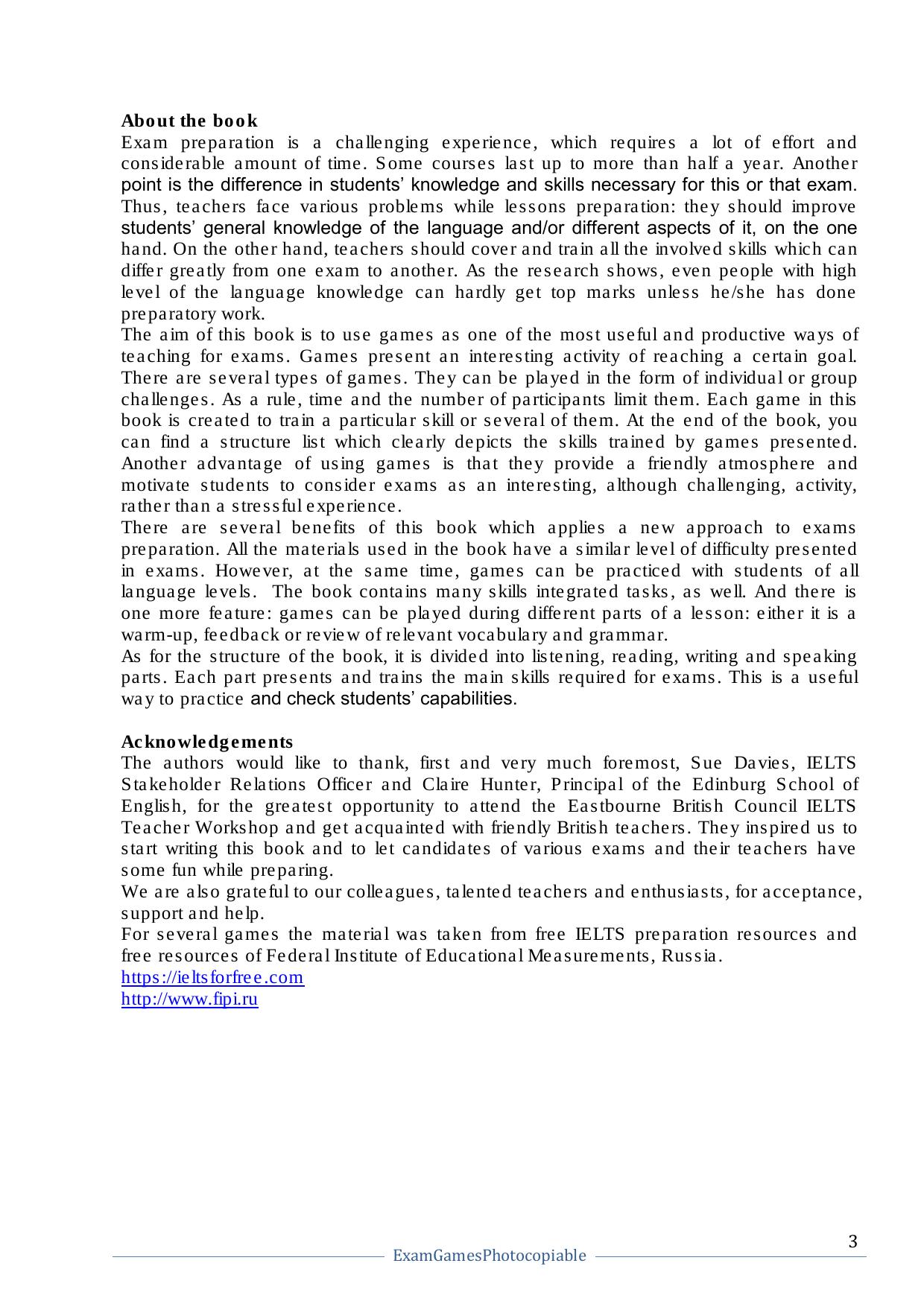 Данное пособие представляет собой коллекцию игр для подготовки к международным экзаменам (напр. IELTS, TOEFL), а также к единому государственному экзамену по английскому языку. Кроме того, большое количество игр можно применять для закрепления грамматических и лексических навыков учащихся. Книга состоит из четырех частей, в каждой из которых рассматривается одно из языковых умений (Listening, Reading, Writing, Speaking), а также навыки, которыми необходимо овладеть для успешной сдачи экзаменов. Для овладения языковыми умениями предлагается подборка игр с подробным описанием подготовки и хода игры, в конце книги предлагаются ксерокопируемые материалы. Каждая игра занимает от 10 до 30 минут и может быть использована на заключительном этапе урока, либо как повторение пройденного материала. В конце пособия предлагается наглядная структура изложения материала, которая помогает преподавателю подобрать необходимую игру в соответствие с академическими требованиями. Книга рассчитана на преподавателей, готовящих к сдаче экзаменов, учеников старших классов и студентов ВУЗов, а также всех, интересующихся английским языком и игровой формой его изучения.