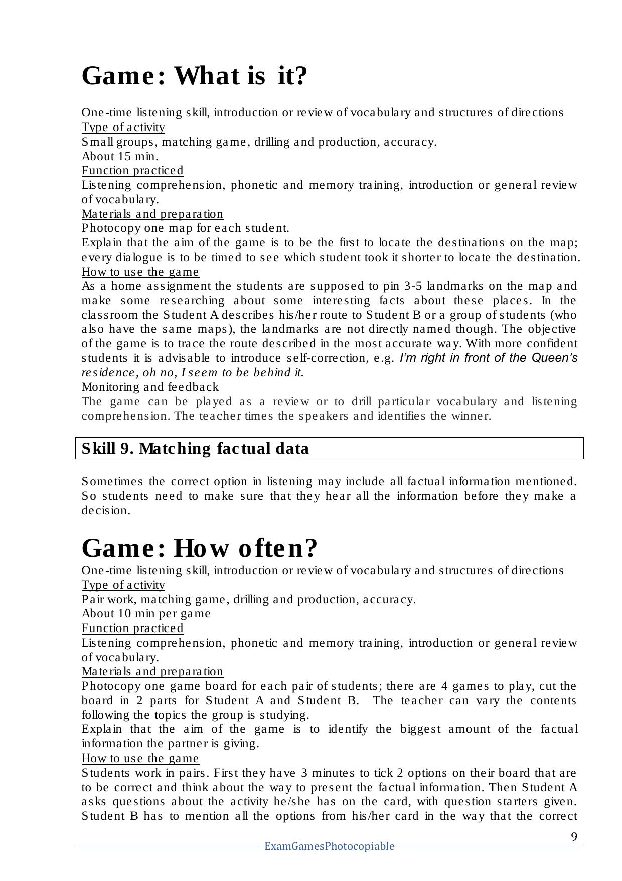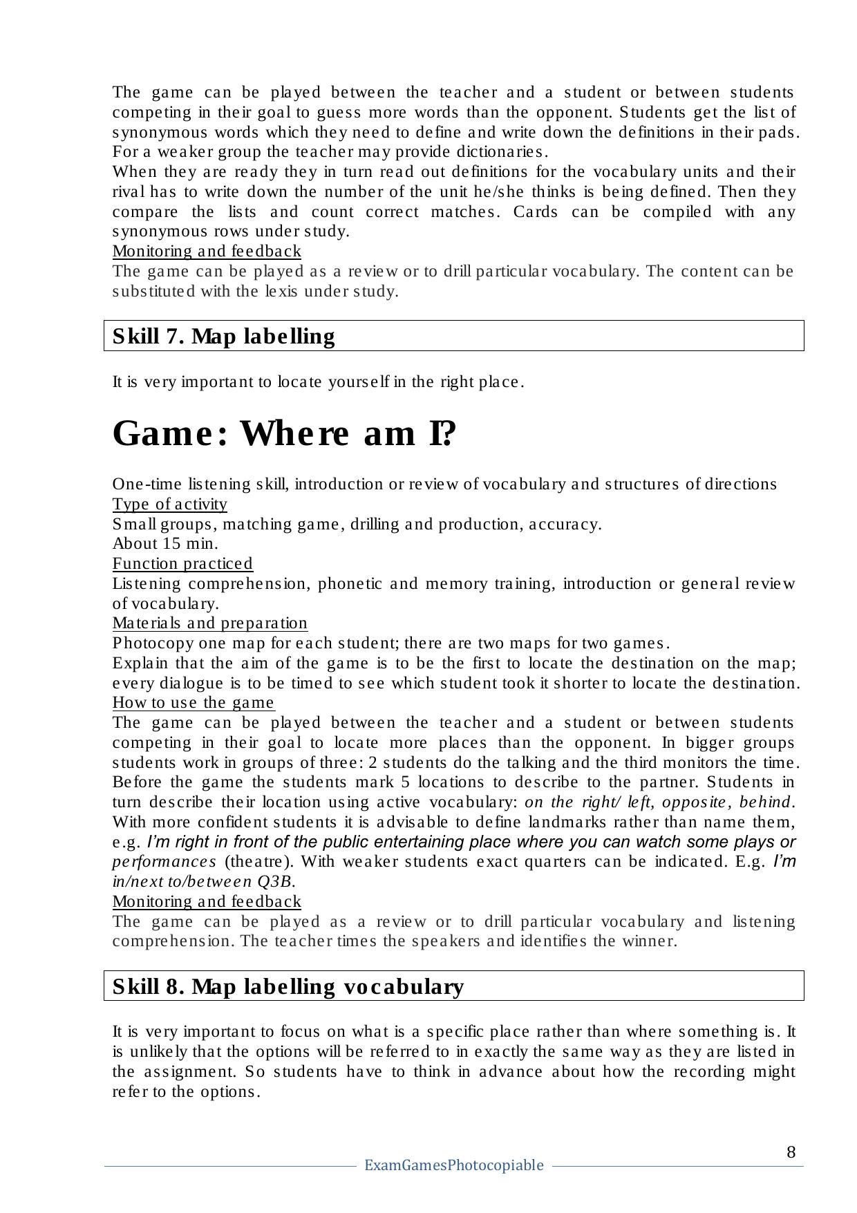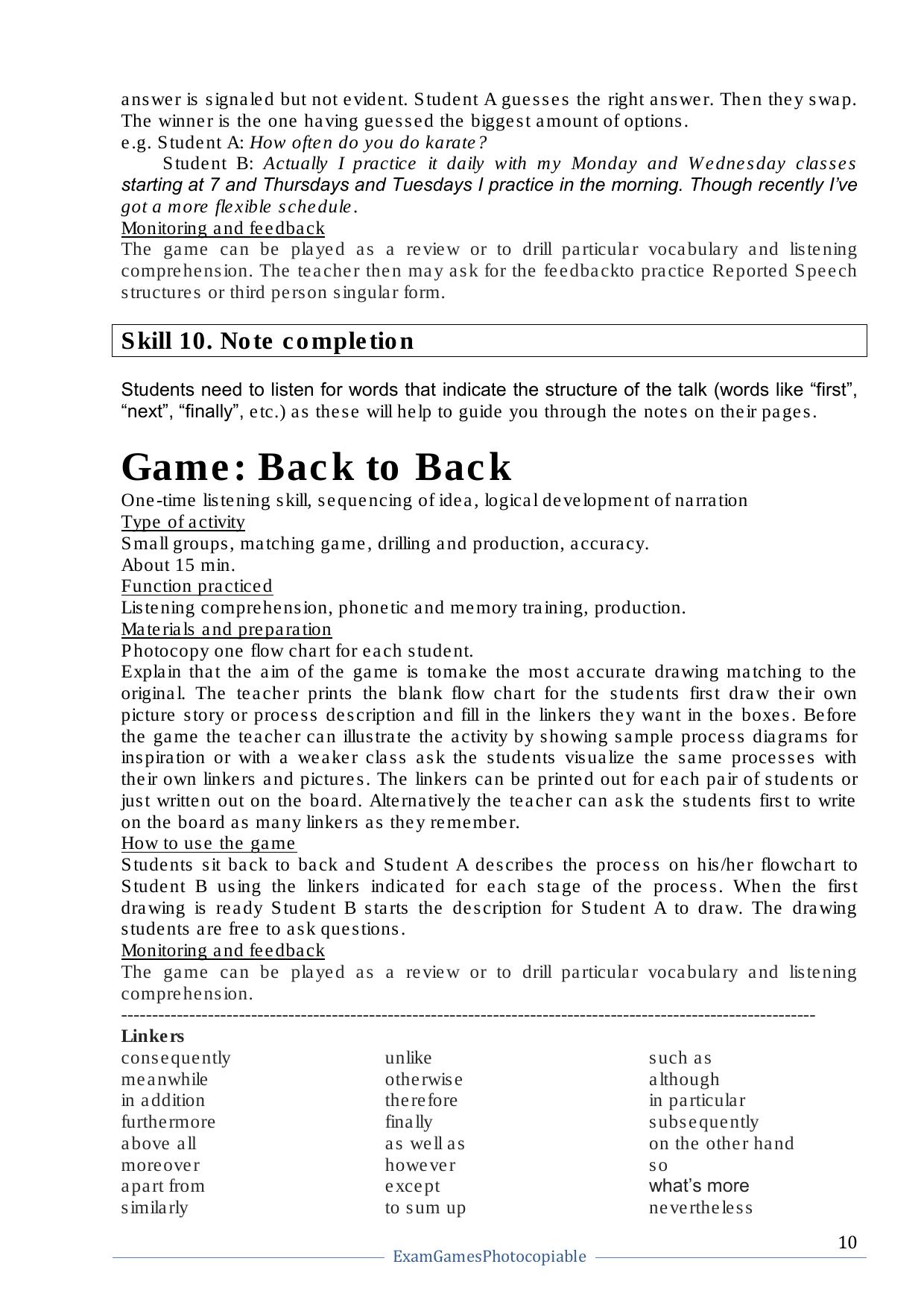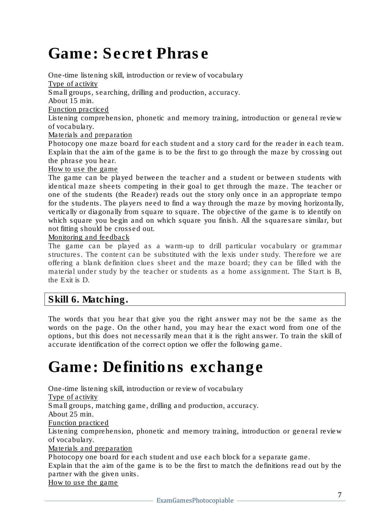 Данное пособие представляет собой коллекцию игр для подготовки к международным экзаменам (напр. IELTS, TOEFL), а также к единому государственному экзамену по английскому языку. Кроме того, большое количество игр можно применять для закрепления грамматических и лексических навыков учащихся. Книга состоит из четырех частей, в каждой из которых рассматривается одно из языковых умений (Listening, Reading, Writing, Speaking), а также навыки, которыми необходимо овладеть для успешной сдачи экзаменов. Для овладения языковыми умениями предлагается подборка игр с подробным описанием подготовки и хода игры, в конце книги предлагаются ксерокопируемые материалы. Каждая игра занимает от 10 до 30 минут и может быть использована на заключительном этапе урока, либо как повторение пройденного материала. В конце пособия предлагается наглядная структура изложения материала, которая помогает преподавателю подобрать необходимую игру в соответствие с академическими требованиями. Книга рассчитана на преподавателей, готовящих к сдаче экзаменов, учеников старших классов и студентов ВУЗов, а также всех, интересующихся английским языком и игровой формой его изучения.