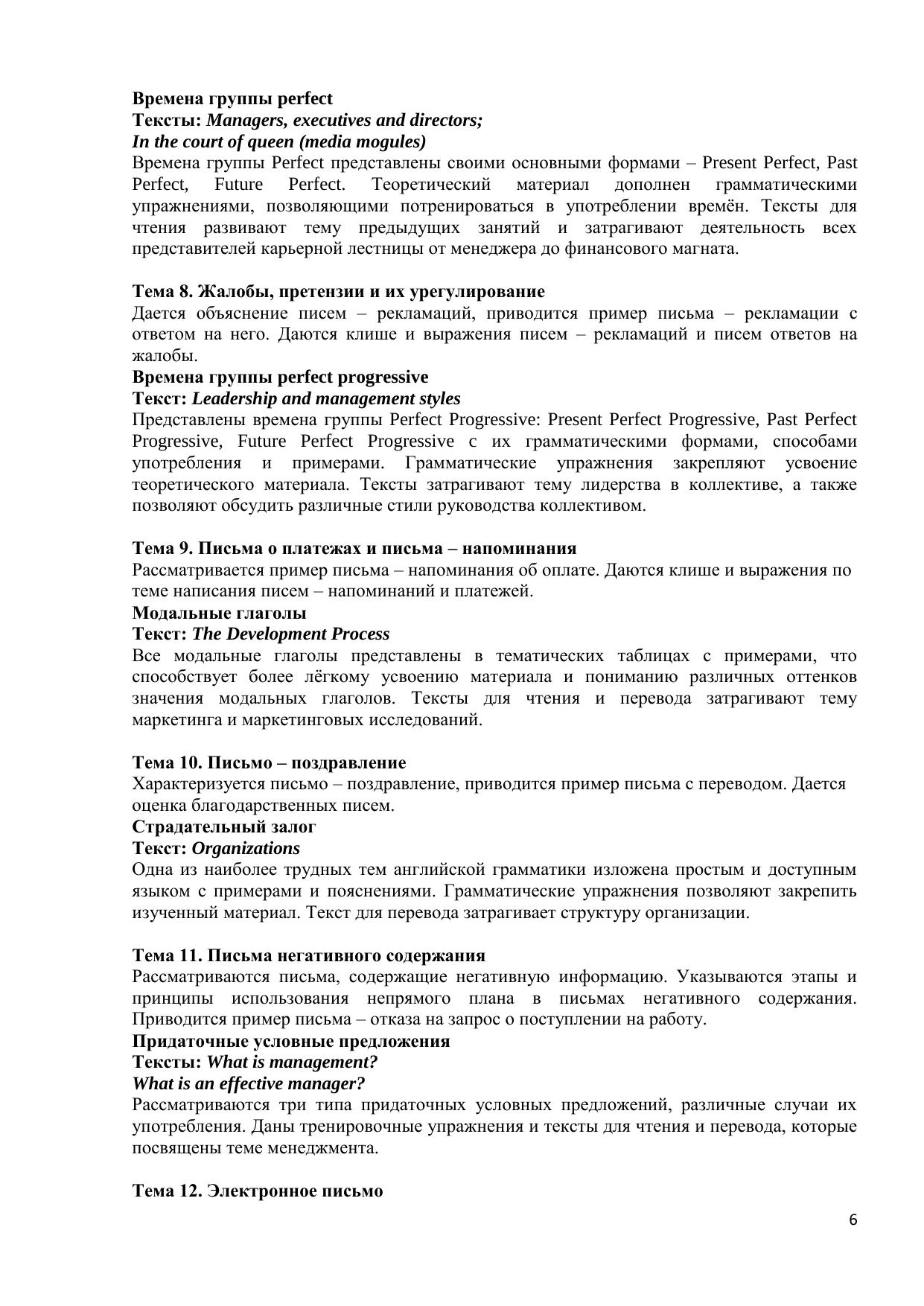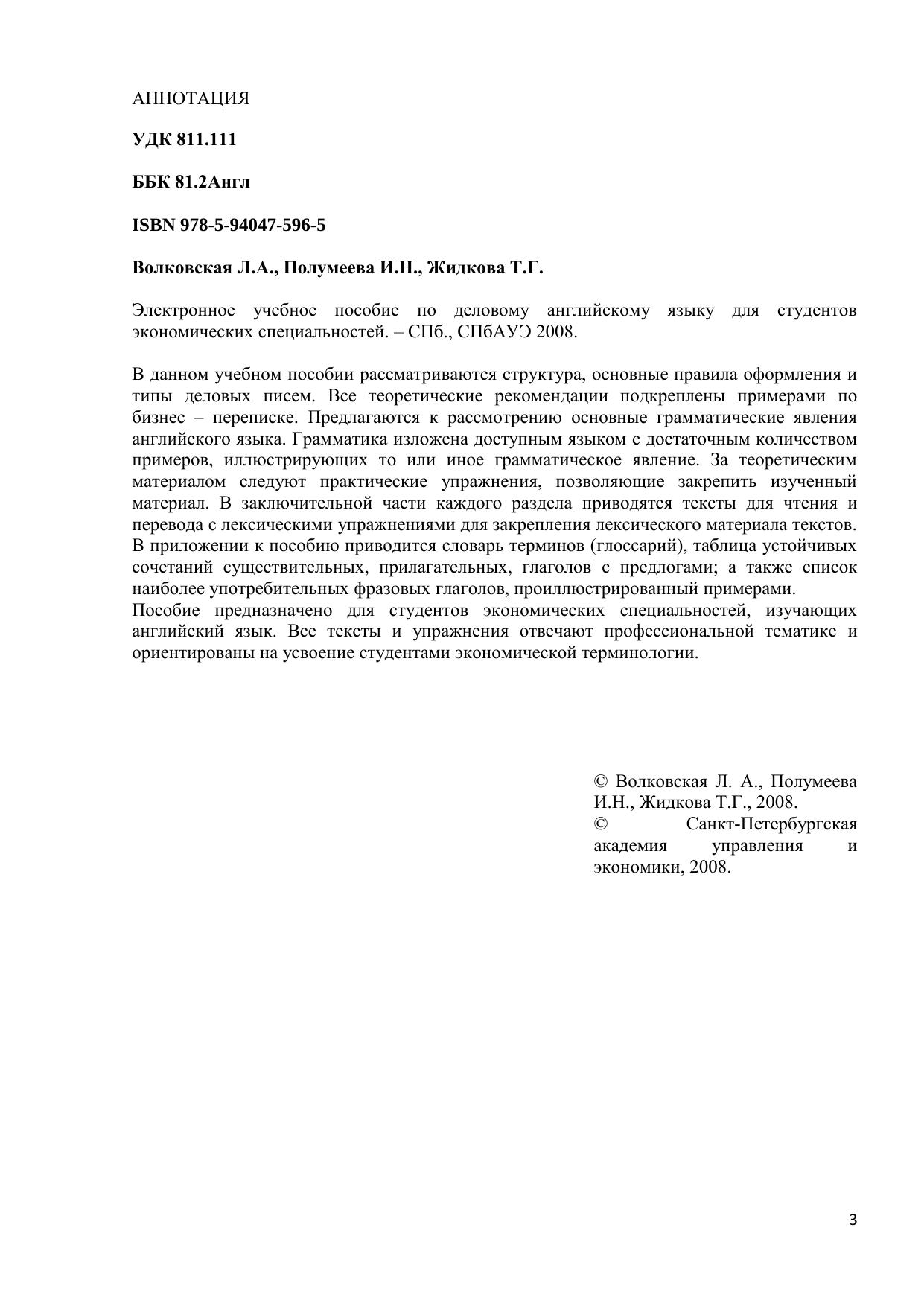 В данном учебном пособии рассматриваются структура, основные правила оформления и типы деловых писем. Все теоретические рекомендации подкреплены примерами по бизнес – переписке. Предлагаются к рассмотрению основные грамматические явления английского языка. Грамматика изложена доступным языком с достаточным количеством примеров, иллюстрирующих то или иное грамматическое явление. За теоретическим материалом следуют практические упражнения, позволяющие закрепить изученный материал. В заключительной части каждого раздела приводятся тексты для чтения и перевода с лексическими упражнениями для закрепления лексического материала текстов. В приложении к пособию приводится словарь терминов (глоссарий), таблица устойчивых сочетаний существительных, прилагательных, глаголов с предлогами, а также список наиболее употребительных фразовых глаголов, проиллюстрированный примерами. Пособие предназначено для студентов экономических специальностей, изучающих английский язык. Все тексты и упражнения отвечают профессиональной тематике и ориентированы на усвоение студентами экономической терминологии. Электронное учебное пособие для дистанционного обучения