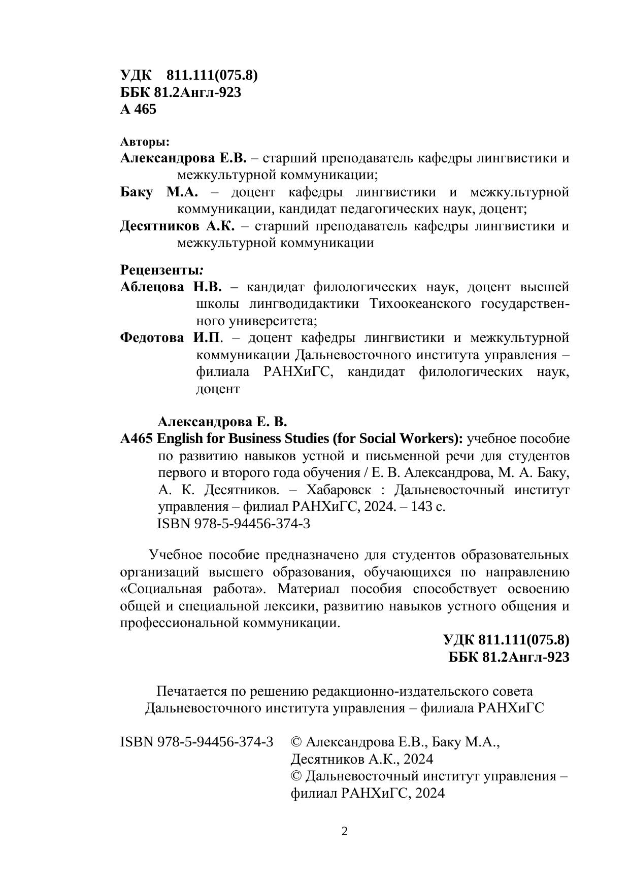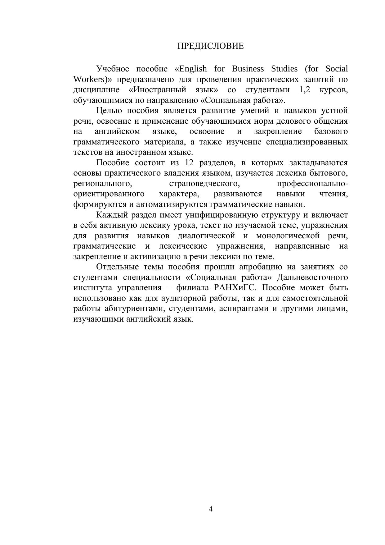 Учебное пособие предназначено для студентов образовательных организаций высшего образования, обучающихся по направлению «Социальная работа». Материал пособия способствует освоению общей и специальной лексики, развитию навыков устного общения и профессиональной коммуникации.