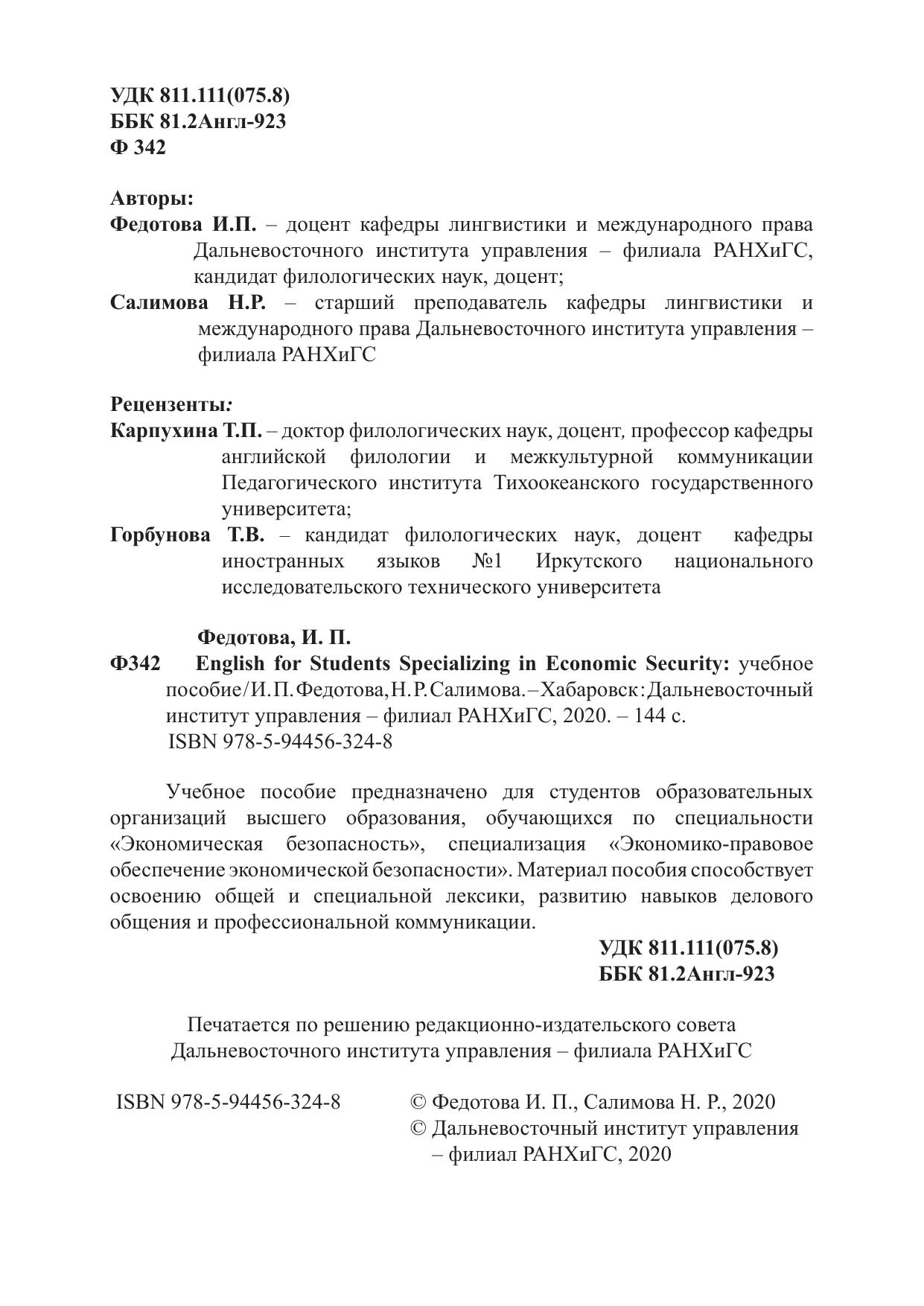 Учебное пособие предназначено для студентов образовательных организаций высшего образования, обучающихся по специальности «Экономическая безопасность», специализация «Экономико-правовое обеспечение экономической безопасности». Материал пособия способствует освоению общей и специальной лексики, развитию навыков делового общения и профессиональной коммуникации.