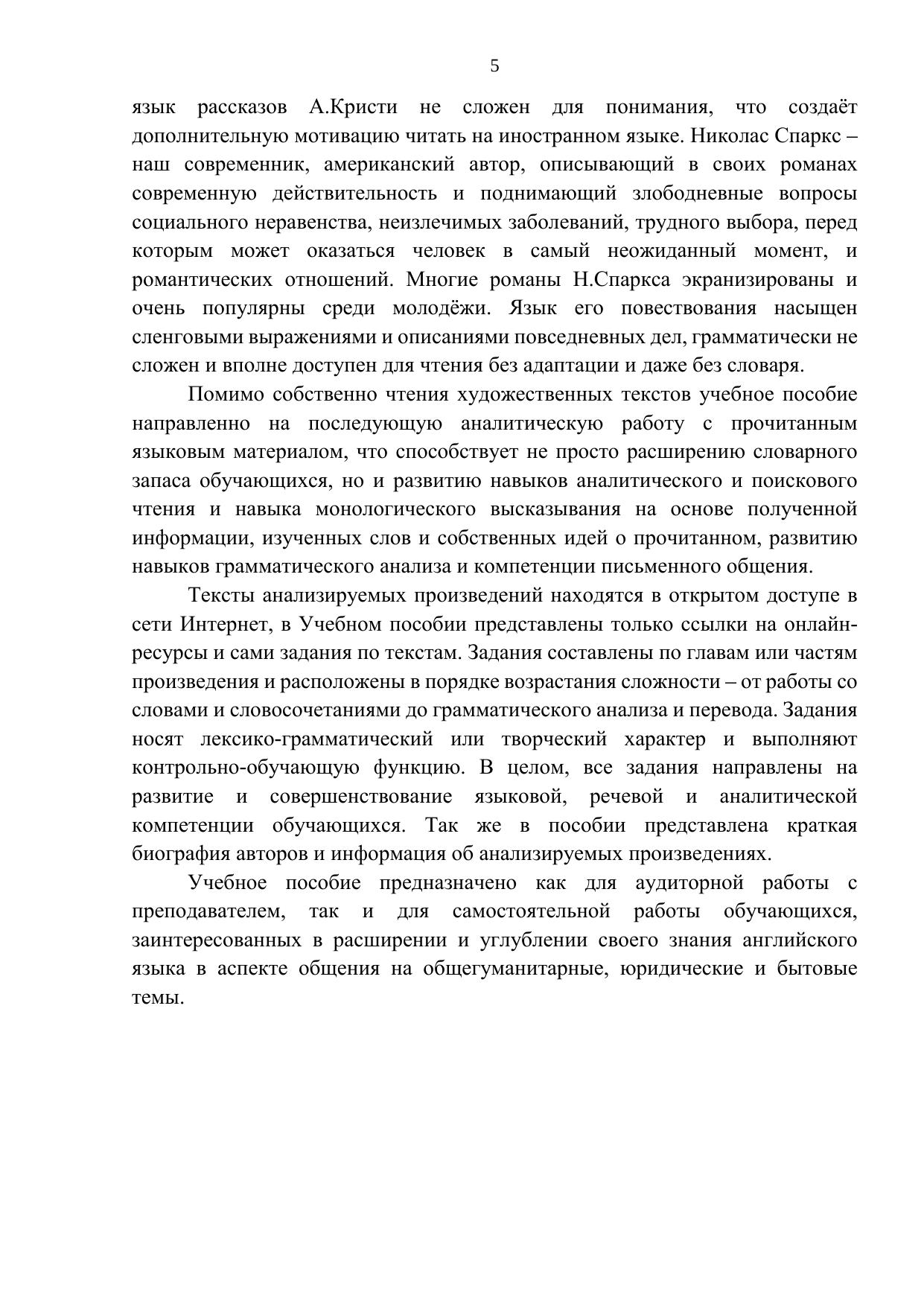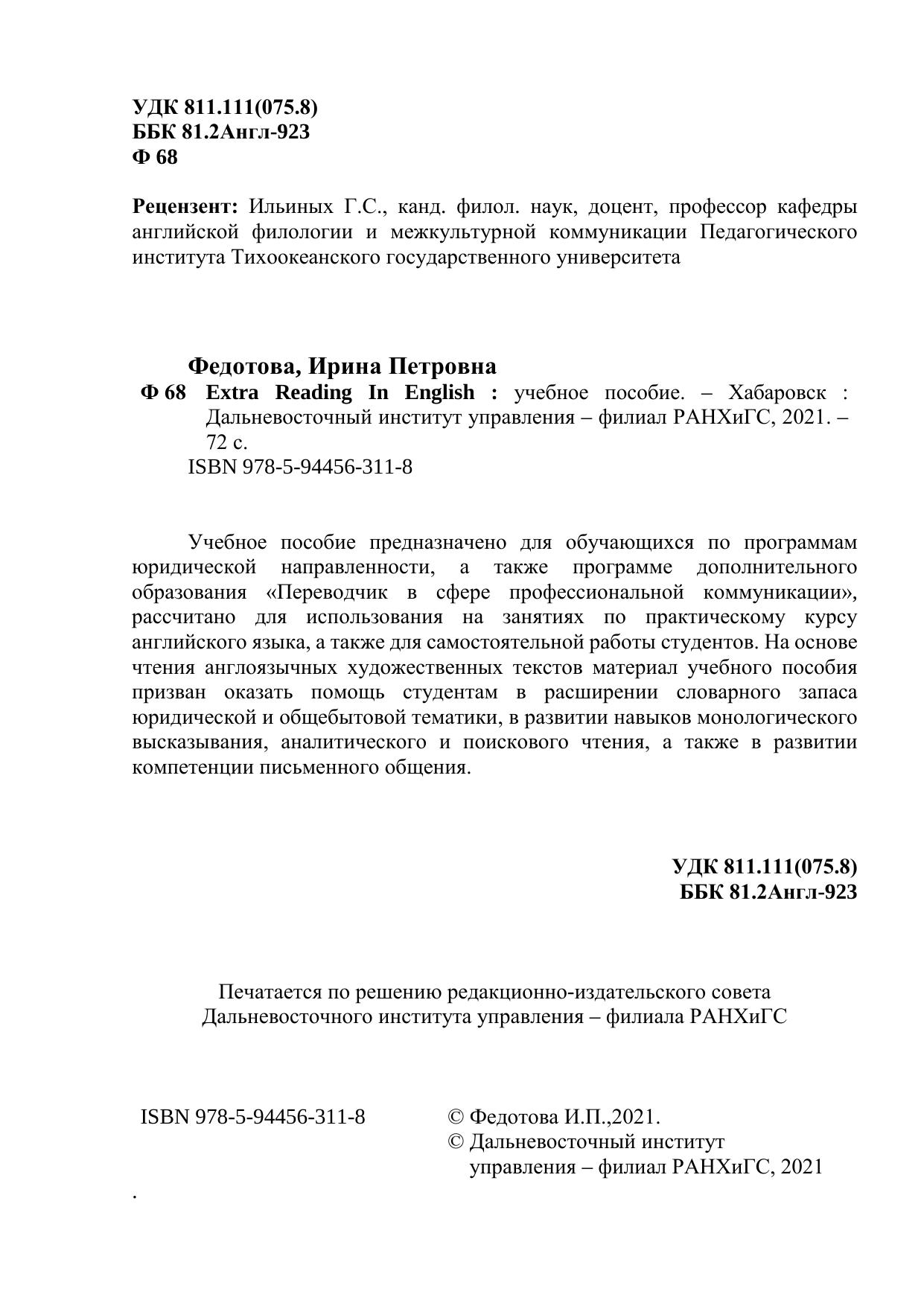 Учебное пособие предназначено для обучающихся по программам юридической направленности, а также программе дополнительного образования «Переводчик в сфере профессиональной коммуникации», рассчитано для использования на занятиях по практическому курсу английского языка, а также для самостоятельной работы студентов. На основе чтения англоязычных художественных текстов материал учебного пособия призван оказать помощь студентам в расширении словарного запаса юридической и общебытовой тематики, в развитии навыков монологического высказывания, аналитического и поискового чтения, а также в развитии компетенции письменного общения.