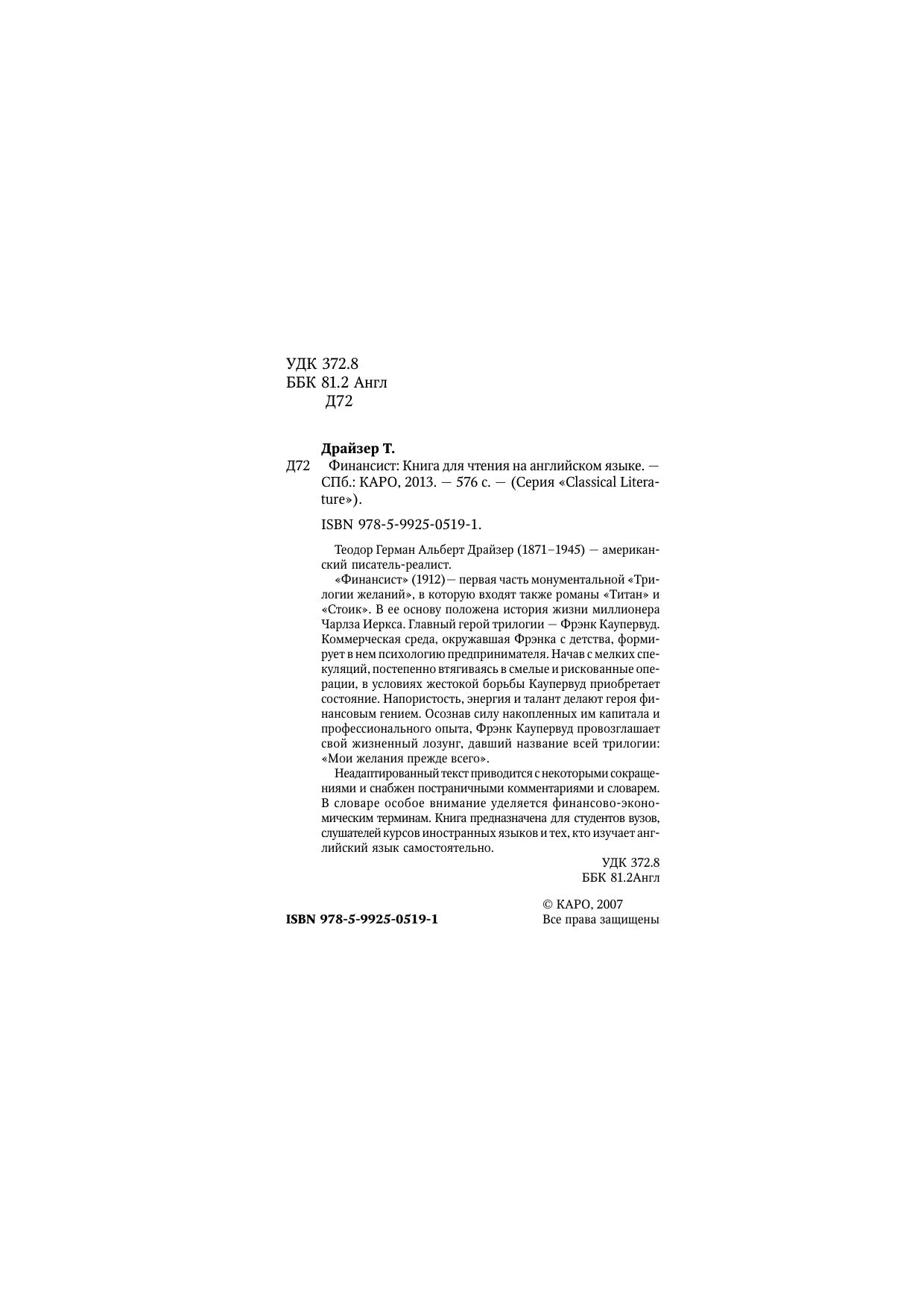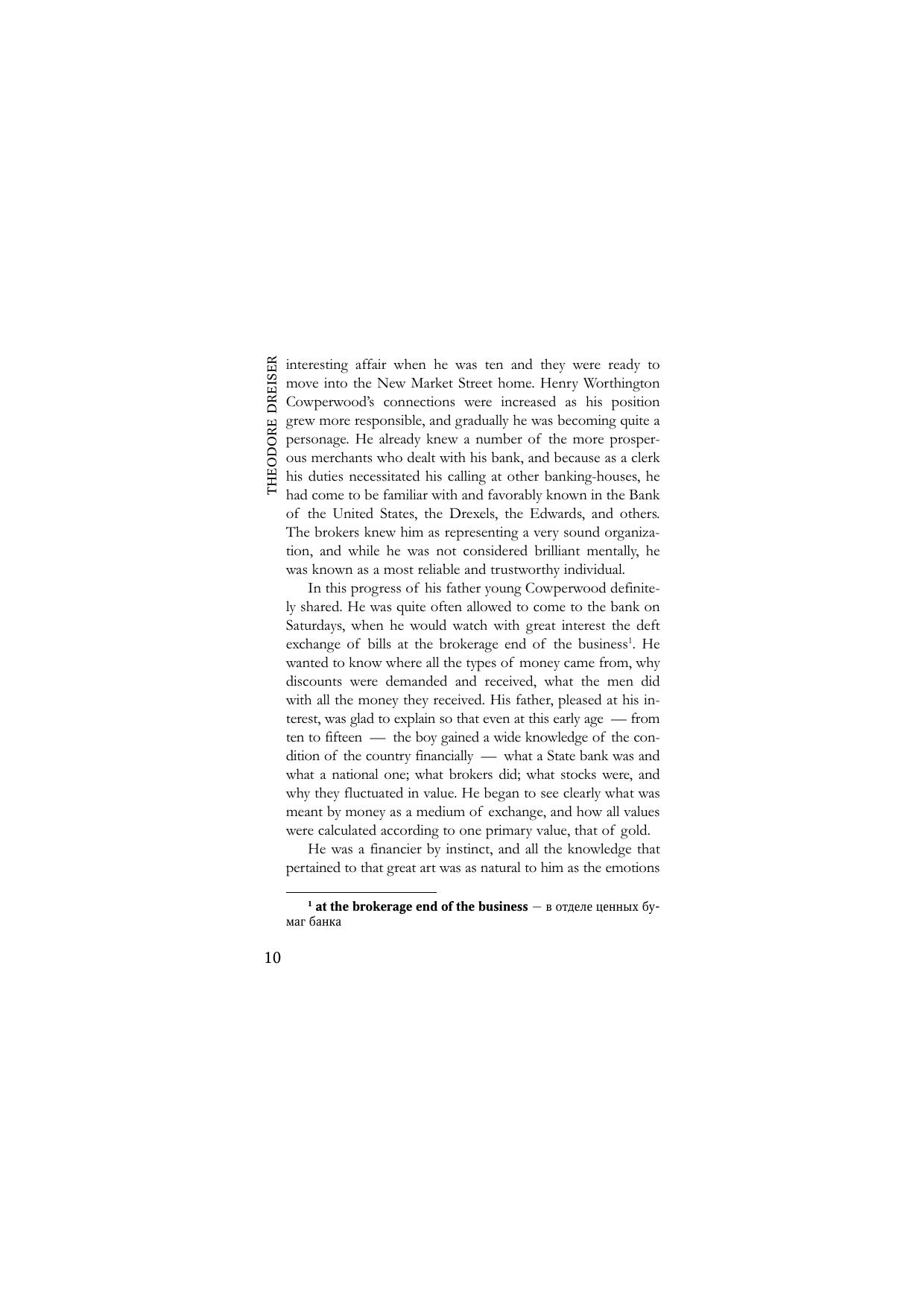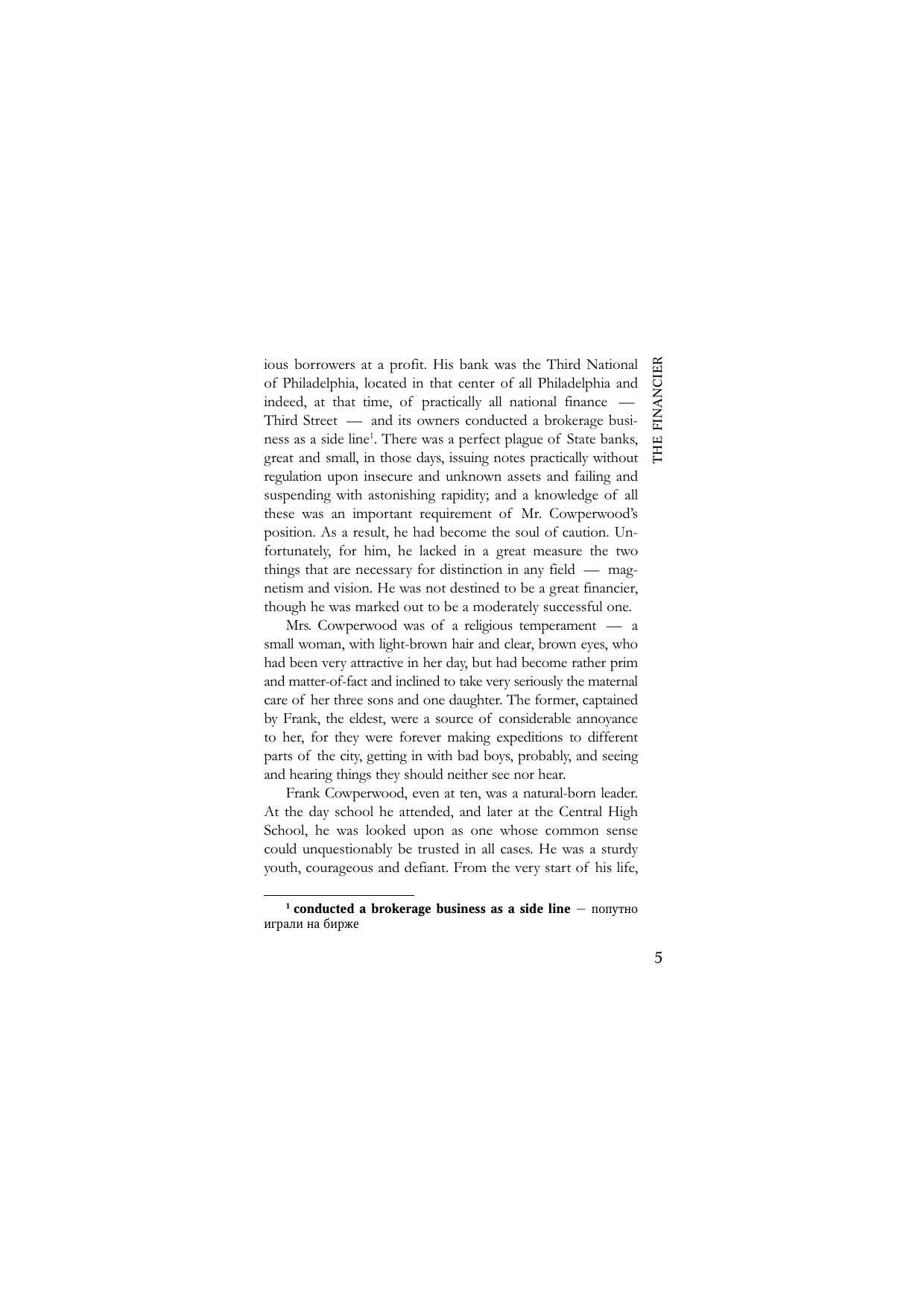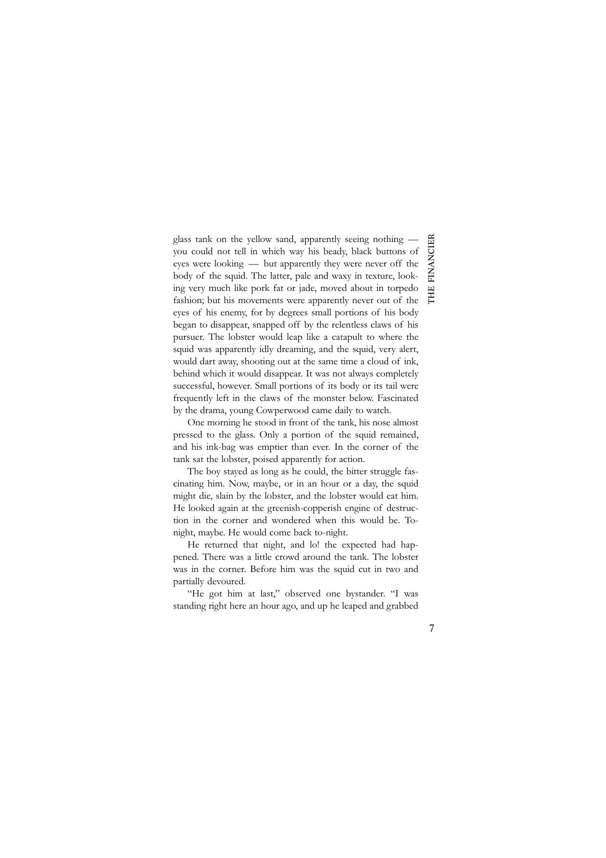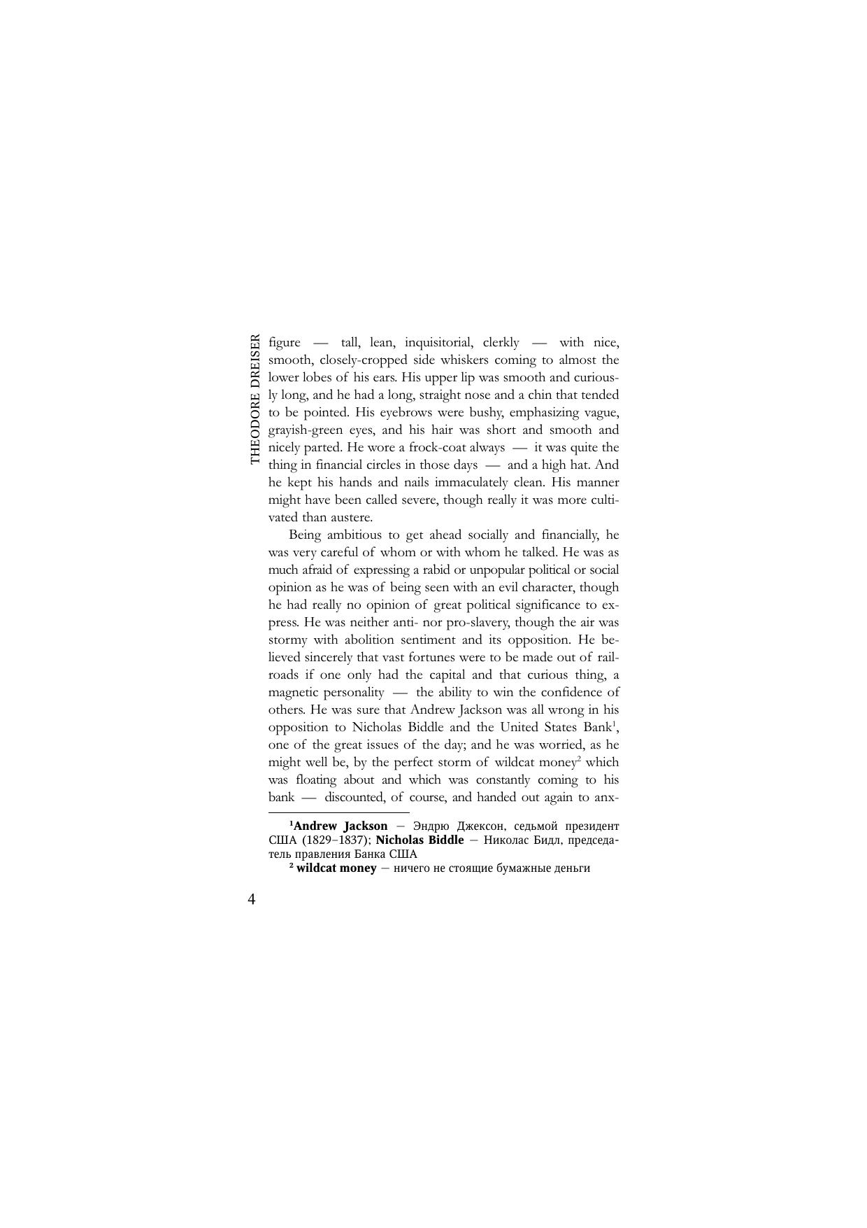 «Финансист» (1912)— первая часть монументальной «Трилогии желаний», в которую входят также романы «Титан» и «Стоик». В ее основу положена история жизни миллионера Чарлза Иеркса. Главный герой трилогии — Фрэнк Каупервуд. Коммерческая среда, окружавшая Фрэнка с детства, формирует в нем психологию предпринимателя. Начав с мелких спекуляций, постепенно втягиваясь в смелые и рискованные операции, в условиях жестокой борьбы Каупервуд приобретает состояние. Напористость, энергия и талант делают героя финансовым гением. Осознав силу накопленных им капитала и профессионального опыта, Фрэнк Каупервуд провозглашает свой жизненный лозунг, давший название всей трилогии: «Мои желания прежде всего».