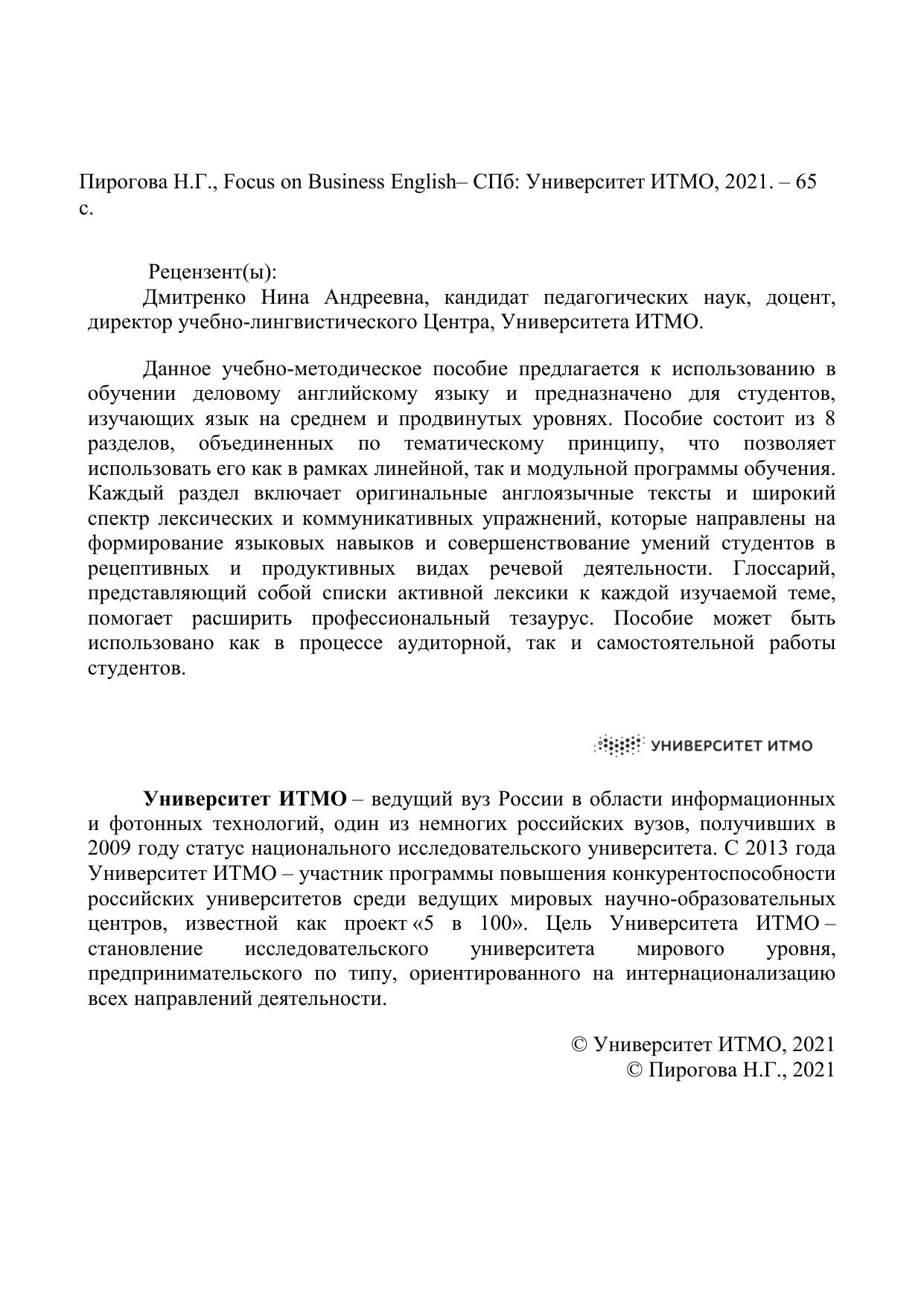 Данное учебно-методическое пособие предлагается к использованию в обучении деловому английскому языку и предназначено для студентов, изучающих язык на среднем и продвинутых уровнях. Пособие состоит из 8 разделов, объединенных по тематическому принципу, что позволяет использовать его как в рамках линейной, так и модульной программы обучения. Каждый раздел включает оригинальные англоязычные тексты и широкий спектр лексических и коммуникативных упражнений, которые направлены на формирование языковых навыков и совершенствование умений студентов в рецептивных и продуктивных видах речевой деятельности. Глоссарий, представляющий собой списки активной лексики к каждой изучаемой теме, помогает расширить профессиональный тезаурус. Пособие может быть использовано как в процессе аудиторной, так и самостоятельной работы студентов.
