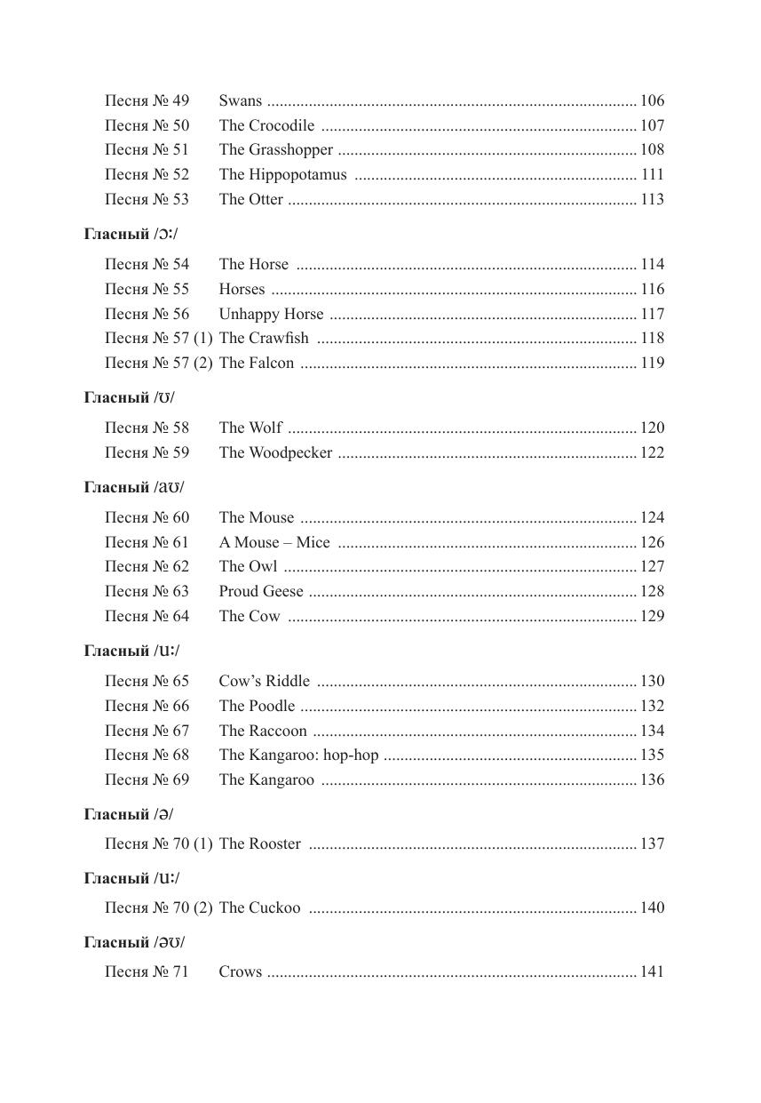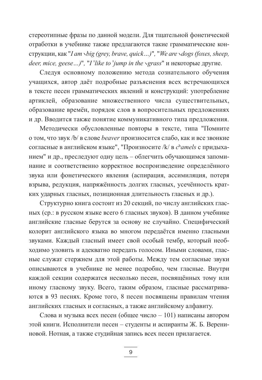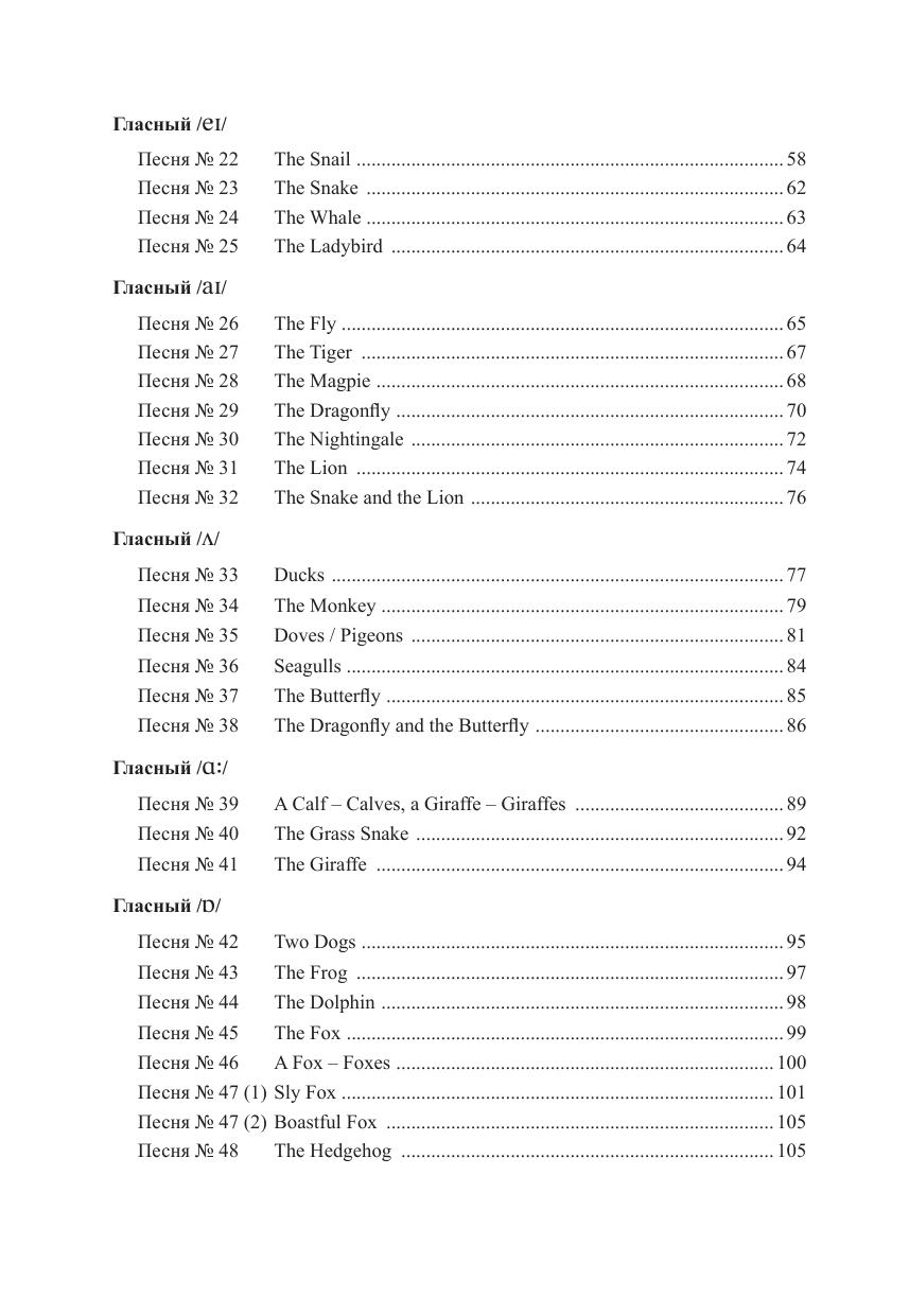 и дошкольных учреждениях. Для начинающих изучать английский язык предлагается разъяснение и всех встречающихся в учебнике грамматических явлений. С целью облегчить обучающимся запоминание правил чтения английских гласных и согласных автор книги прилагает записанные учебные песни (8). Выбор тематики основных обучающих песен (их всего 93) – домашние и дикие животные – обусловлен тем, что учебник предназначен и для работы с детьми, которые, как известно, проявляют особый интерес к окружающему их миру. Слова и музыка всех песен написаны автором книги, филологом и композитором, Ж. Б. Верениновой.
