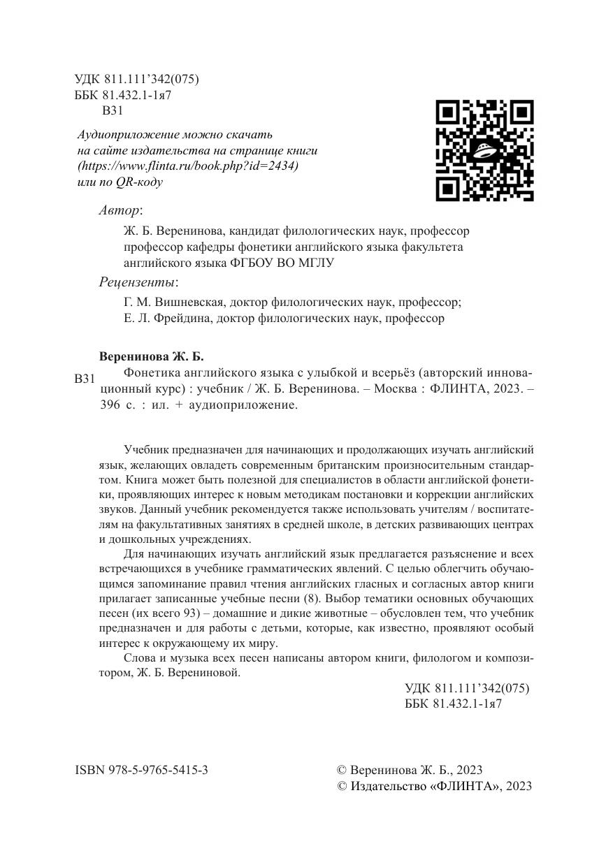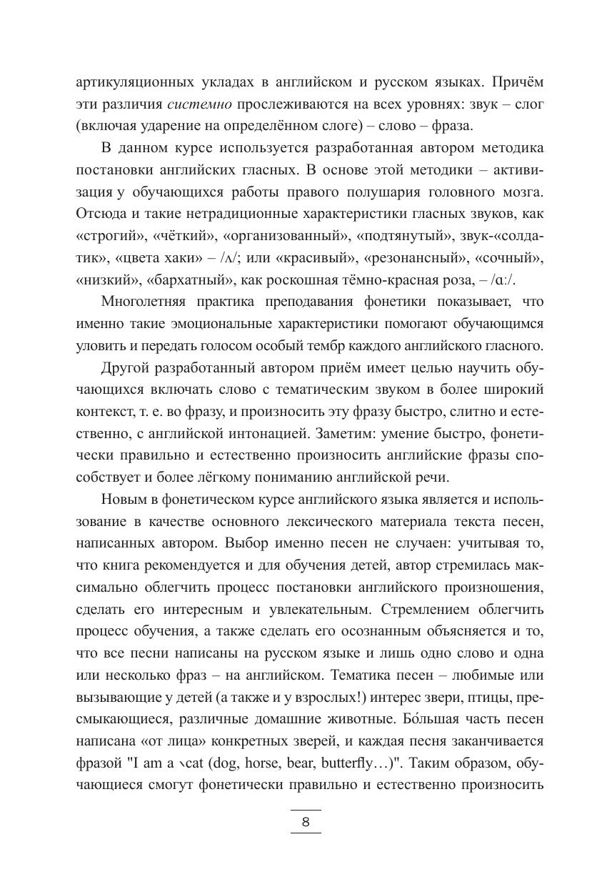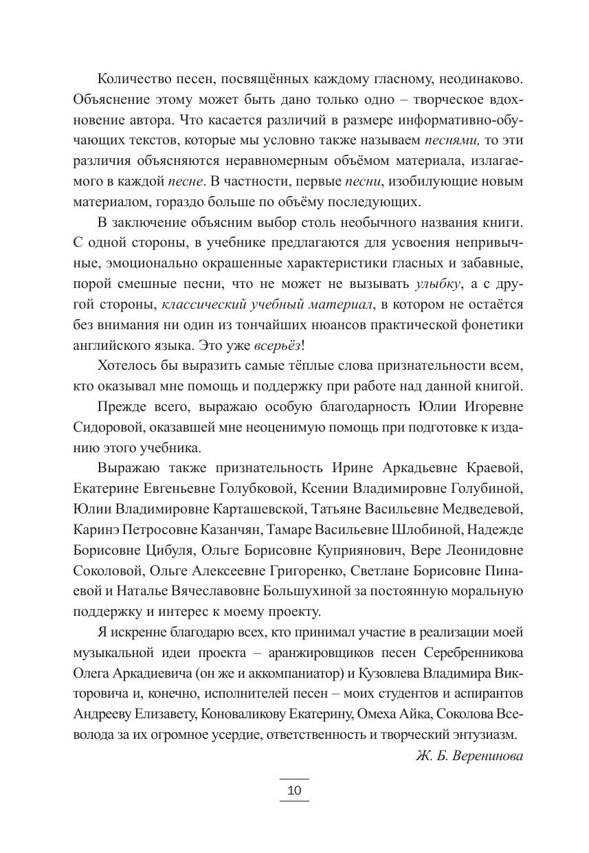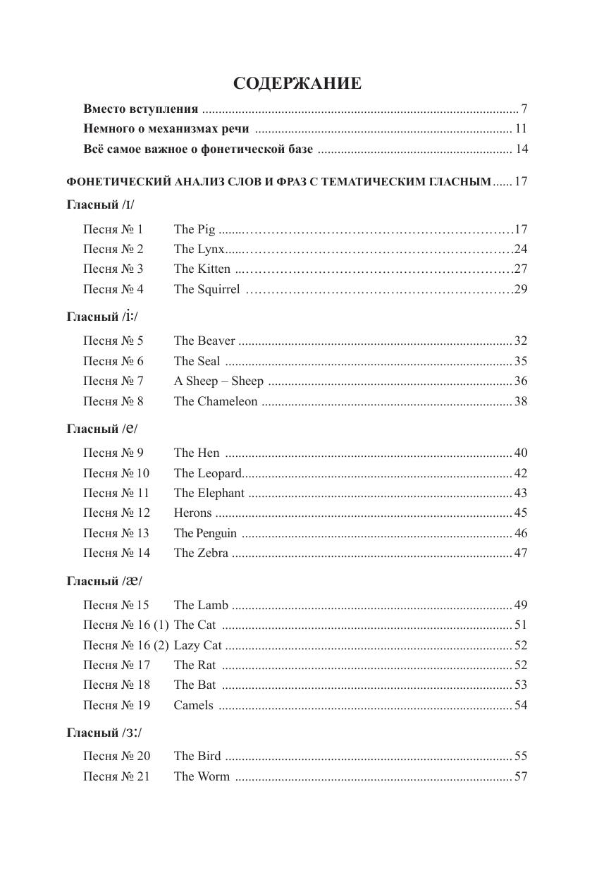 и дошкольных учреждениях. Для начинающих изучать английский язык предлагается разъяснение и всех встречающихся в учебнике грамматических явлений. С целью облегчить обучающимся запоминание правил чтения английских гласных и согласных автор книги прилагает записанные учебные песни (8). Выбор тематики основных обучающих песен (их всего 93) – домашние и дикие животные – обусловлен тем, что учебник предназначен и для работы с детьми, которые, как известно, проявляют особый интерес к окружающему их миру. Слова и музыка всех песен написаны автором книги, филологом и композитором, Ж. Б. Верениновой.